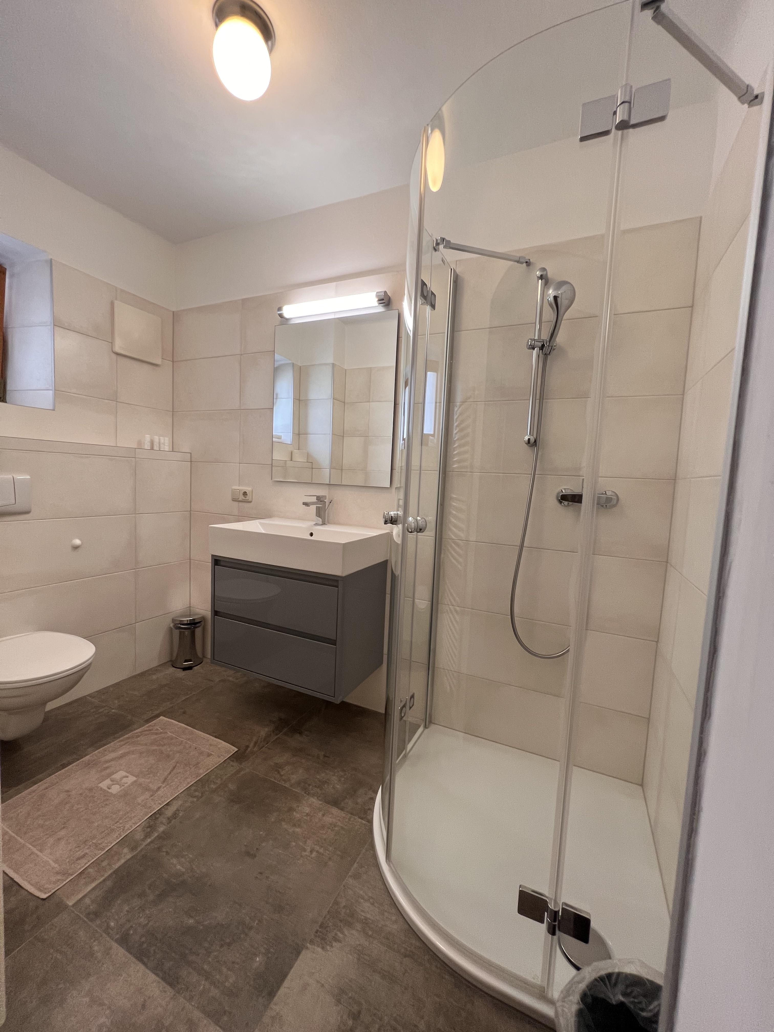 • 1 Badezimmer mit Dusche, WC, Handtuchtrockner und Haarföhn