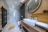 • Badezimmer mit Walk-in Dusche und WC, Handtuchtrockner und Haarföhn