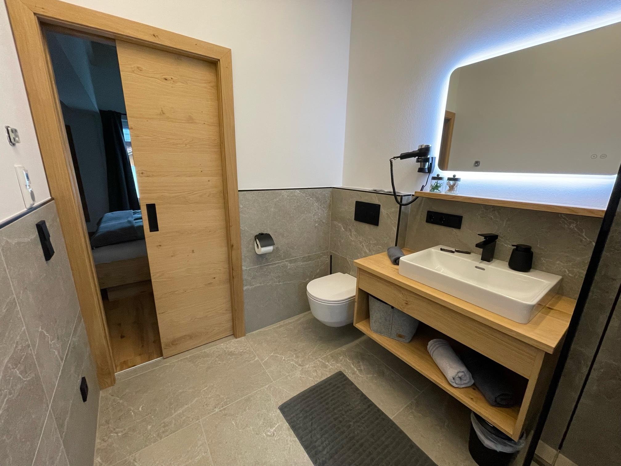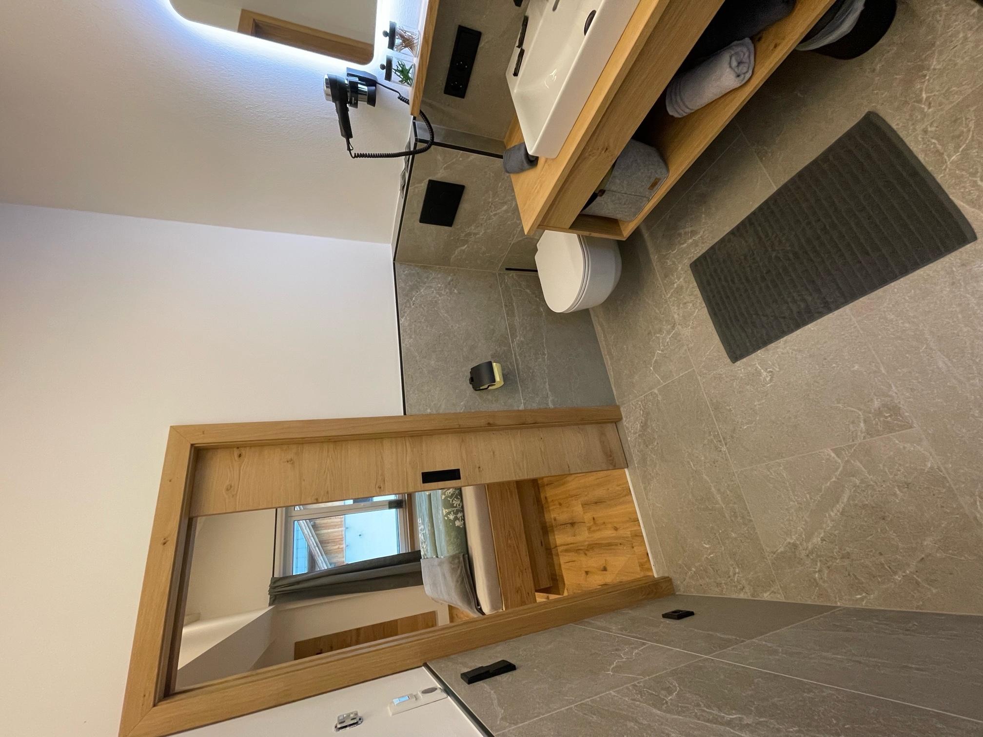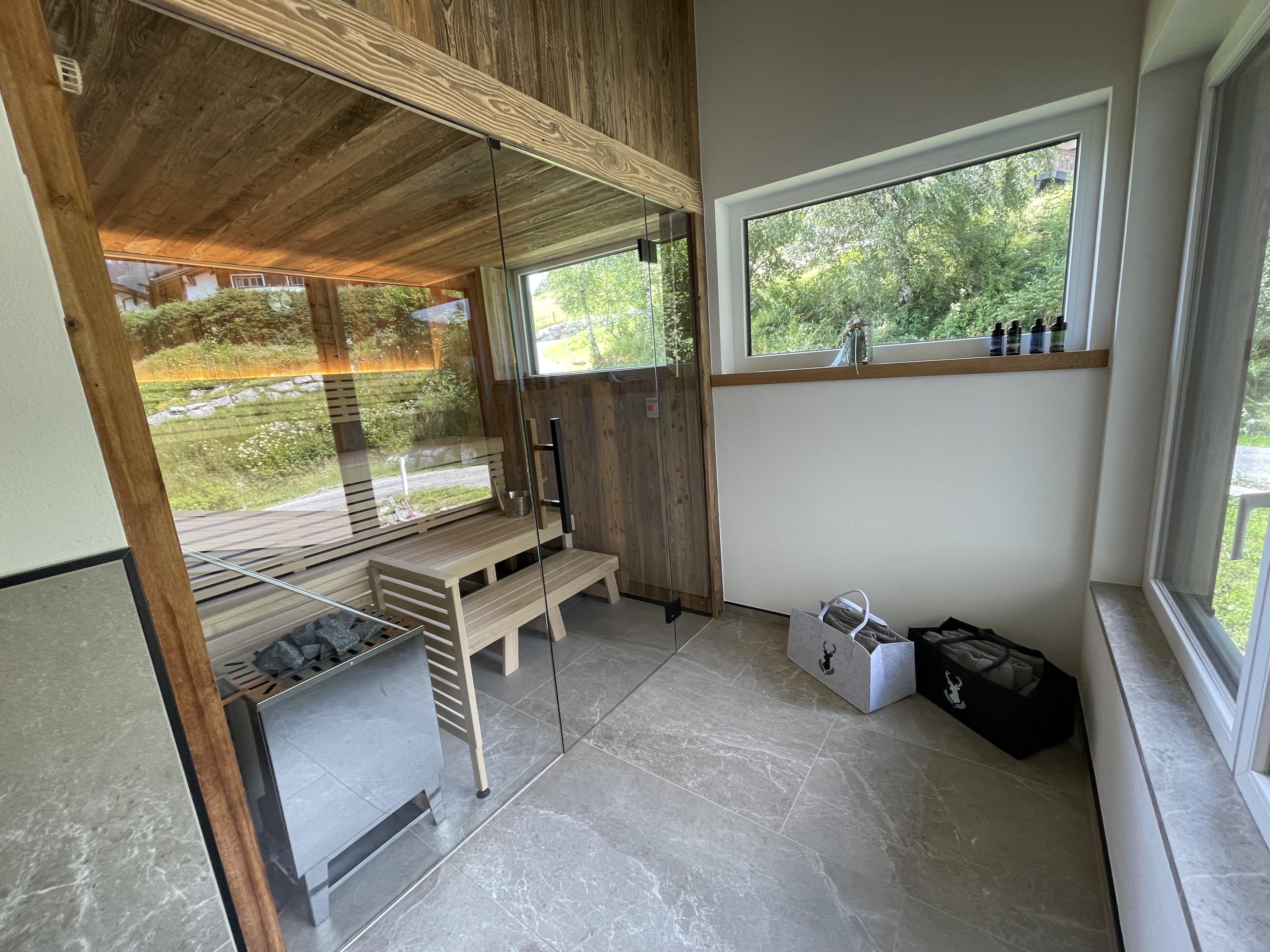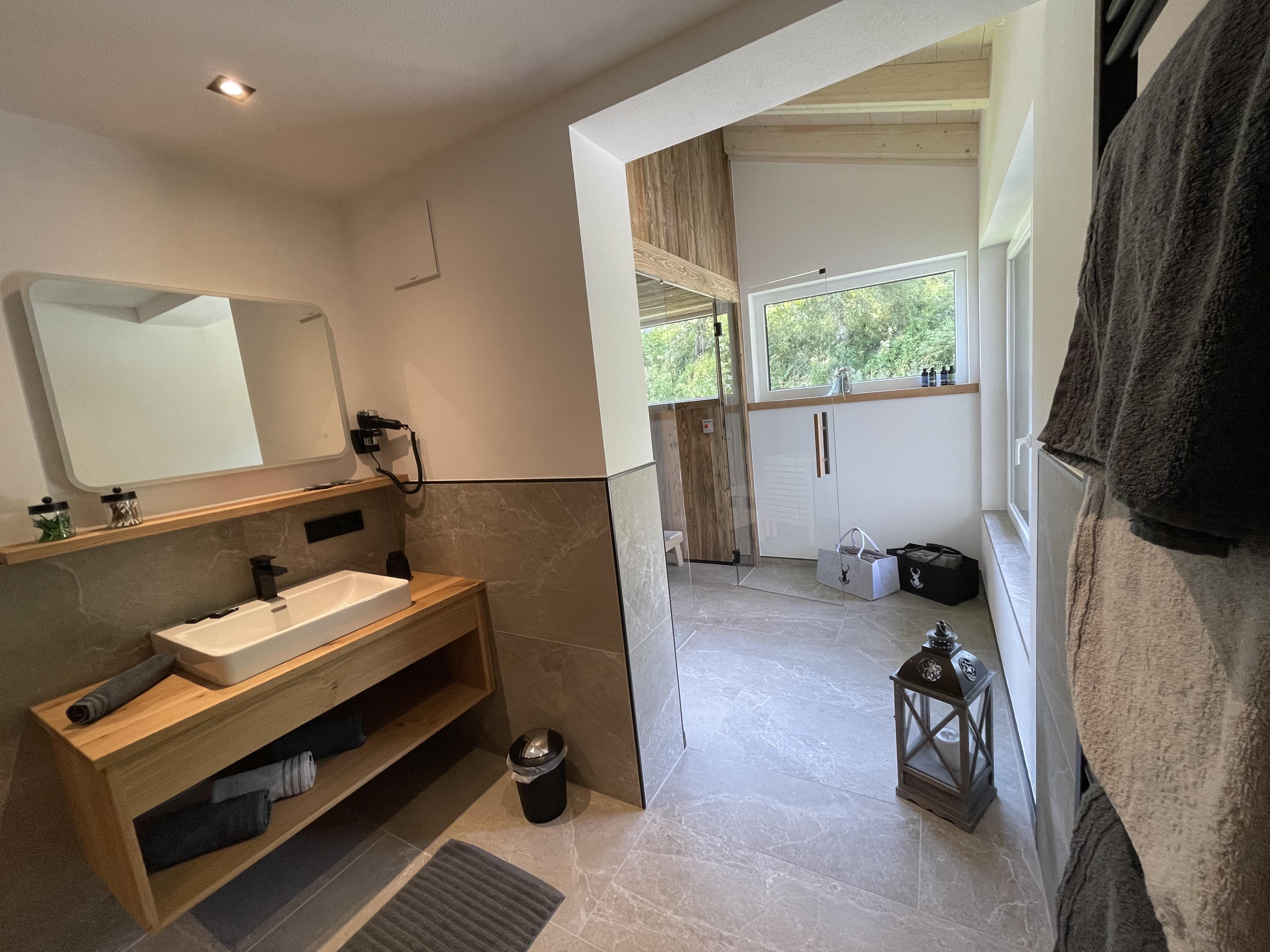 Das 1. Schlafzimmer bietet ein Bad-en Suite mit sichtbaren Dachstuhl. Das 2. Schlafzimmer hat ein extra Bad, von dem man in die Sauna gelangt mit Blick auf die Hinterthaler Berge.
