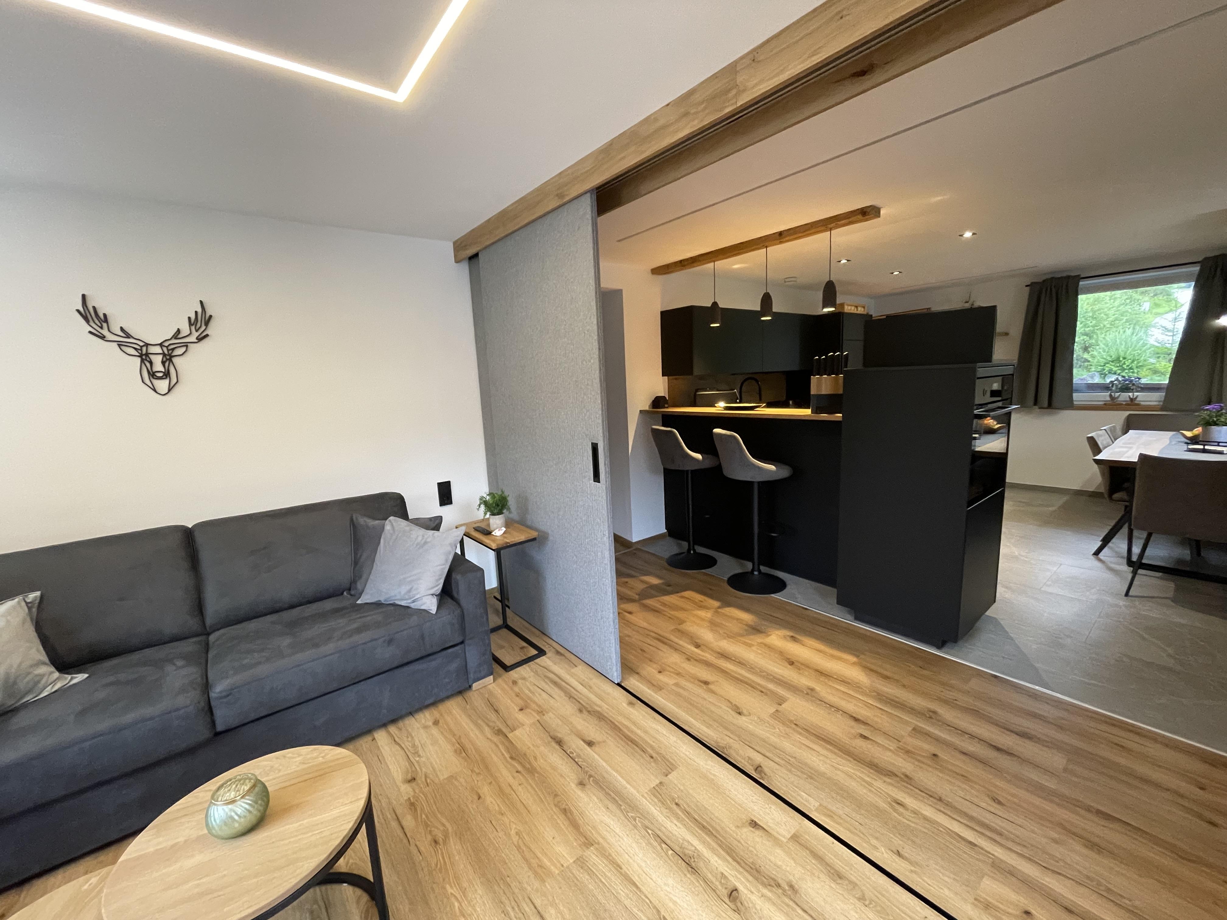 Kernsanierte 95m2 grosse Ferienwohnung mit 2 Schlafzimmern und 1 Schlafcouch. Es befindet sich überall eine Fussbodenheizung und kostenloses W-Lan steht zur Verfügung. Offener Ess-und Wohnbereich mit sehr hochwertiger Küche.