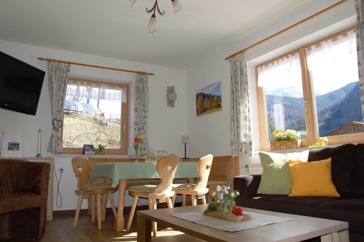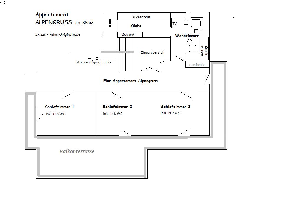 Die Wohung Alpengruss ist aufgrund Ihrer Größe von beinahe 90m2 ideal für Großfamilien oder Reisen mit Freunden & Bekannten. Sie verfügt über eine gut ausgestattet Küche sowie einem gemütlichen Wohnzimmer. 3 Schlafzimmer mit DU/WC und ebenfalls TV ergänzen das Angebot. Genießen Sie wunderbare Sommerabende auf der Sonnenterrasse mit Bergpanorama. Sie ist mit Essplatz und zwei Liegen ausgestattet.