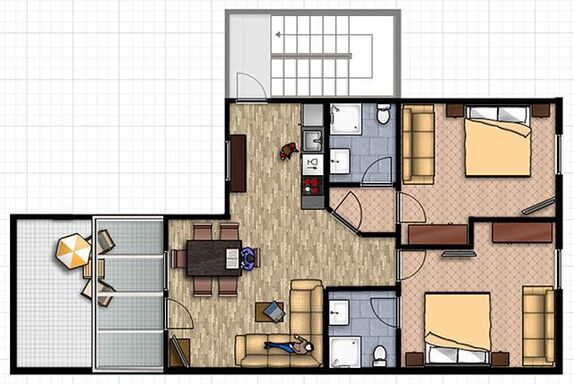Geräumiges und großzügiges Appartement im 3. Obergeschoß mit Dachterrasse und Panoramablick; 2 Doppelzimmer mit Schlafsofa (jeweils Dusche/WC), Digital-Kabel-TV in allen Räumen. Eine vollausgestattete Küche, großer Wohnraum mit Sitzecke, Sofa und Kabel TV. Größe: ca. 85 m²