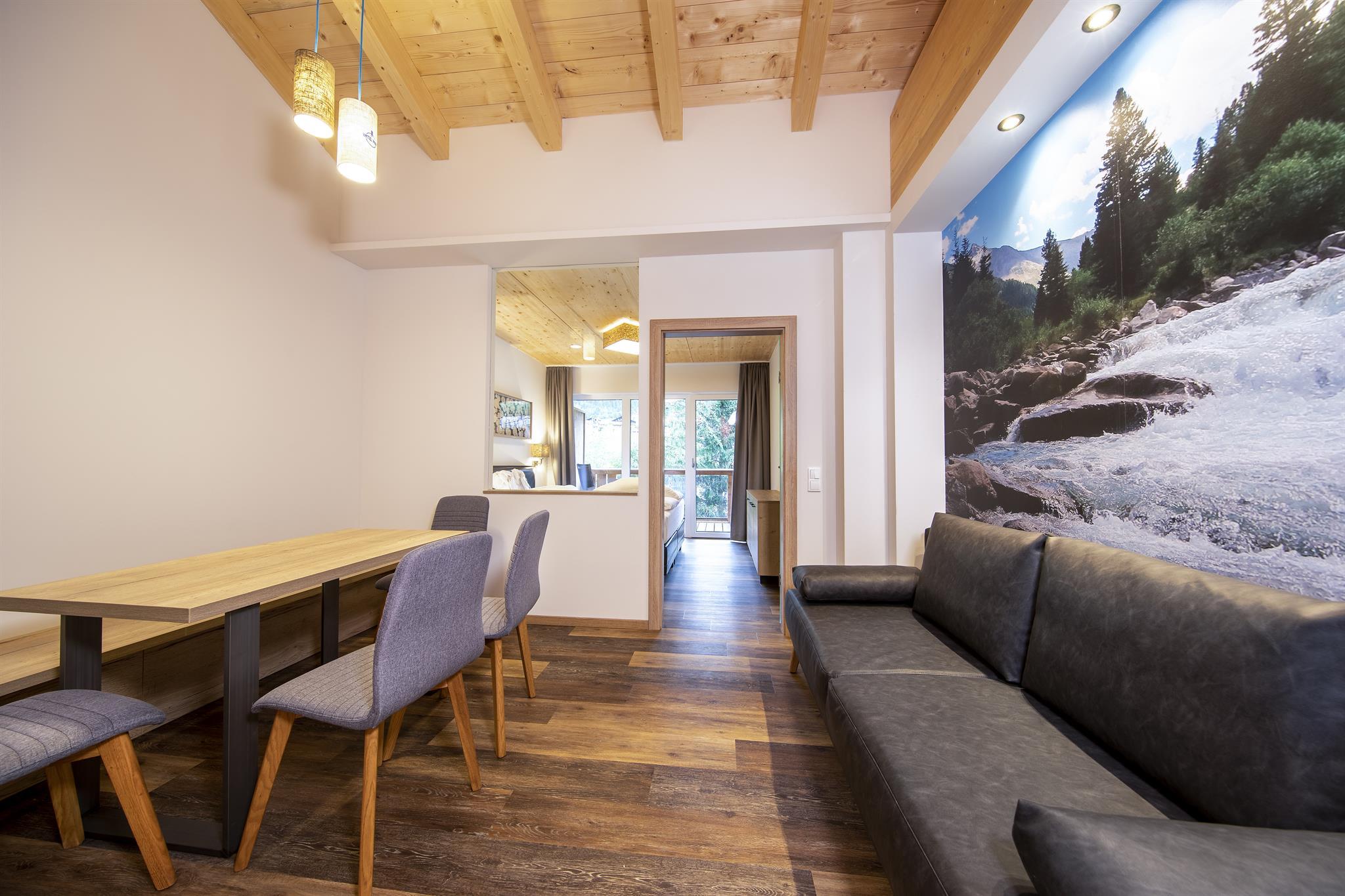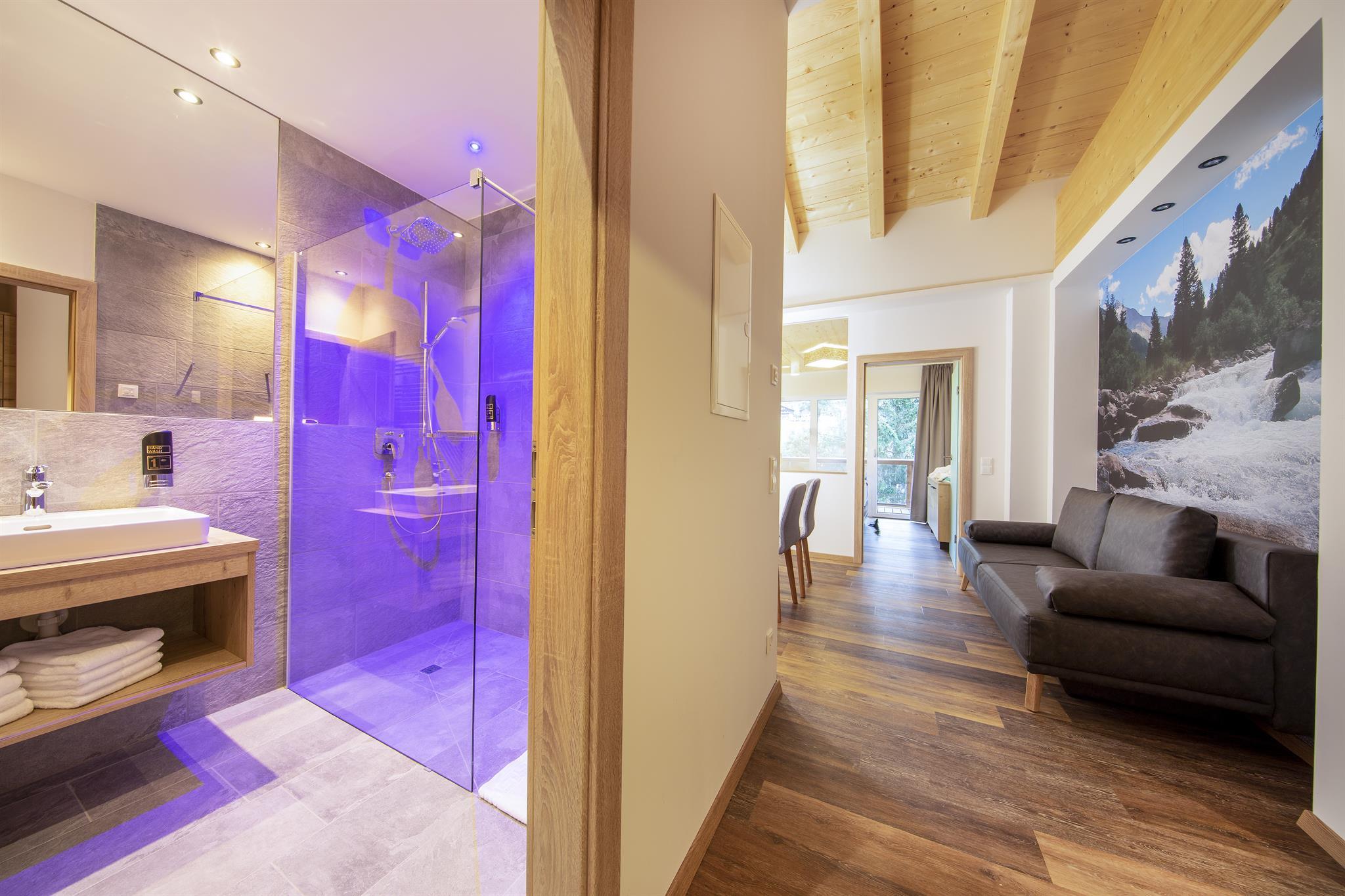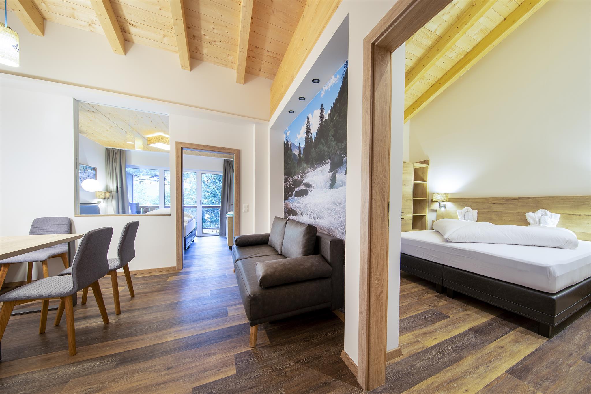 Die im Frühjahr 2019 komplett neu ausgestattete, allergikergerechte Suite (bis zu 6 Personen) verfügt über 2 getr. Schlafzimmer sowie einen Wohnraum mit Ausziehcouch und bietet viel Platz im Urluab. Die natürlichen Materialien im Alpine-Lifestyle-Design verbreiten eine angenehme Wohnatmosphäre und sorgen mit modernster Ausstattung für höchsten Wohnkomfort. Vom eigenen Balkon aus genießen Sie den Panoramablick auf die Krimmler Berge.