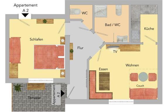 Unser Appartement A2 ist ein schönes, geräumiges Appartement im Erdgeschoss (also ohne Treppensteigen) mit einer tollen Terrasse.