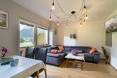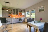 Ferienwohnung mit zwei Zimmern, 1 Boxspringbett (160 x 200) und 1e Schlafcouch, top Küche inkl. Geschirrspüler, Badezimmer mit Tageslichtfenster, geräumiger Dusche und WC, großer westseitiger Balkon zur Wiese hin mit Markise, Kabel-TV, WLAN, Haarföhn, Parkettboden