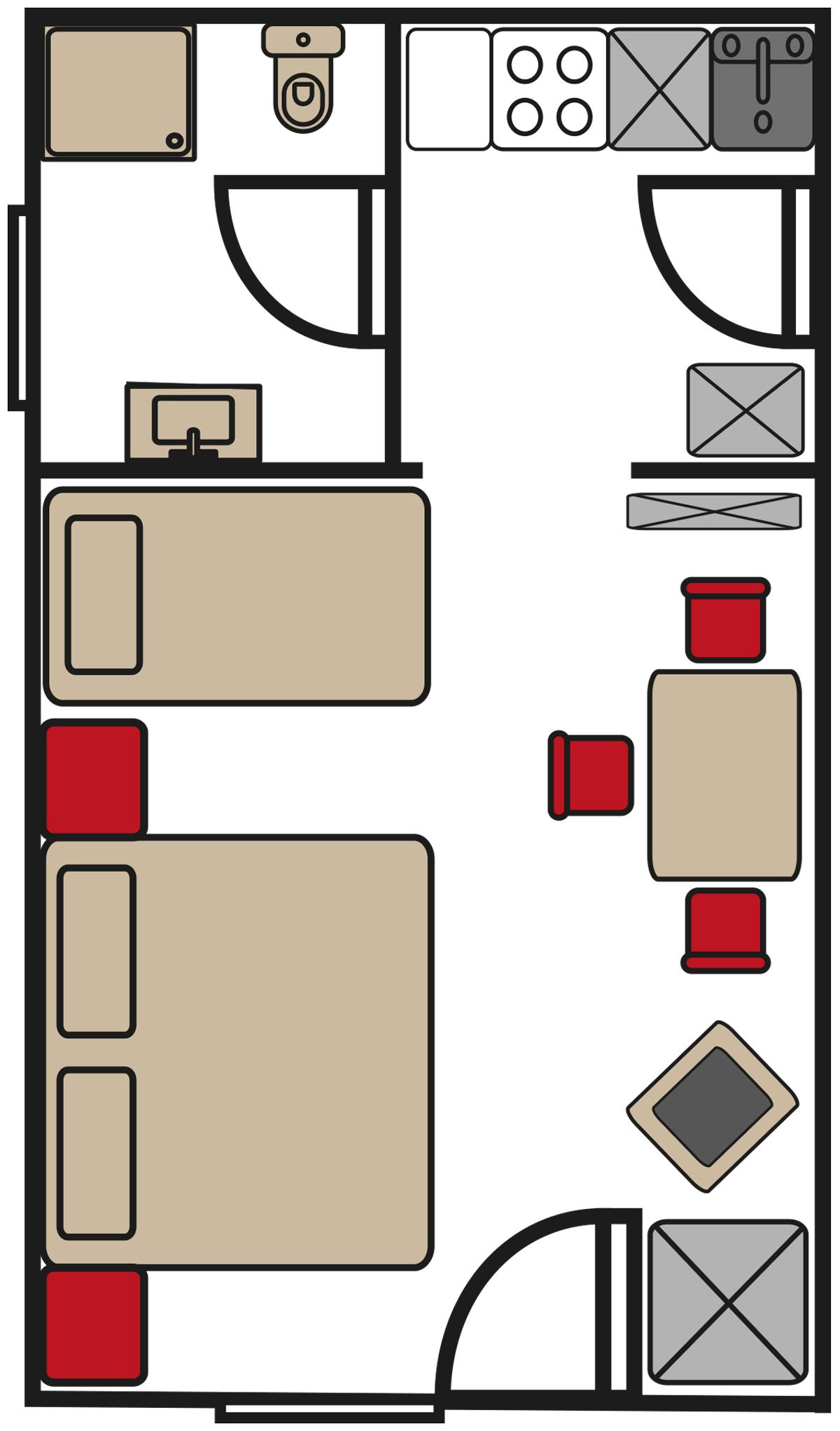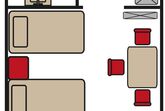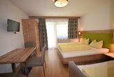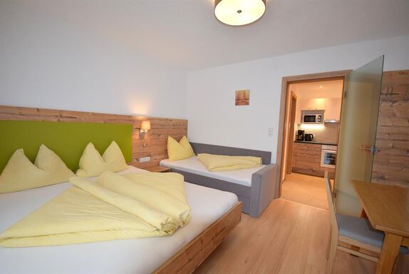 Schlafzimmer mit Doppelbett, Bettcouch (Möglichkeit für Nutzung als Hochbett, auf Anfrage für 4. Person), Essplatz, Kabelflat-TV, Dusche/ WC. WLAN