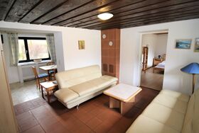 Fuchsbau/Top 2, 3-Zimmer-Wohnung 60 m2, im Erdgeschoss. Objekt geeignet für 5 Erwachsene + 2 Kinder. Einfach und zweckmässig eingerichtet: Wohn-/Esszimmer mit Esstisch, Sat-TV und Kachelofen. 1 Zimmer mit 1 x 2 Etagenbetten, 1 Doppelbett (160 cm, Länge 200 cm). 1 Zimmer mit 1 Bett und 1 Doppelbett (160 cm, Länge 200 cm). Ausgang zur Terrasse. Offene Küche (4 Kochplatten, Backofen, Geschirrspüler, Mikrowelle). Dusche, Dusche/WC, sep. WC. Kleine Terrasse. Sicht auf die Landschaft und die Ortschaft. Zur Verfügung: Internet (Wireless LAN, gratis). Bitte beachten: geeignet für Familien. Nichtraucher-Unterkunft. Rauchmelder, Feuerlöscher.