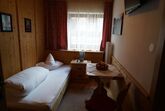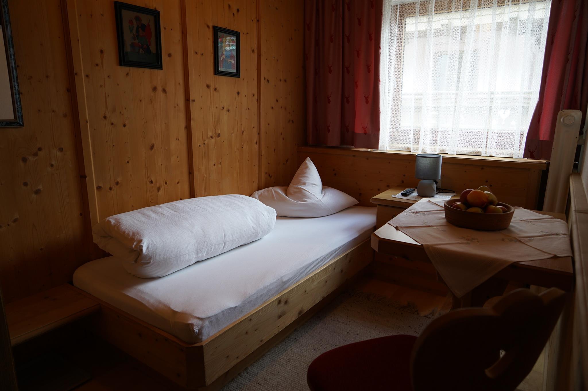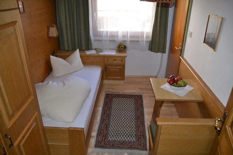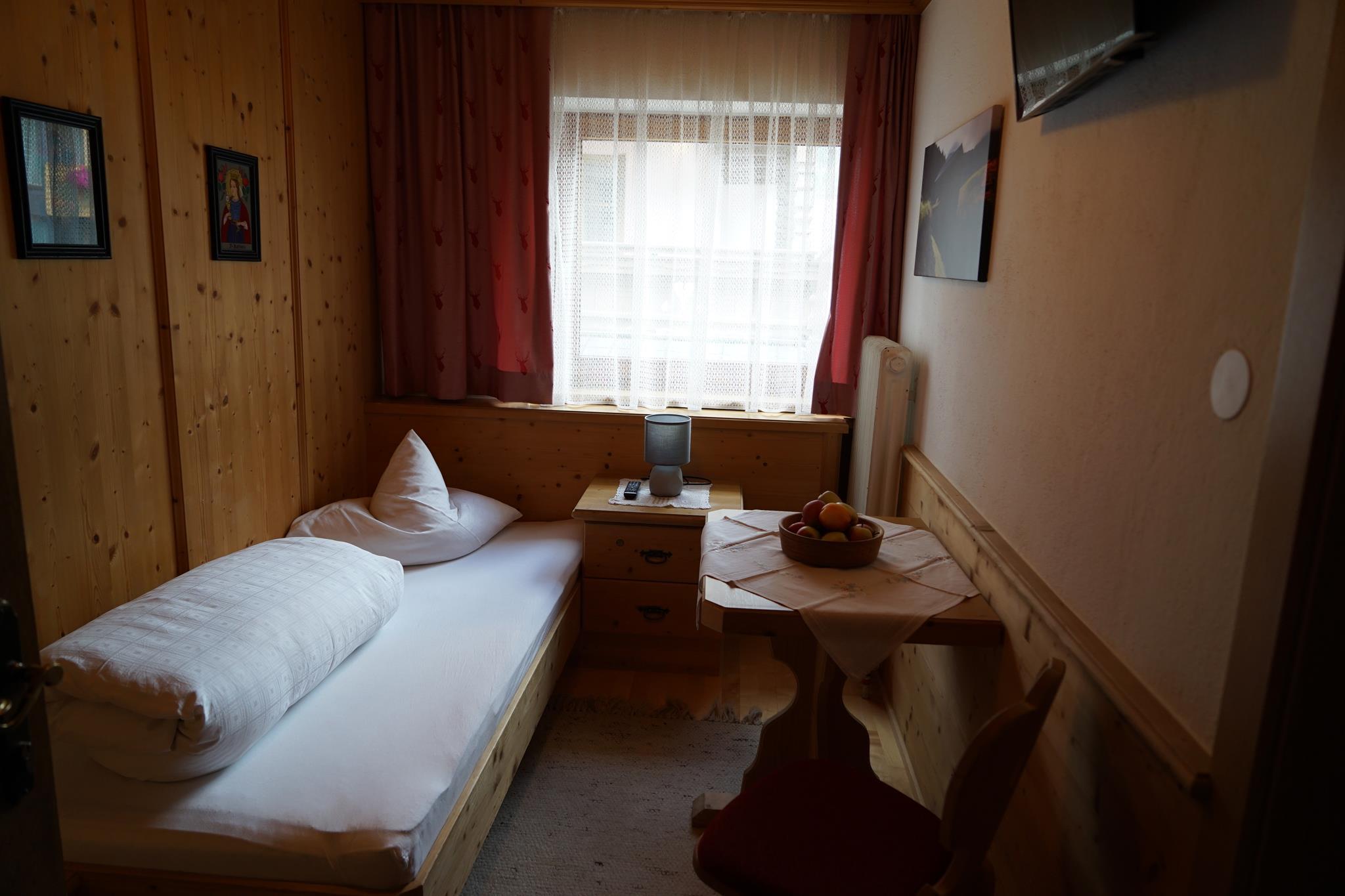 Ruhiges Zimmer im Tiroler Stil mit Einzelbett, Sitzgelegenheit, TV, Dusche/WC, ohne Balkon. Größe ca. 14 m².