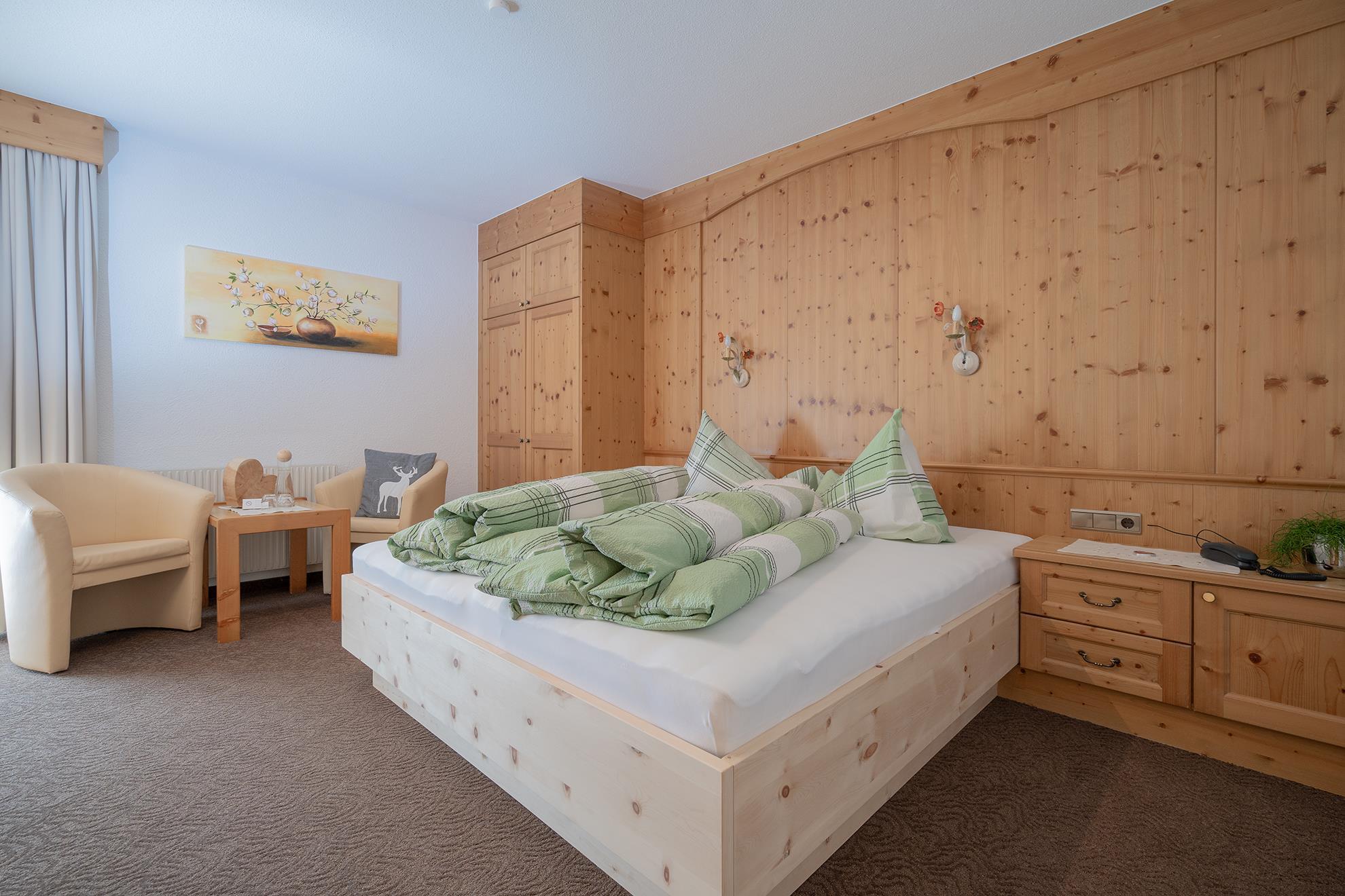 NEU renoviertes, komfortables Doppelzimmer Typ A in natürlichem Zirbenholz eingerichtet, mit einem Schlafsofa für die 3. Person. Badezimmer mit Badewanne oder Dusche und WC, Telefon, Kabel-TV, Radio, Safe, Minibar und Balkon oder Terasse. Größe: ca. 30 m². Nichtraucherzimmer.