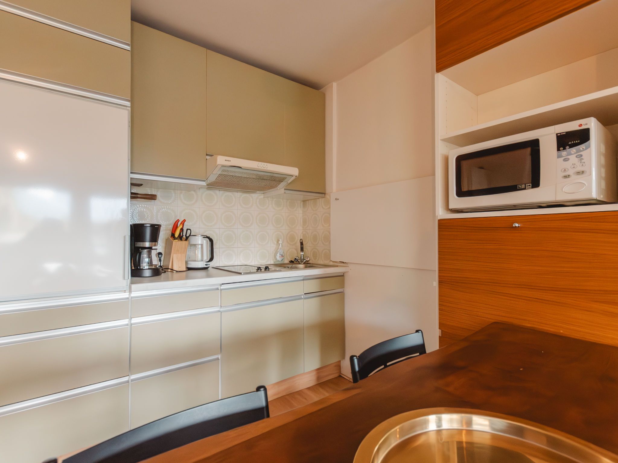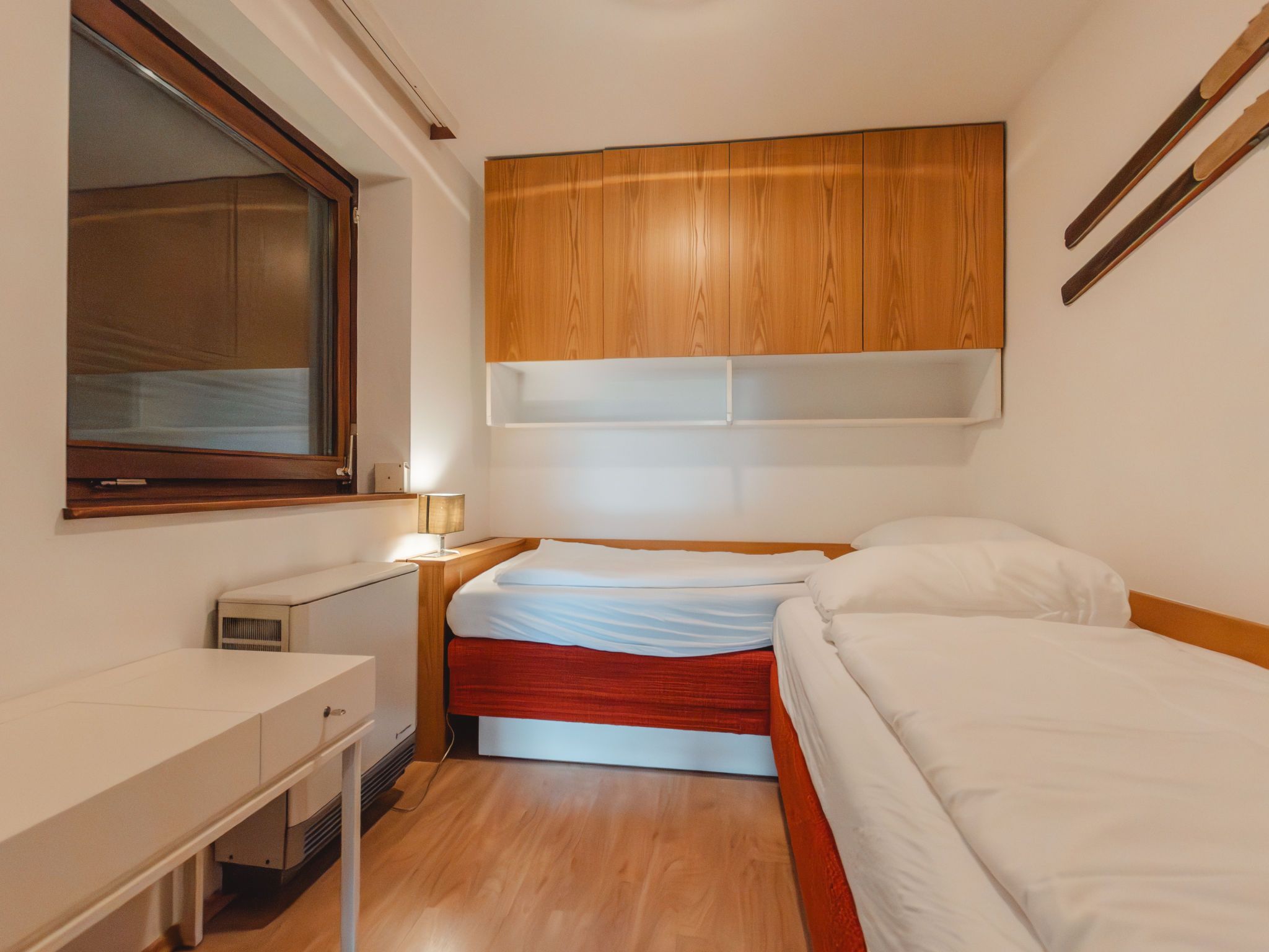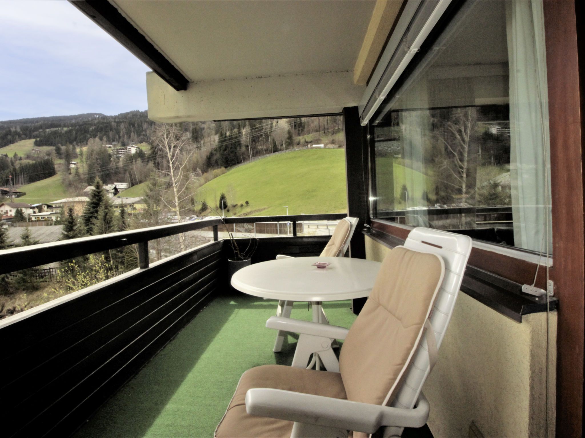 2-Zimmer-Wohnung 45 m2 im 2. Stock. Einfach und gemütlich eingerichtet: Eingang. 1 Zimmer mit 2 Betten. Wohn-/Schlafzimmer mit 1 Doppeldiwanbett, Esstisch und Kabel-TV (Flachbildschirm), Warmluftheizung. Ausgang zum Balkon. Kleine, offene Küche (Geschirrspüler, 2 Glaskeramikplatten, Toaster, Wasserkocher, Mikrowelle). Bad/WC. Balkon. Balkonmöbel. Schöne, auf die Berge und die Landschaft. Zur Verfügung: Internet (WLAN, gratis). Bitte beachten: Nichtraucher-Unterkunft. 1 Haustier/Hund erlaubt. 50402-000739-2021