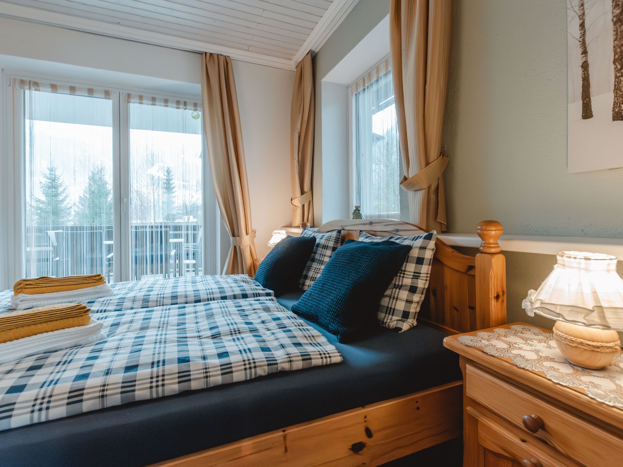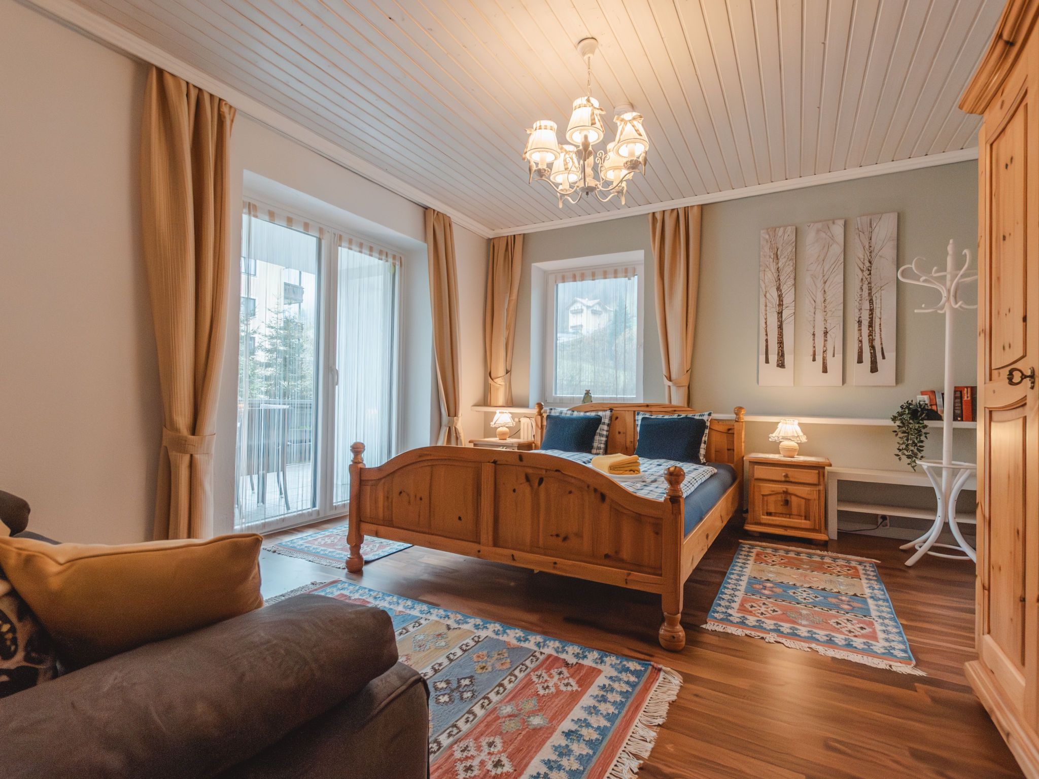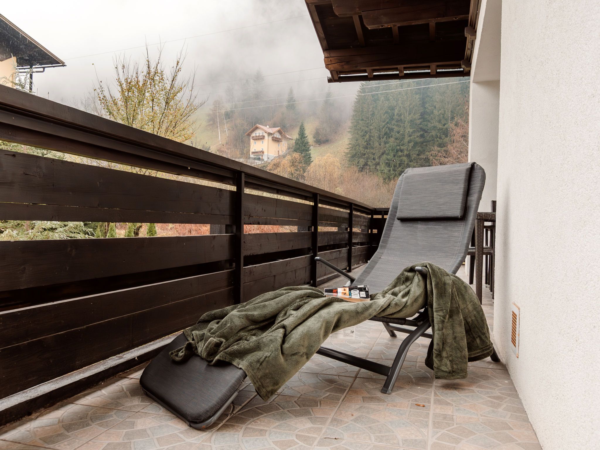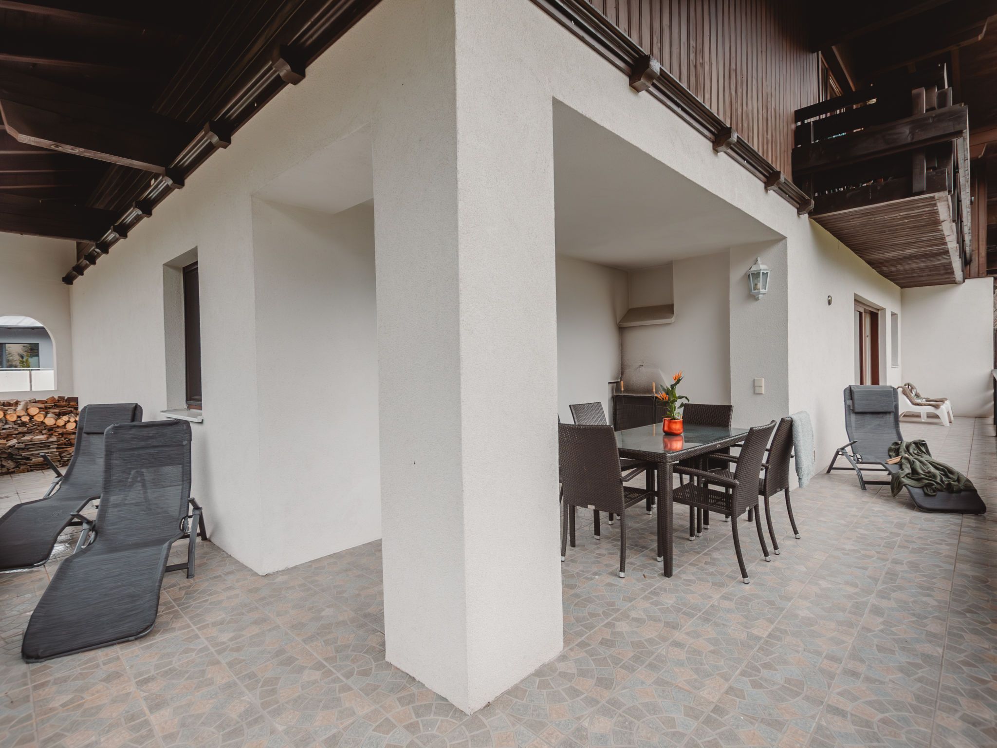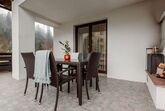 The Alpine Classic, 3-Zimmer-Wohnung 101 m2 im 1. Stock. Geräumig und hell, komfortabel und geschmackvoll eingerichtet: Eingang. Wohn-/Esszimmer mit 1 Doppeldiwanbett, offenem Kamin, Esstisch und Sat-TV (Flachbildschirm). Ausgang zur Terrasse. 1 Zimmer mit 1 Diwanbett, 1 Doppelbett und Bad/Dusche/WC. Ausgang zum Balkon. 1 Doppelzimmer mit 1 Doppelbett. Küche (Backofen, Geschirrspüler, 4 Glaskeramikplatten, Toaster, Wasserkocher, Mikrowelle, Tiefkühler, elektrische Kaffeemaschine) mit kleiner Bar. Bad/WC. Holzdielenboden. Grosse Terrasse 75 m2. Terrassenmöbel, Gartengrill, Liegestühle. Herrliche Sicht auf die Berge, das Tal und den Garten. Zur Verfügung: Waschmaschine, Wäschetrockner. Internet (Wireless LAN, gratis). Bitte beachten: geeignet für Familien. Nichtraucher-Unterkunft. Rauchmelder. Achtung: Kleinkinder und Babies gelten als volle Person und können nicht kostenfrei mitgenommen werden. 50403-000215-2020
