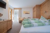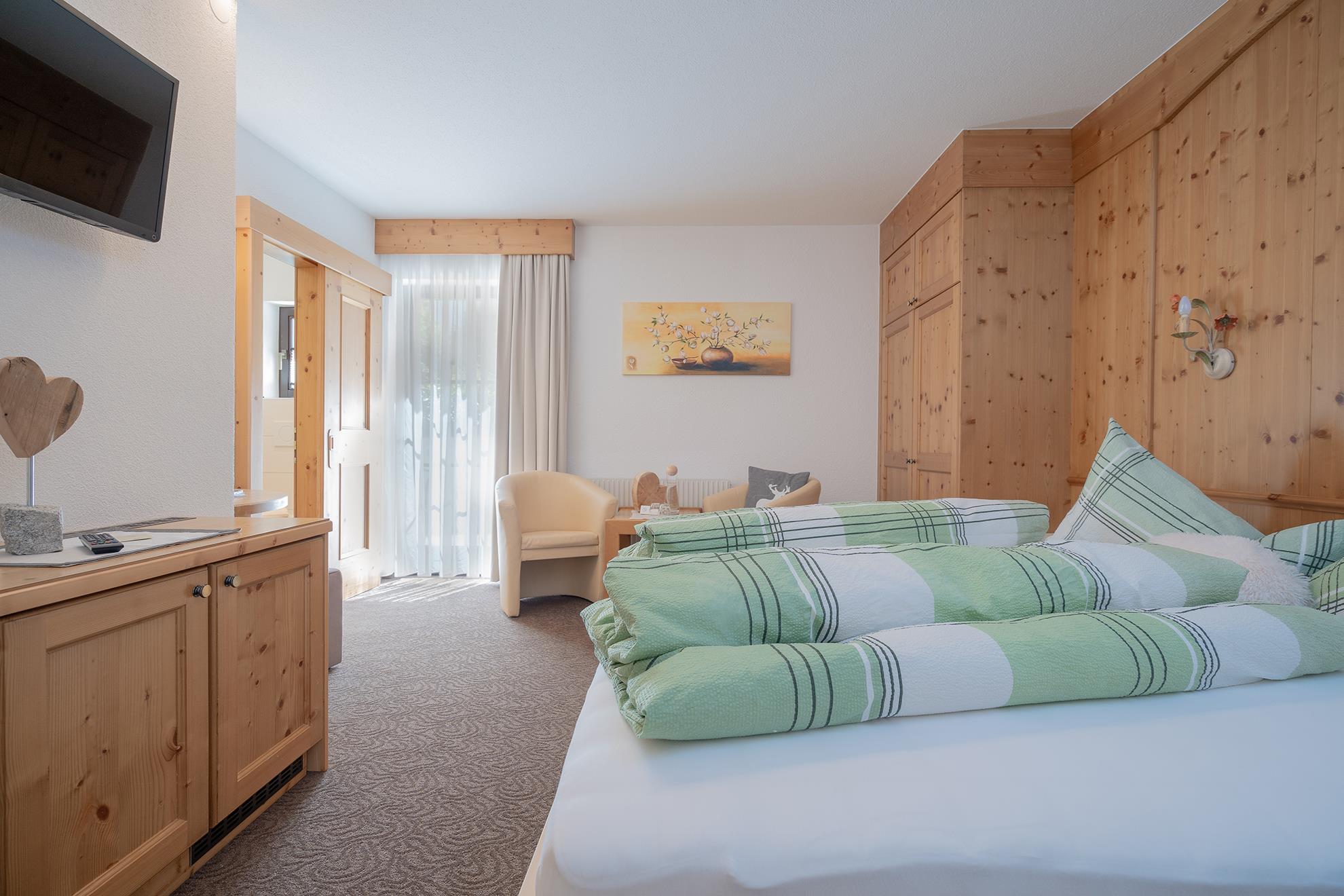 NEU renoviertes, komfortables Doppelzimmer Typ B in natürlichem Zirbenholz eingerichtet mit Badezimmer mit Dusche/WC, Telefon, Kabel-TV, Radio, Safe, Minibar und Balkon oder Terasse. Zustellbett für eine 3. Person. Größe: ca. 25 m².