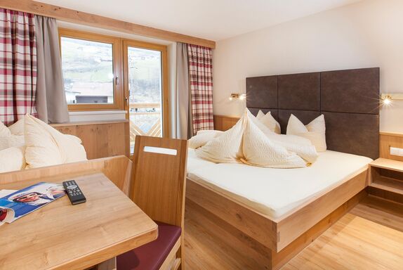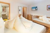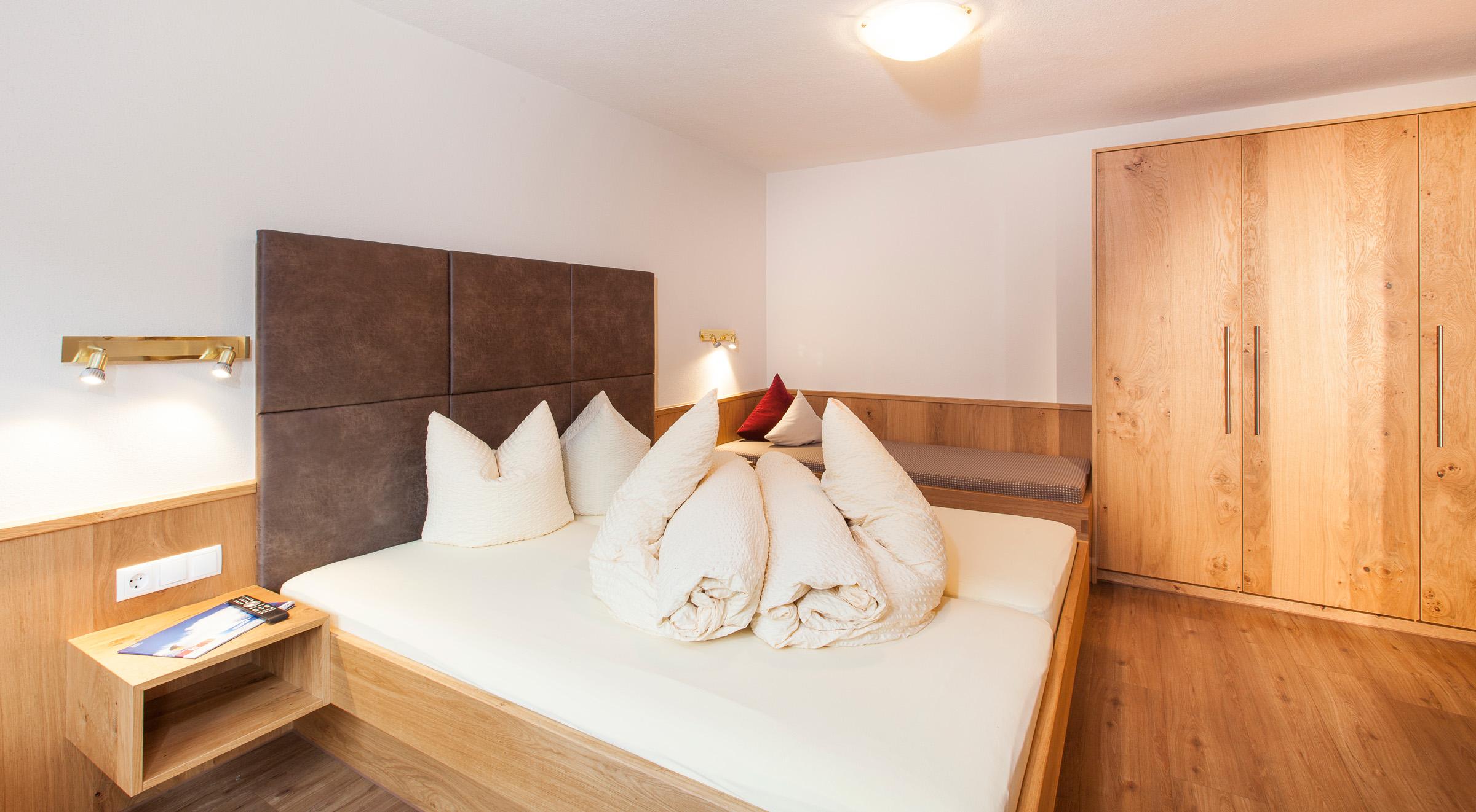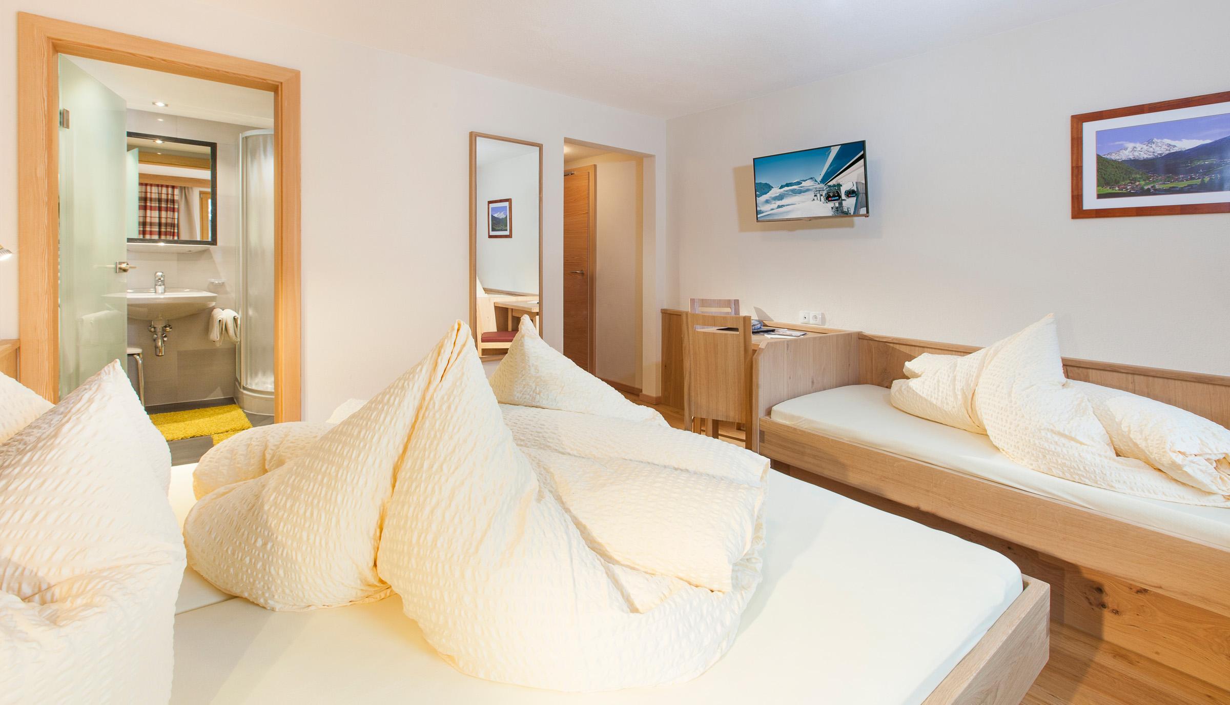 Ihr Komfortzimmer ist sehr großzügig und in Tiroler Naturholz gehalten. Das Zimmer verfügt über Doppelbett und ein Einzelbett mit Balkon sowie Flat-TV, Safe und eine gemütliche Sitzecke. Das Badezimmer ist mit Dusche/WC und Haarföhn ausgestattet.