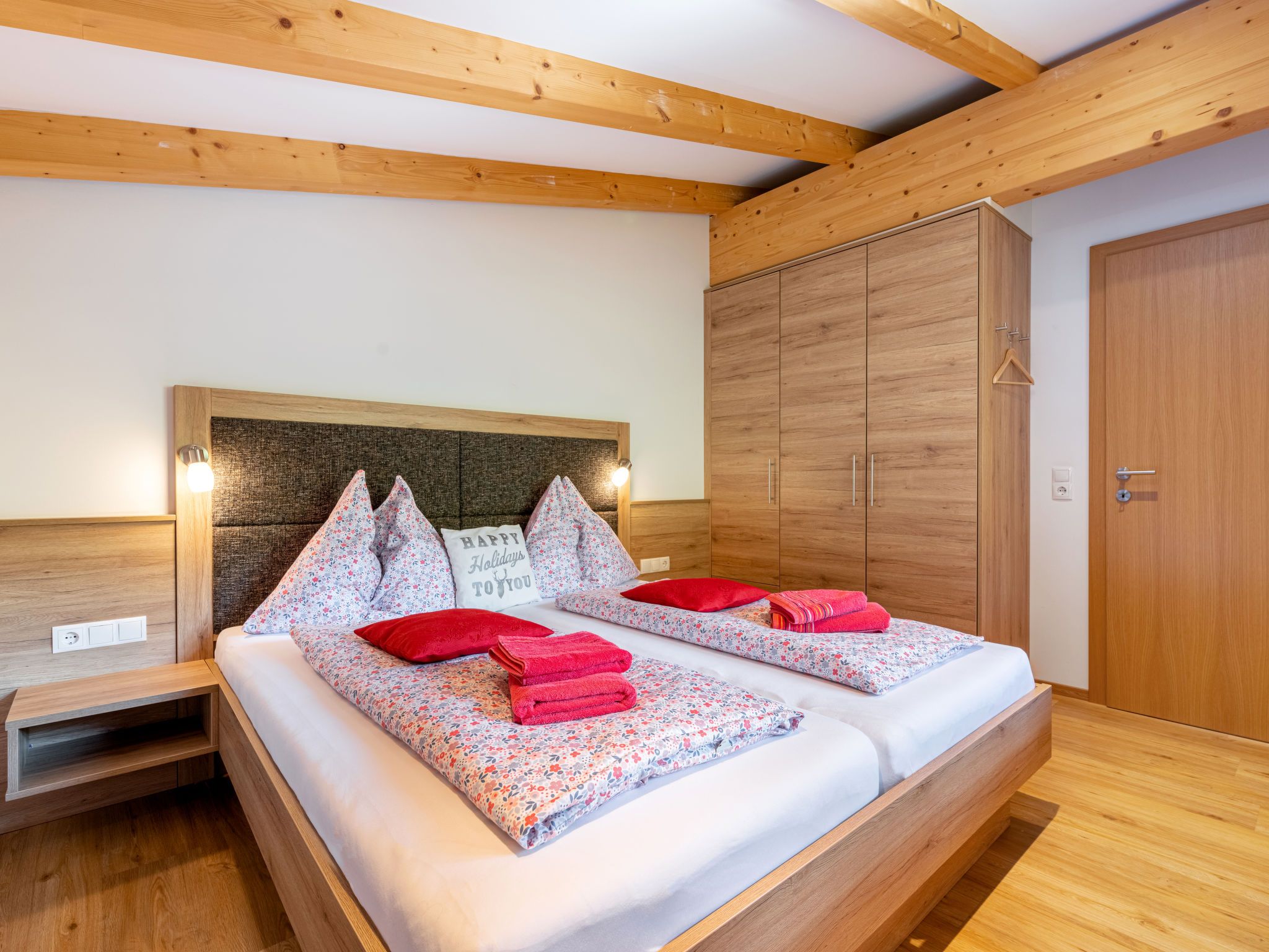 3-Zimmer-Wohnung 50 m2, im Dachgeschoss. Hell, gemütlich eingerichtet: 2 Doppelzimmer, jedes Zimmer mit Sat-TV (Flachbildschirm). Grosse Wohnküche (Backofen, Geschirrspüler, 2 Glaskeramikplatten, Mikrowelle, elektrische Kaffeemaschine, Kapseln für die Kaffeemaschine (Senseo pads)) mit Essecke und Sat-TV (Flachbildschirm). Ausgang zum Balkon. Dusche, sep. WC, Doppelwaschbecken. Bodenheizung. Holzdielenboden. Balkon 6 m2. Balkonmöbel. Sicht auf die Landschaft. Zur Verfügung: Kinderhochstuhl, Babybett bis 2 Jahre, Haartrockner. Internet (Wireless LAN, gratis). Bitte beachten: Nichtraucher-Unterkunft. Rauchmelder. 50616-001214-2020