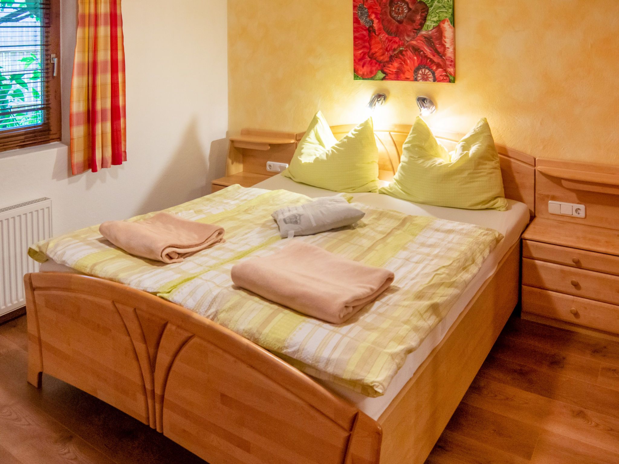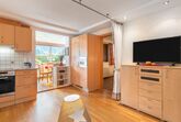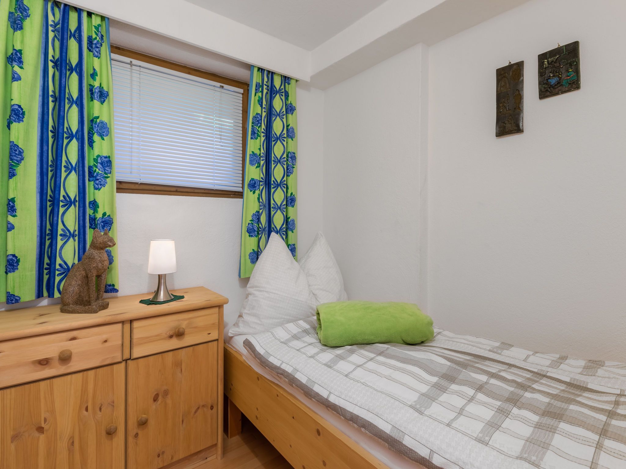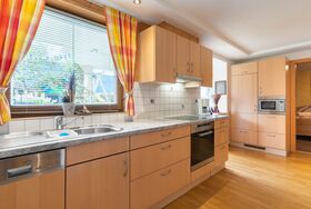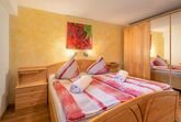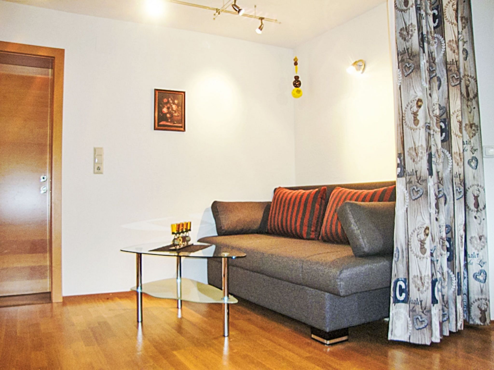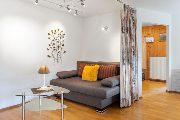 4-Zimmer-Wohnung 63 m2, im ebenerdigen Untergeschoss. Geräumig, gemütlich eingerichtet: Eingang. 1 Doppelzimmer mit Kabel-TV (Flachbildschirm). 1 kleines Zimmer mit 1 Bett. Offenes Esszimmer. Wohn-/Schlafzimmer mit 1 Doppeldiwanbett (1 x 160 cm, Länge 200 cm), Kabel-TV (Flachbildschirm). Offene Küche (Backofen, Geschirrspüler, 4 Glaskeramikplatten, Toaster, Wasserkocher, Mikrowelle, elektrische Kaffeemaschine). Bad/Dusche, sep. WC. Kleine Terrasse. Terrassenmöbel, Gartengrill. Schöne Sicht auf die Berge. Zur Verfügung: Waschmaschine. Internet (WLAN, gratis). Bitte beachten: Nichtraucher-Unterkunft. Der Schlafbereich im Wohnzimmer kann mit einem Vorhang abgetrennt werden. 50613-018222-2020