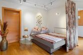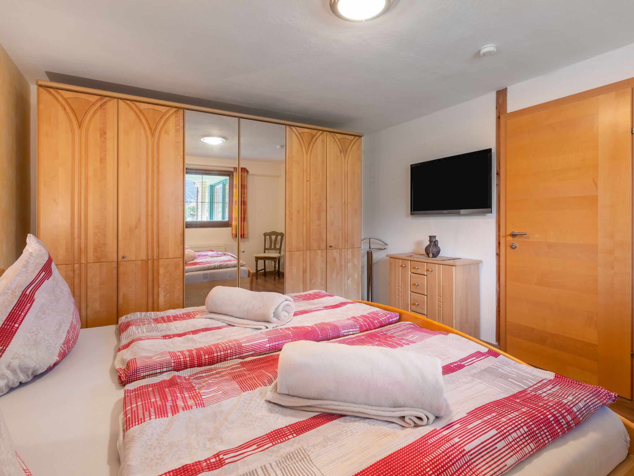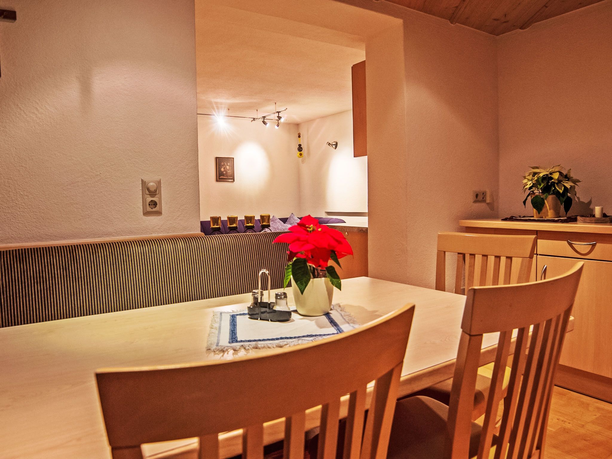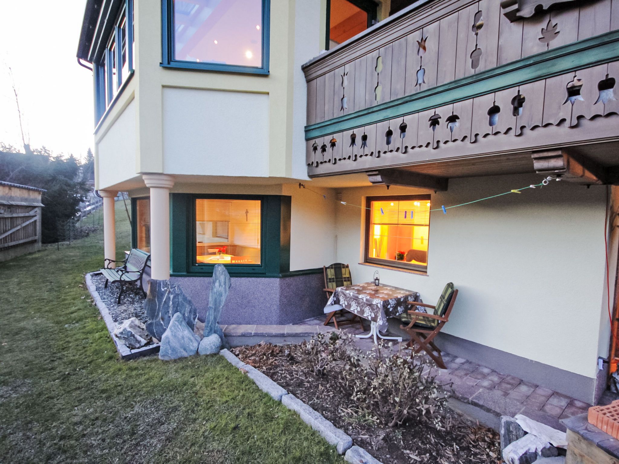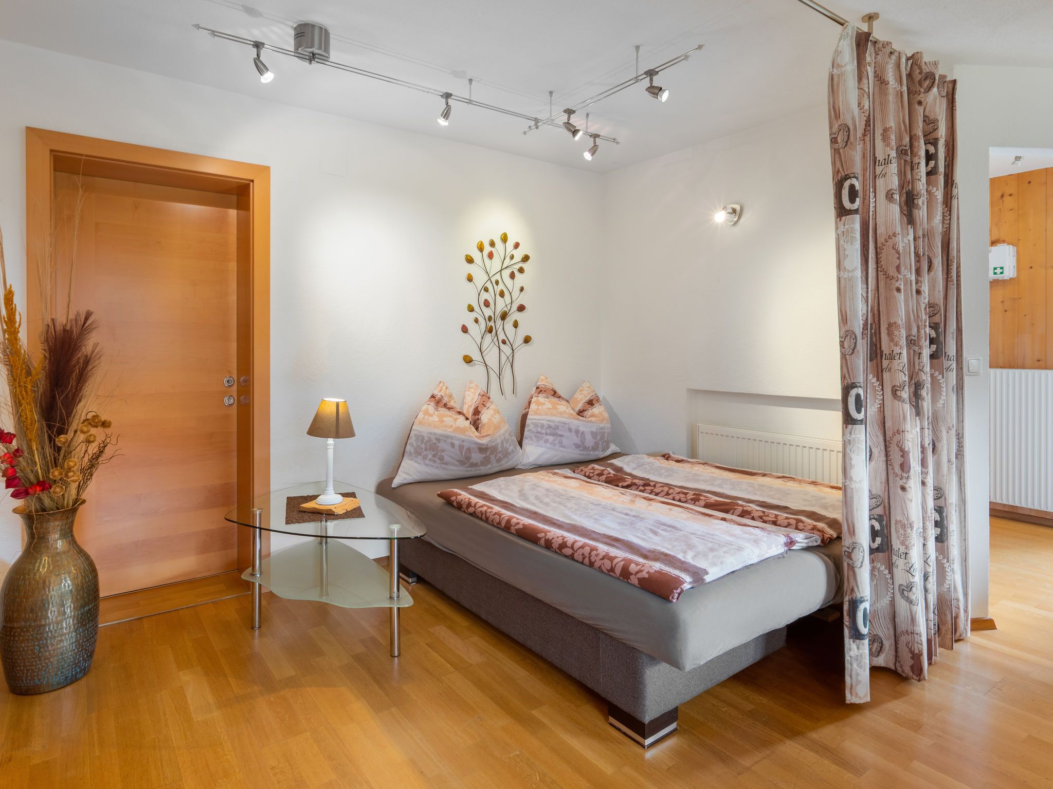 4-Zimmer-Wohnung 63 m2, im ebenerdigen Untergeschoss. Geräumig, gemütlich eingerichtet: Eingang. 1 Doppelzimmer mit Kabel-TV (Flachbildschirm). 1 kleines Zimmer mit 1 Bett. Offenes Esszimmer. Wohn-/Schlafzimmer mit 1 Doppeldiwanbett (1 x 160 cm, Länge 200 cm), Kabel-TV (Flachbildschirm). Offene Küche (Backofen, Geschirrspüler, 4 Glaskeramikplatten, Toaster, Wasserkocher, Mikrowelle, elektrische Kaffeemaschine). Bad/Dusche, sep. WC. Kleine Terrasse. Terrassenmöbel, Gartengrill. Schöne Sicht auf die Berge. Zur Verfügung: Waschmaschine. Internet (WLAN, gratis). Bitte beachten: Nichtraucher-Unterkunft. Der Schlafbereich im Wohnzimmer kann mit einem Vorhang abgetrennt werden. 50613-018222-2020