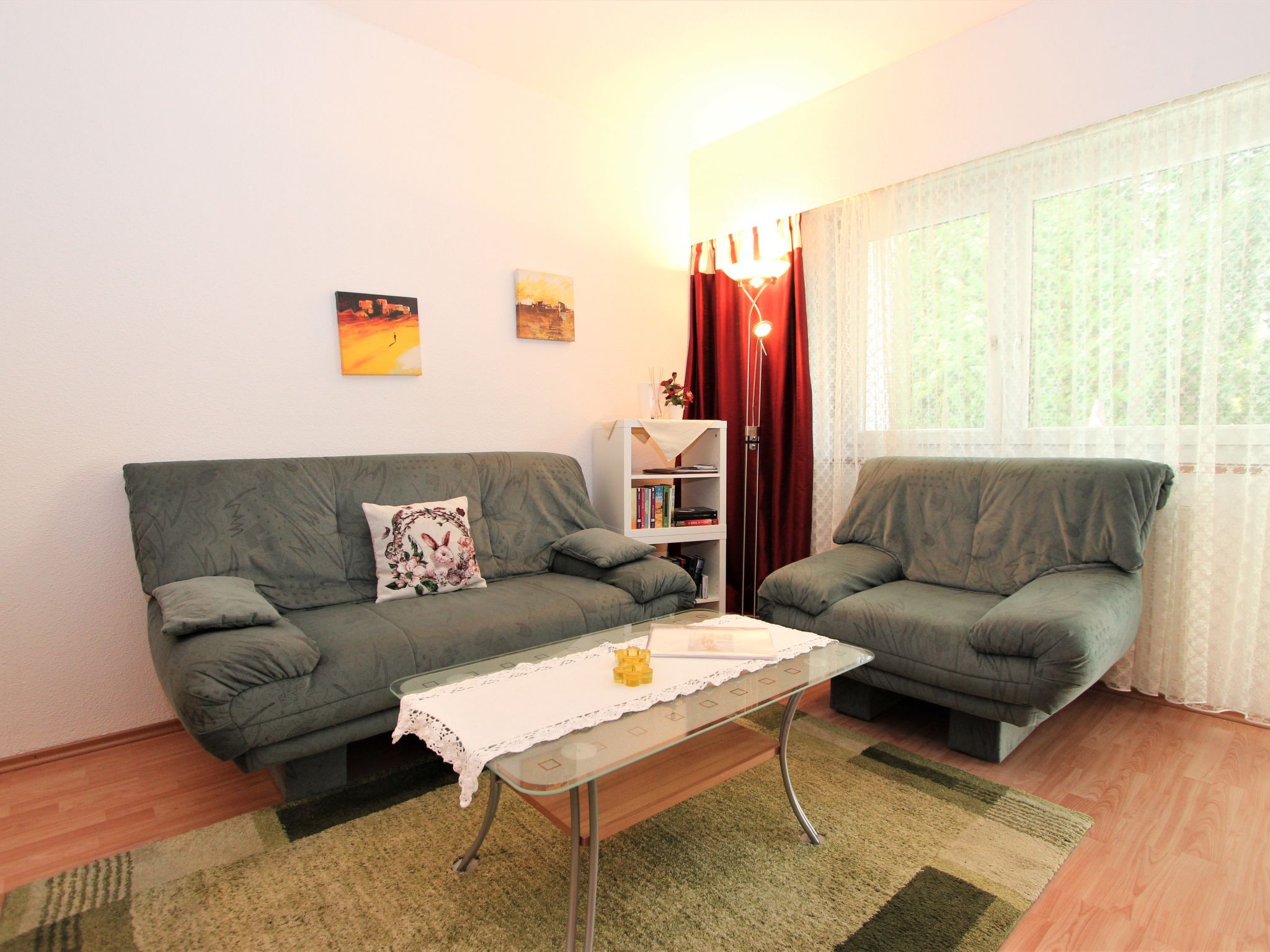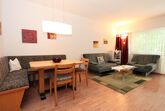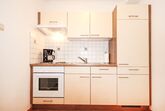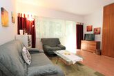 1-Zimmer-Wohnung 33 m2, im erhöhten Erdgeschoss. Gemütlich eingerichtet: Wohn-/Esszimmer mit 1 Doppelwandschrankbett, Kabel-TV und Radio. Küche (4 Kochplatten, Backofen). Dusche/WC. Balkon. Balkonmöbel. Bitte beachten: Nichtraucher-Unterkunft. Maximal 1 Haustier/Hund erlaubt. Rauchmelder.