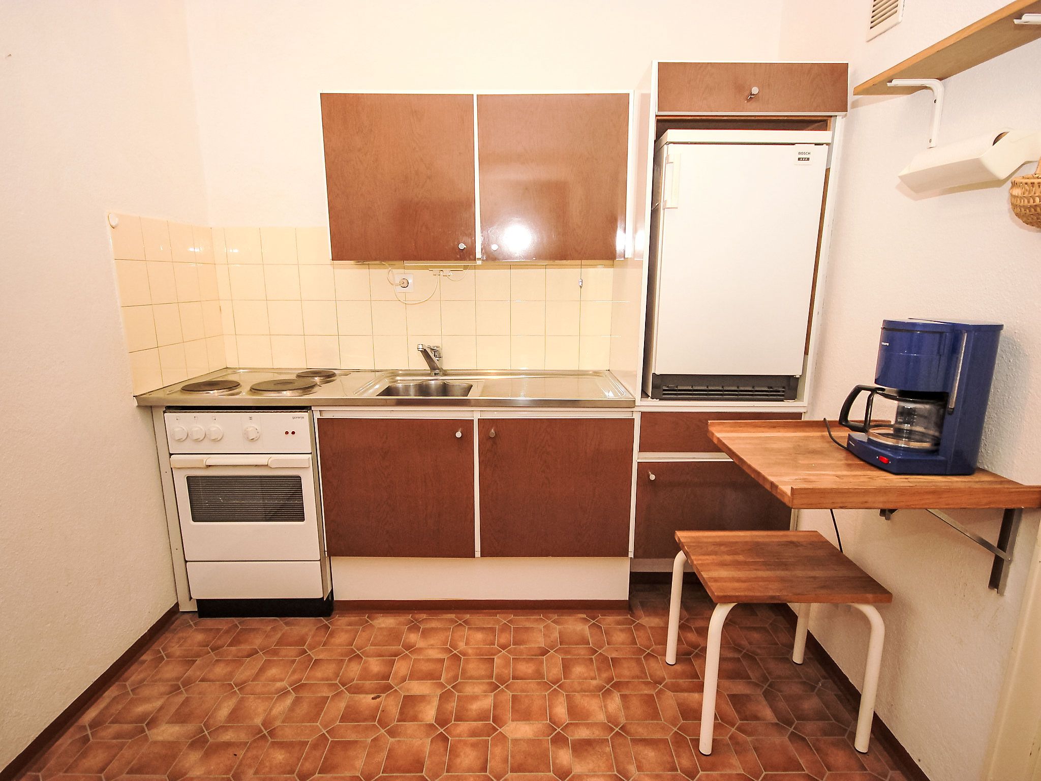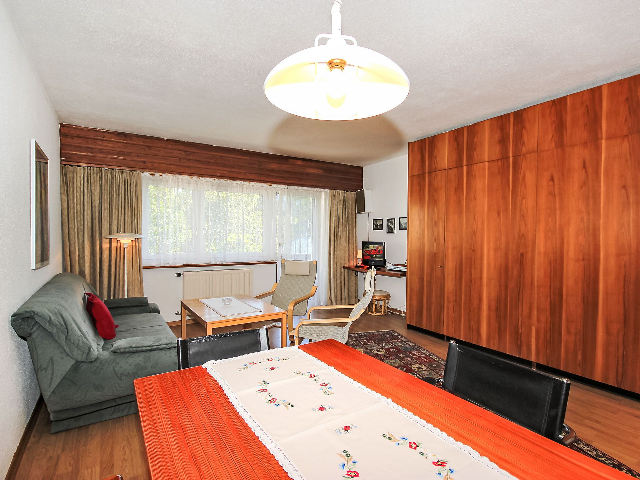 1-Zimmer-Wohnung 33 m2 im 2. Stock. Wohn-/Esszimmer mit 1 Doppelwandschrankbett und Kabel-TV (Flachbildschirm), Radio. Küche (3 Kochplatten, Backofen). Bad/WC. Balkon. Balkonmöbel. Bitte beachten: Nichtraucher-Unterkunft. Maximal 1 Haustier/Hund erlaubt. Rauchmelder.