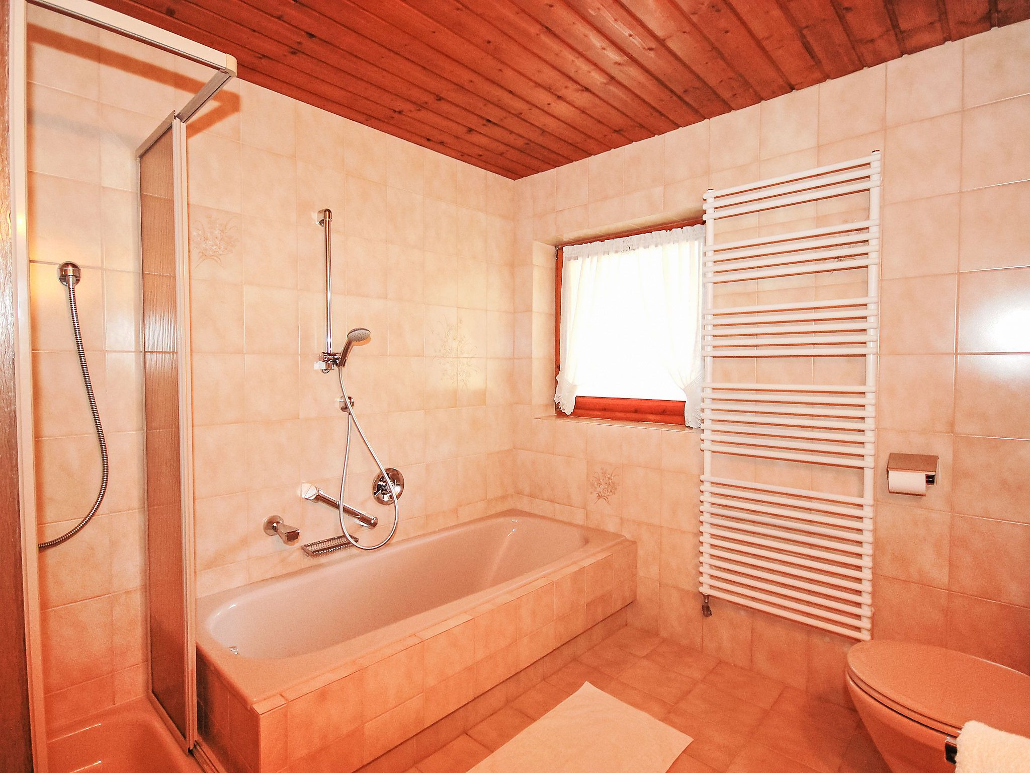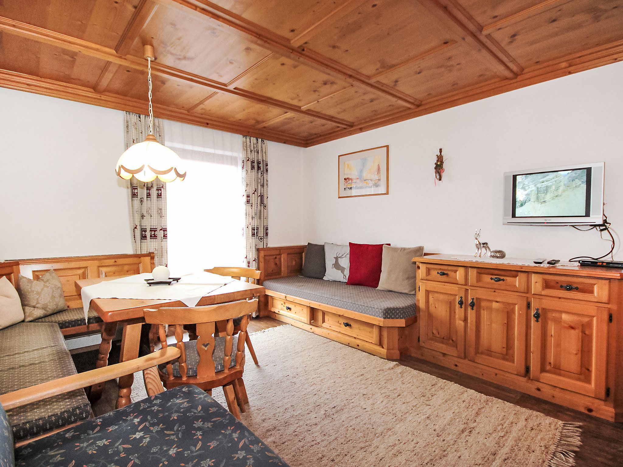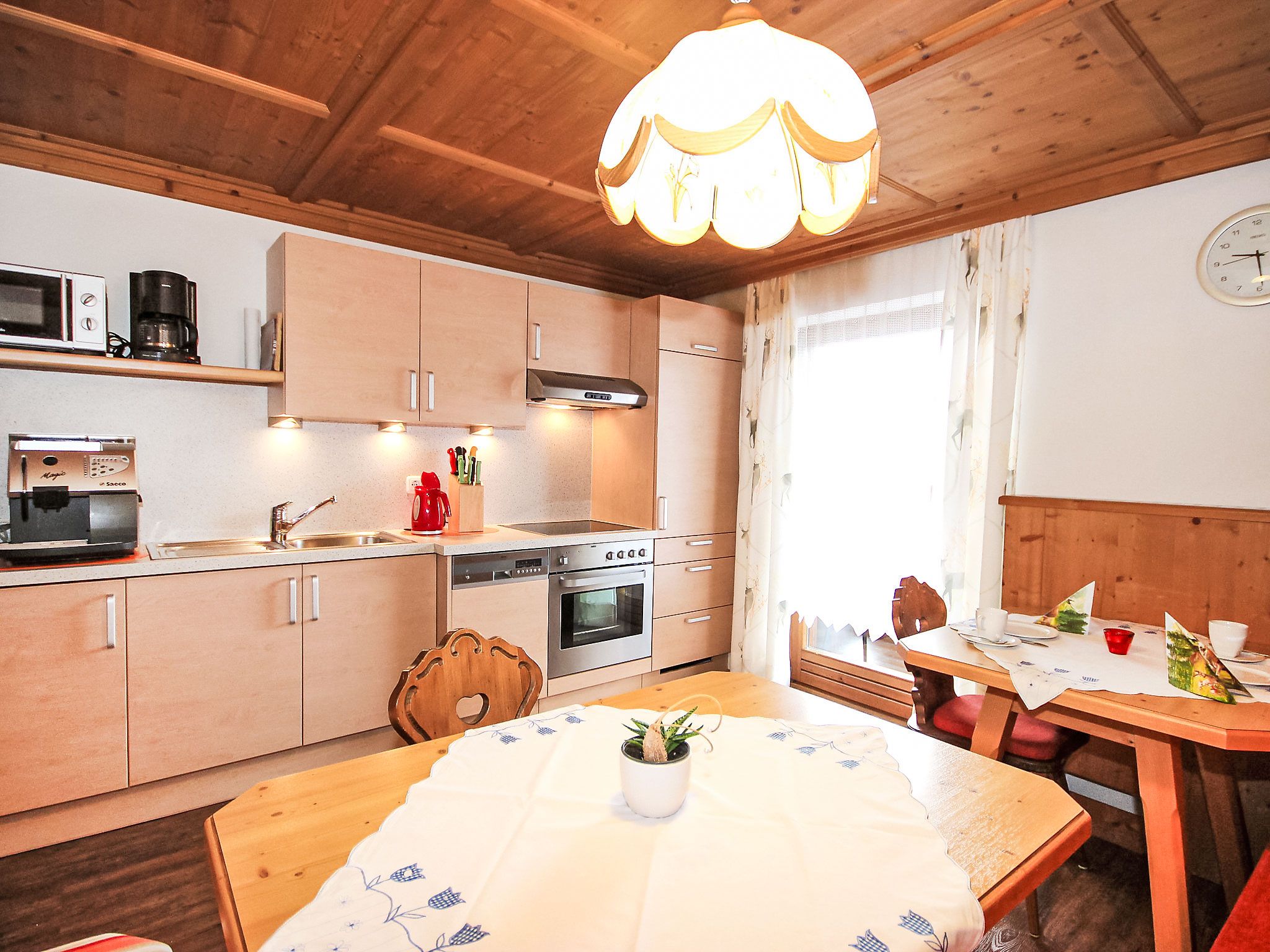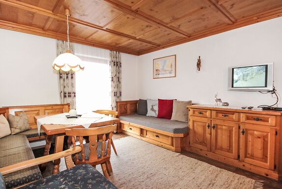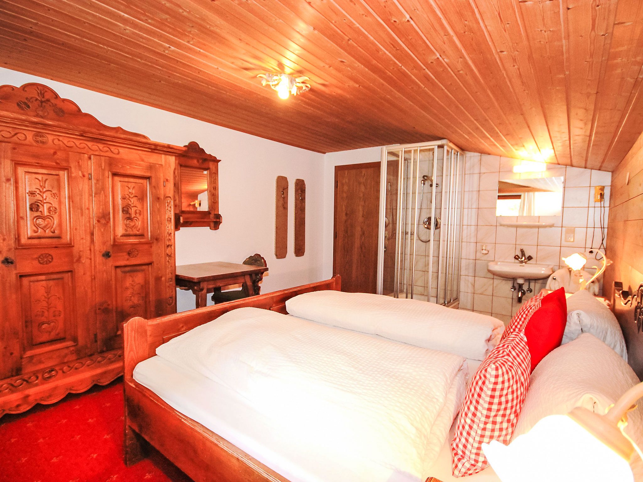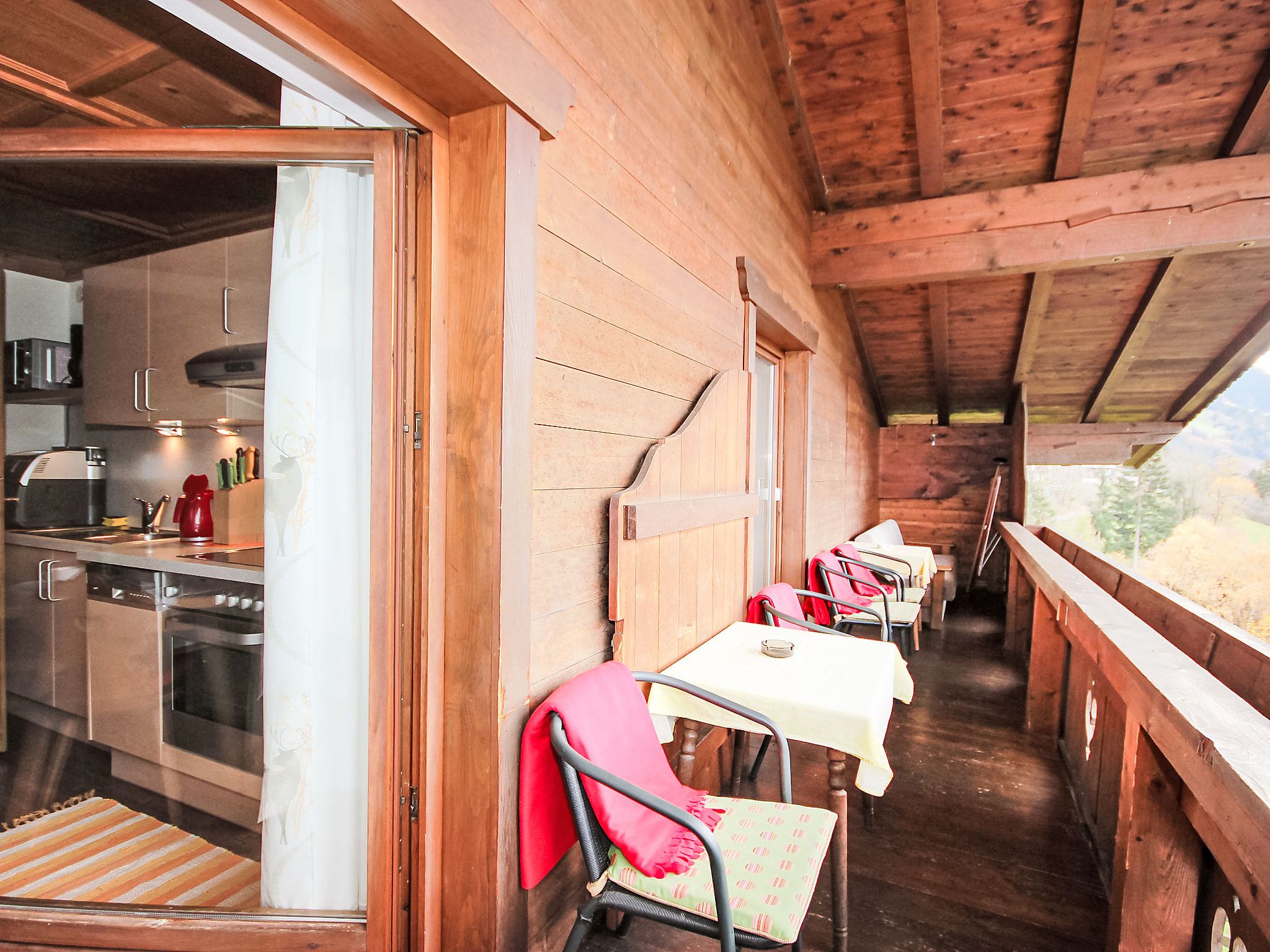 5-Zimmer-Wohnung 100 m2 im 1. Stock. Geräumig, schön und gemütlich eingerichtet: Eingang. Wohn-/Esszimmer mit Essecke und Sat-TV (Flachbildschirm). Ausgang zum Balkon. 1 Zimmer mit 1 Bett, 1 Doppelbett und Waschbecken. 2 Doppelzimmer, jedes Zimmer mit Waschbecken und Dusche. Wohnküche (Backofen, Geschirrspüler, 4 Glaskeramikplatten, Toaster, Wasserkocher, Mikrowelle) mit Esstisch, Radio und CD. Ausgang zum Balkon. Sep. WC, Bad/Dusche/WC. Balkon. Balkonmöbel. Herrliche Panoramasicht auf die Berge und das Tal. Zur Verfügung: Haartrockner. Internet (Wireless LAN, gratis). Bitte beachten: Rauchmelder. Kaffeevollautomat und Filterkaffeemaschine vorhanden.