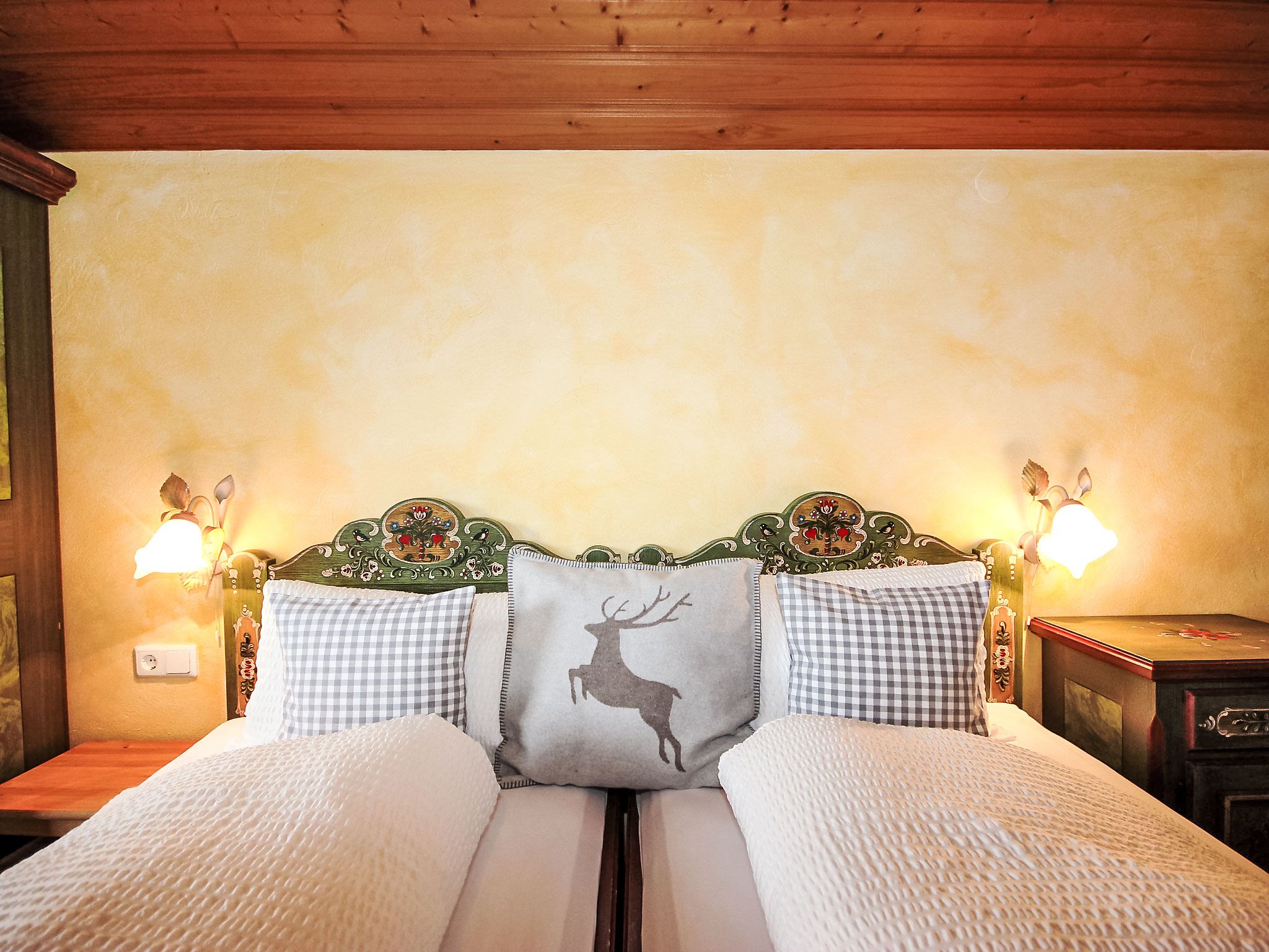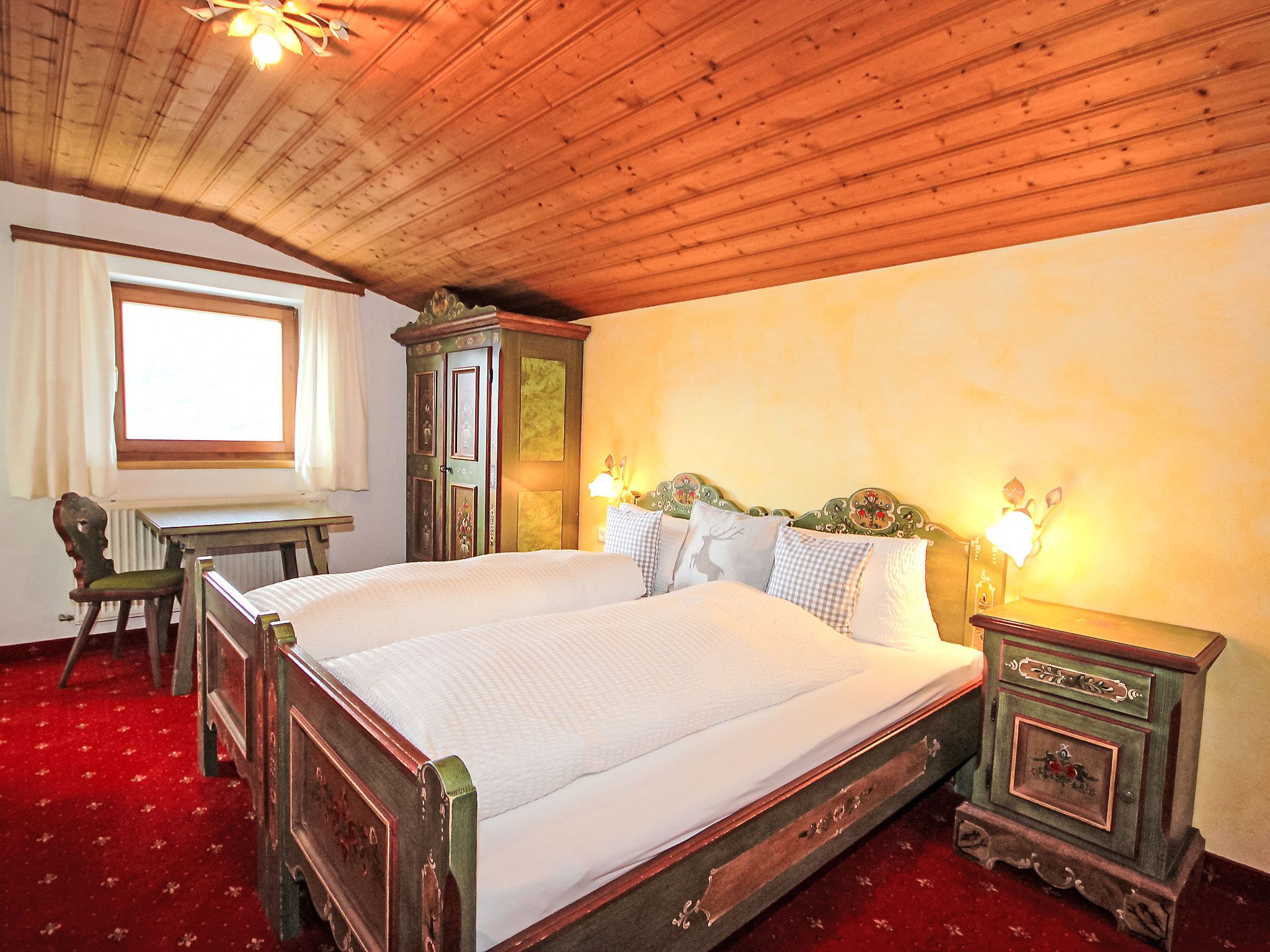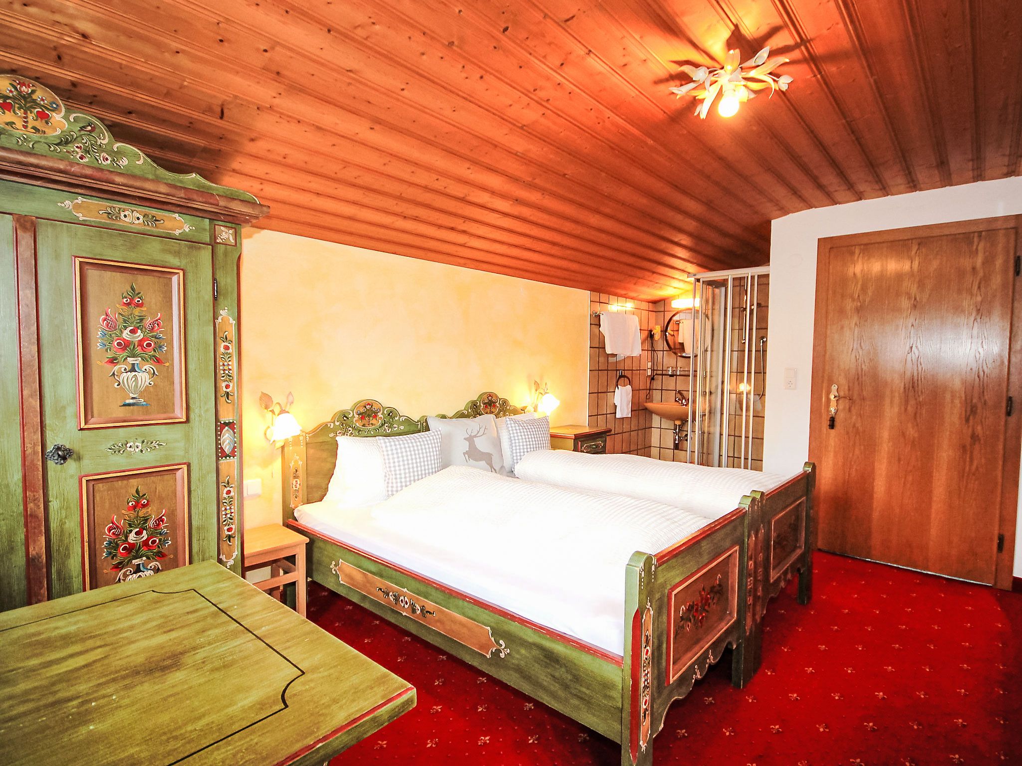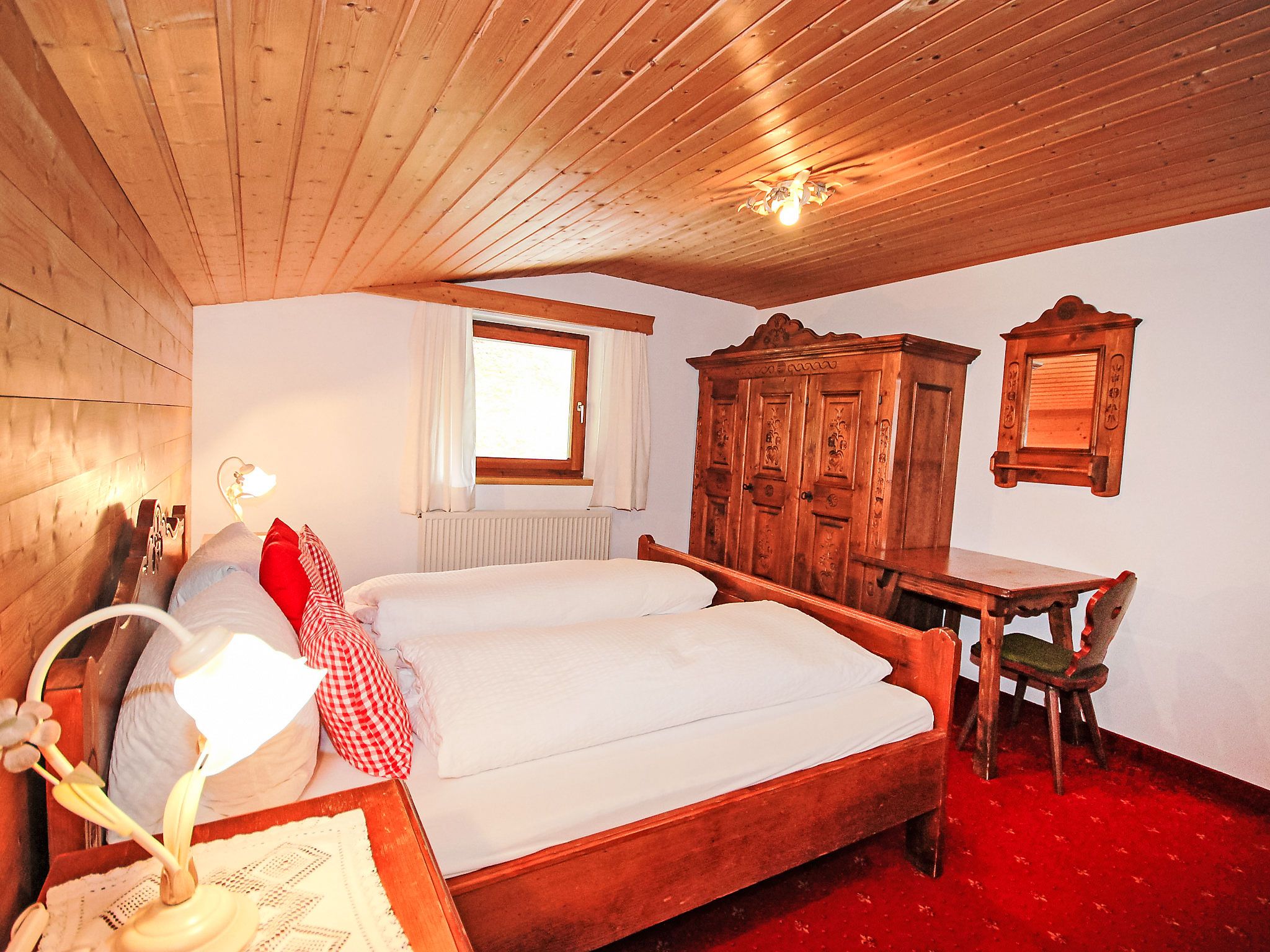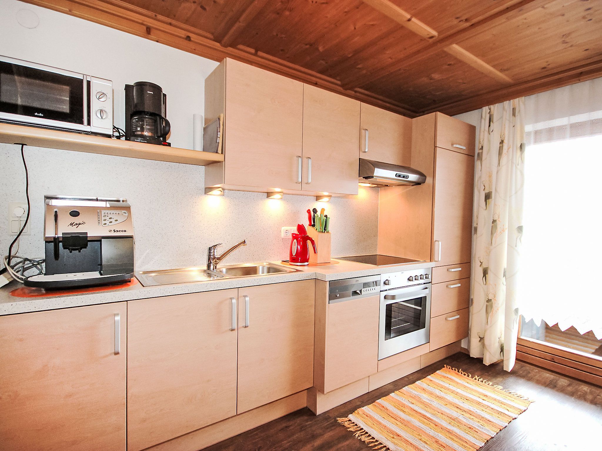 5-Zimmer-Wohnung 100 m2 im 1. Stock. Geräumig, schön und gemütlich eingerichtet: Eingang. Wohn-/Esszimmer mit Essecke und Sat-TV (Flachbildschirm). Ausgang zum Balkon. 1 Zimmer mit 1 Bett, 1 Doppelbett und Waschbecken. 2 Doppelzimmer, jedes Zimmer mit Waschbecken und Dusche. Wohnküche (Backofen, Geschirrspüler, 4 Glaskeramikplatten, Toaster, Wasserkocher, Mikrowelle) mit Esstisch, Radio und CD. Ausgang zum Balkon. Sep. WC, Bad/Dusche/WC. Balkon. Balkonmöbel. Herrliche Panoramasicht auf die Berge und das Tal. Zur Verfügung: Haartrockner. Internet (Wireless LAN, gratis). Bitte beachten: Rauchmelder. Kaffeevollautomat und Filterkaffeemaschine vorhanden.