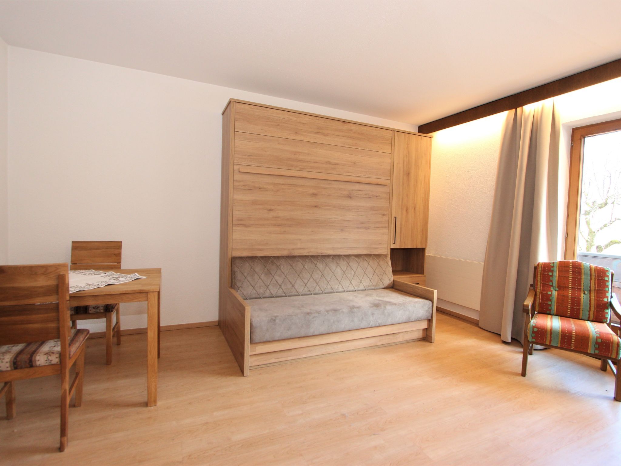 1-Zimmer-Wohnung 35 m2, im Erdgeschoss. Rustikal und gemütlich eingerichtet: grosses Wohn-/Schlafzimmer mit 1 Doppelwandklappbett (2 x 90 cm, Länge 200 cm), Esstisch und Sat-TV (Flachbildschirm). Ausgang zum Balkon. Kochnische im Eingang (Backofen, 4 Glaskeramikplatten, elektrische Kaffeemaschine). Bad, sep. WC. Balkon, Ostlage. Balkonmöbel. Schöne Sicht auf die Berge und die Landschaft. Zur Verfügung: Internet (WLAN). Bitte beachten: Nichtraucher-Unterkunft. Maximal 1 Haustier/Hund erlaubt. Das 2023 neu gefertigte Kombi-Wandklappbett ist sehr hochwertig und bietet besten Schlafkomfort in der Nacht und gleichzeitig einen gemütlichen Wohnkomfort während des Tages.
