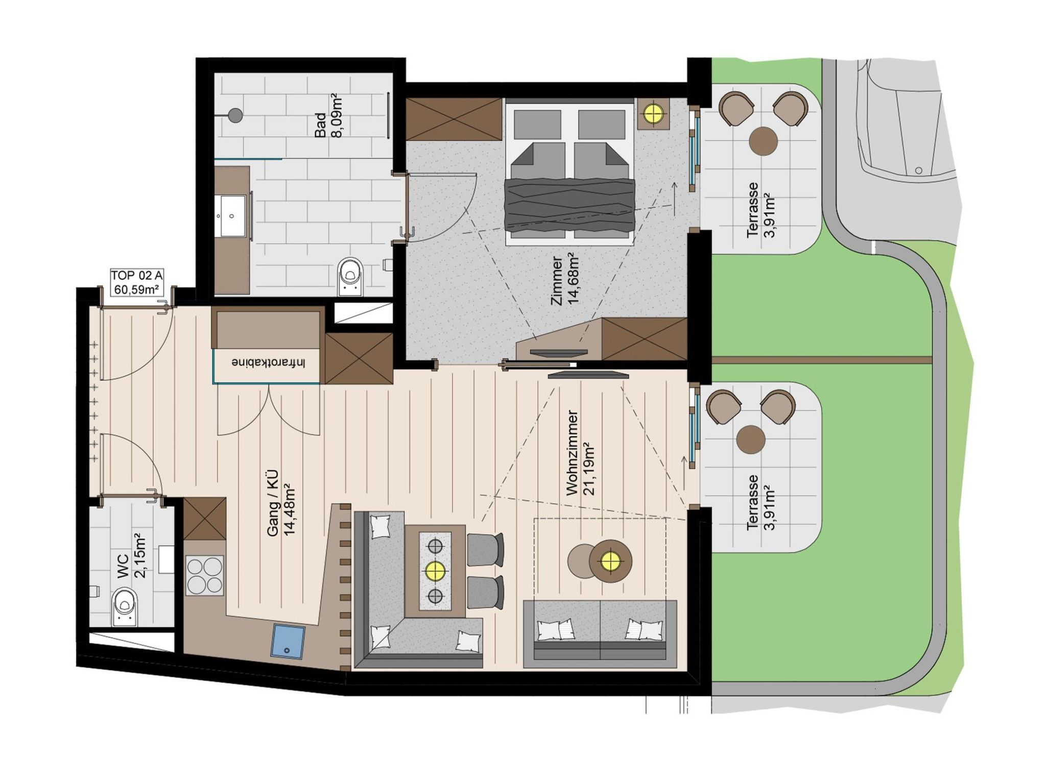Premium mit IR-Sauna, 2-Zimmer-Landhaus 60 m2. Hell, modern und geschmackvoll eingerichtet: Wohn-/Schlafzimmer mit 1 Doppeldiwanbett, Esstisch und Sat-TV (Flachbildschirm). 1 Doppelzimmer. Offene Küche (Backofen, Geschirrspüler, 4 Glaskeramikplatten, Toaster, Wasserkocher, Mikrowelle, elektrische Kaffeemaschine). Dusche/WC. Terrasse 8 m2. Terrassenmöbel. Schöne Sicht auf die Landschaft. Zur Verfügung: Sauna, Haartrockner. Internet (Wireless LAN, gratis). Bitte beachten: Nichtraucher-Unterkunft. Beim Mietobjekt handelt es sich um ein Typenhaus bzw. Um eine Typenwohnung. Die Sauna ist eine Infrarotkabine.