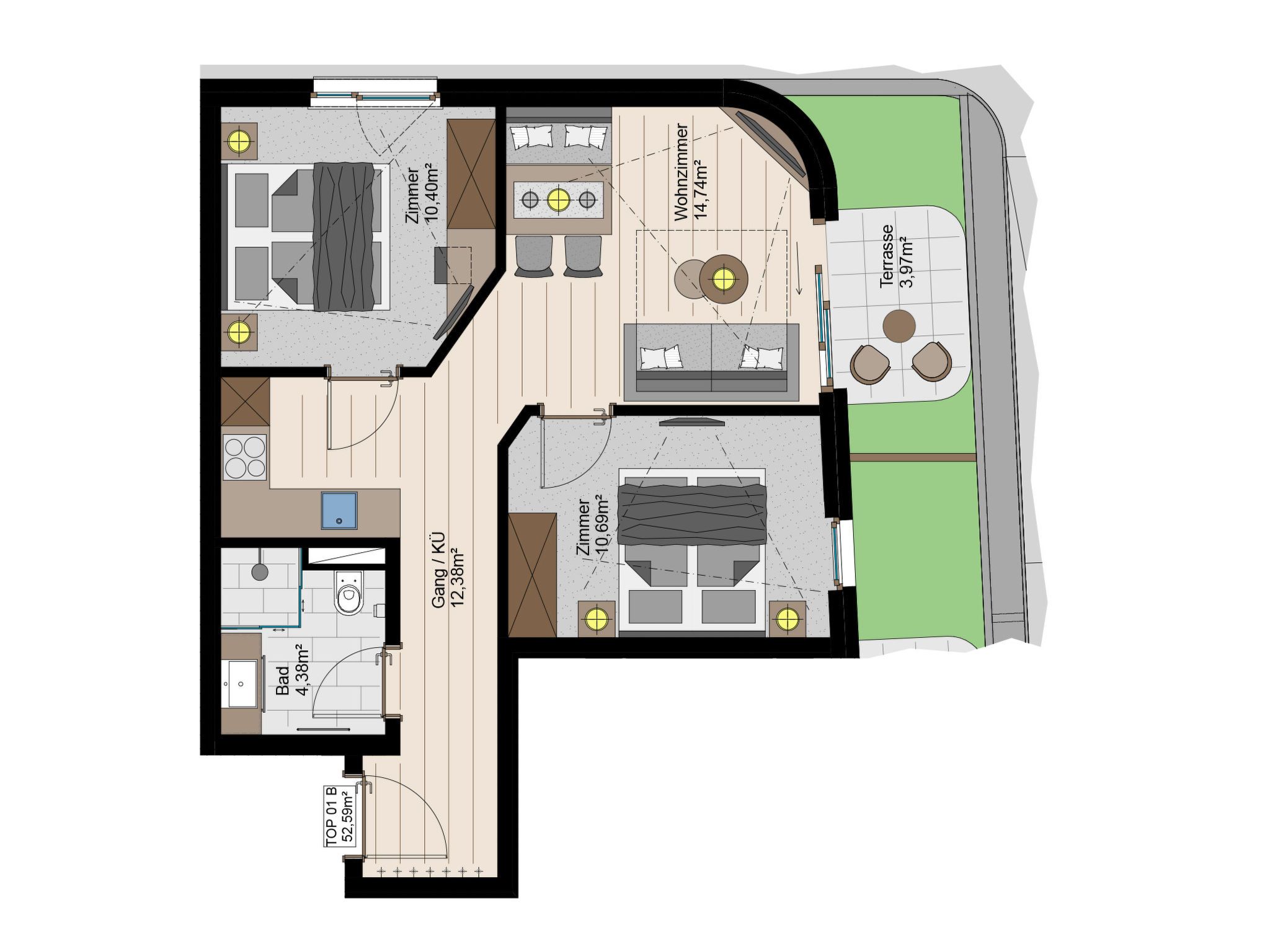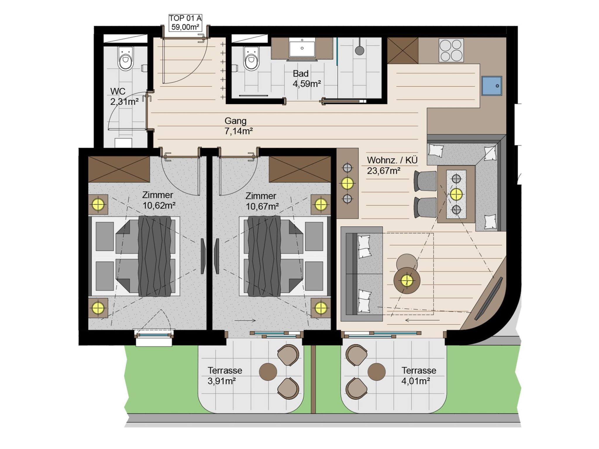 Superior mit 2 Schlafzimmer 6P, 3-Zimmer-Wohnung 59 m2. Modern und geschmackvoll eingerichtet: Wohn-/Esszimmer mit Essecke und Sat-TV (Flachbildschirm). 1 Doppelzimmer. 1 Zimmer mit 1 Diwanbett und 1 Doppelbett. Kochnische (Backofen, Geschirrspüler, 4 Glaskeramikplatten, Toaster, Wasserkocher, Mikrowelle, elektrische Kaffeemaschine). Dusche/WC. Terrasse 8 m2. Terrassenmöbel. Schöne Sicht auf die Landschaft. Zur Verfügung: Haartrockner. Internet (WLAN, gratis). Bitte beachten: Nichtraucher-Unterkunft. Maximal 1 Haustier/Hund erlaubt. Beim Mietobjekt handelt es sich um ein Typenhaus bzw. Um eine Typenwohnung.