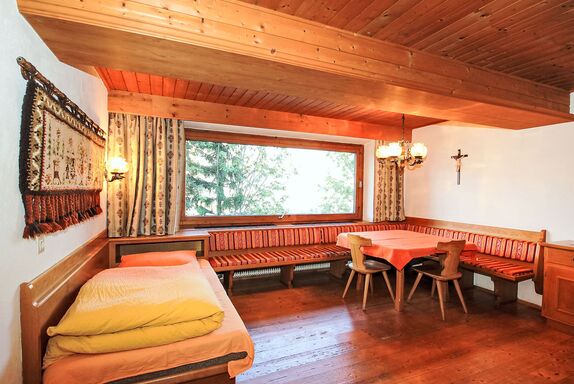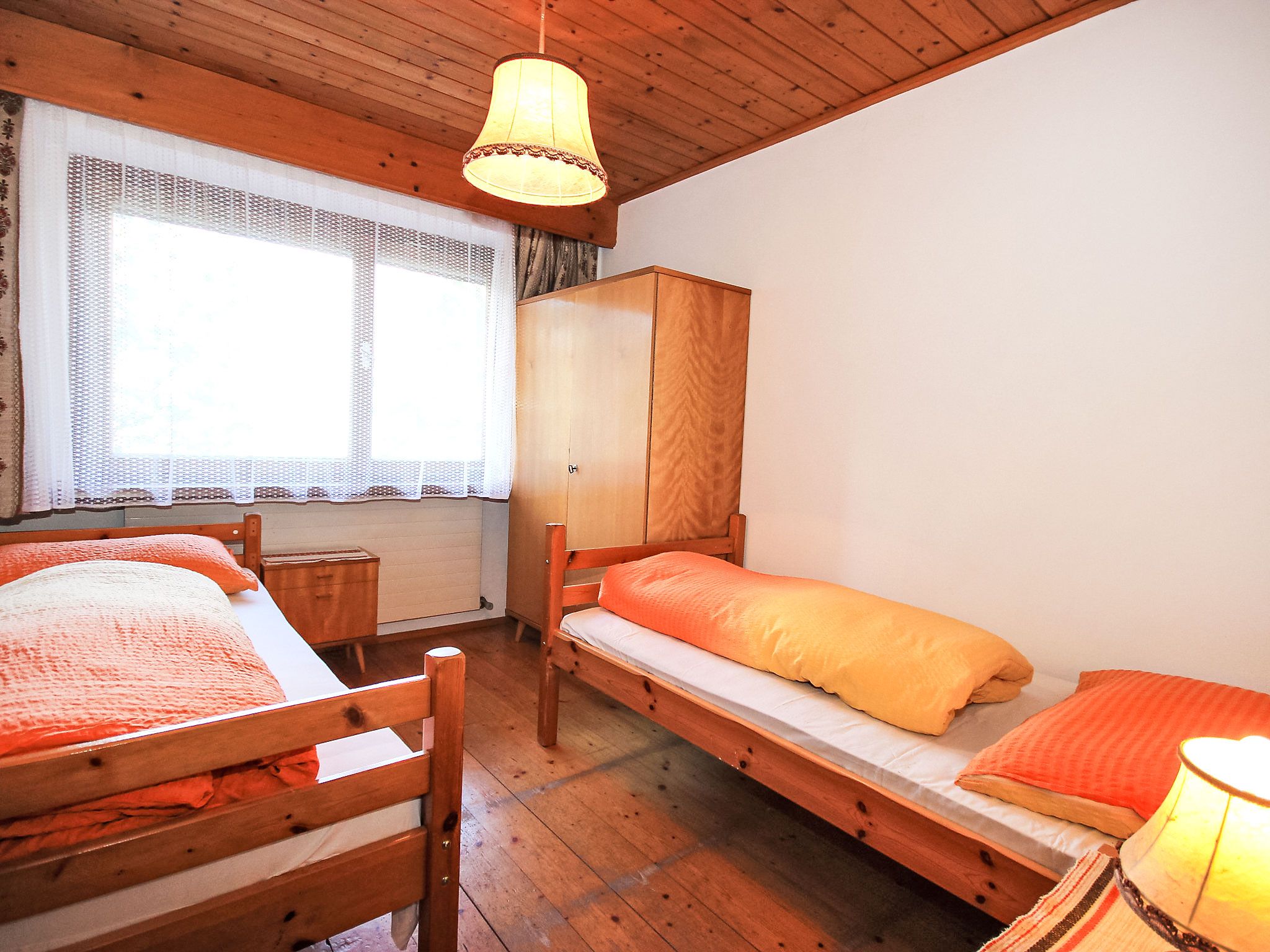 3-Zimmer-Wohnung 60 m2, im Erdgeschoss. Geräumig, einfach eingerichtet: Eingang. 1 Doppelzimmer. 1 Zimmer mit 2 Betten. Wohnzimmer mit 1 Diwanbett, Essecke und Sat-TV. Kochnische (4 Kochplatten, Backofen, Geschirrspüler). Bad, sep. WC. Gartensitzplatz. Sehr schöne Sicht auf die Berge und das Tal. Zur Verfügung: Internet (Wireless LAN, gratis). Bitte beachten: Nichtraucher-Unterkunft. Maximal 2 Haustiere/Hunde erlaubt. Eigener Eingang. Aufgrund der Lage ist die Wohnung im Sommer kühl. Haustiere sind nur im Sommer erlaubt. Keine Haustiere im Winter.