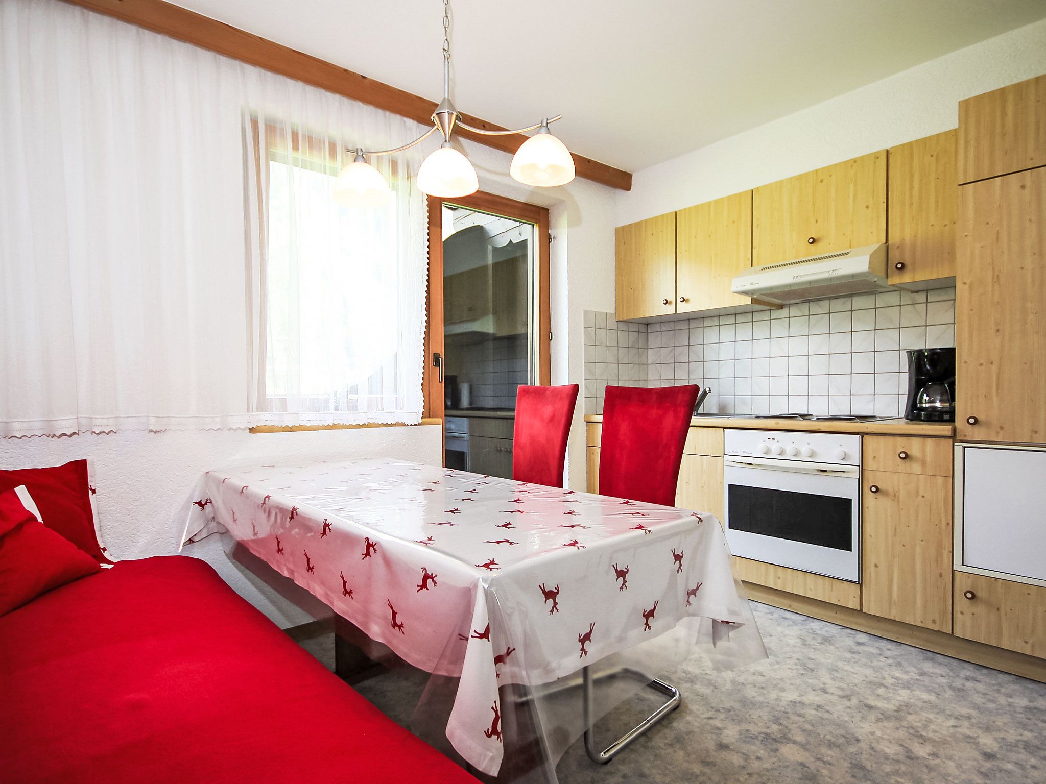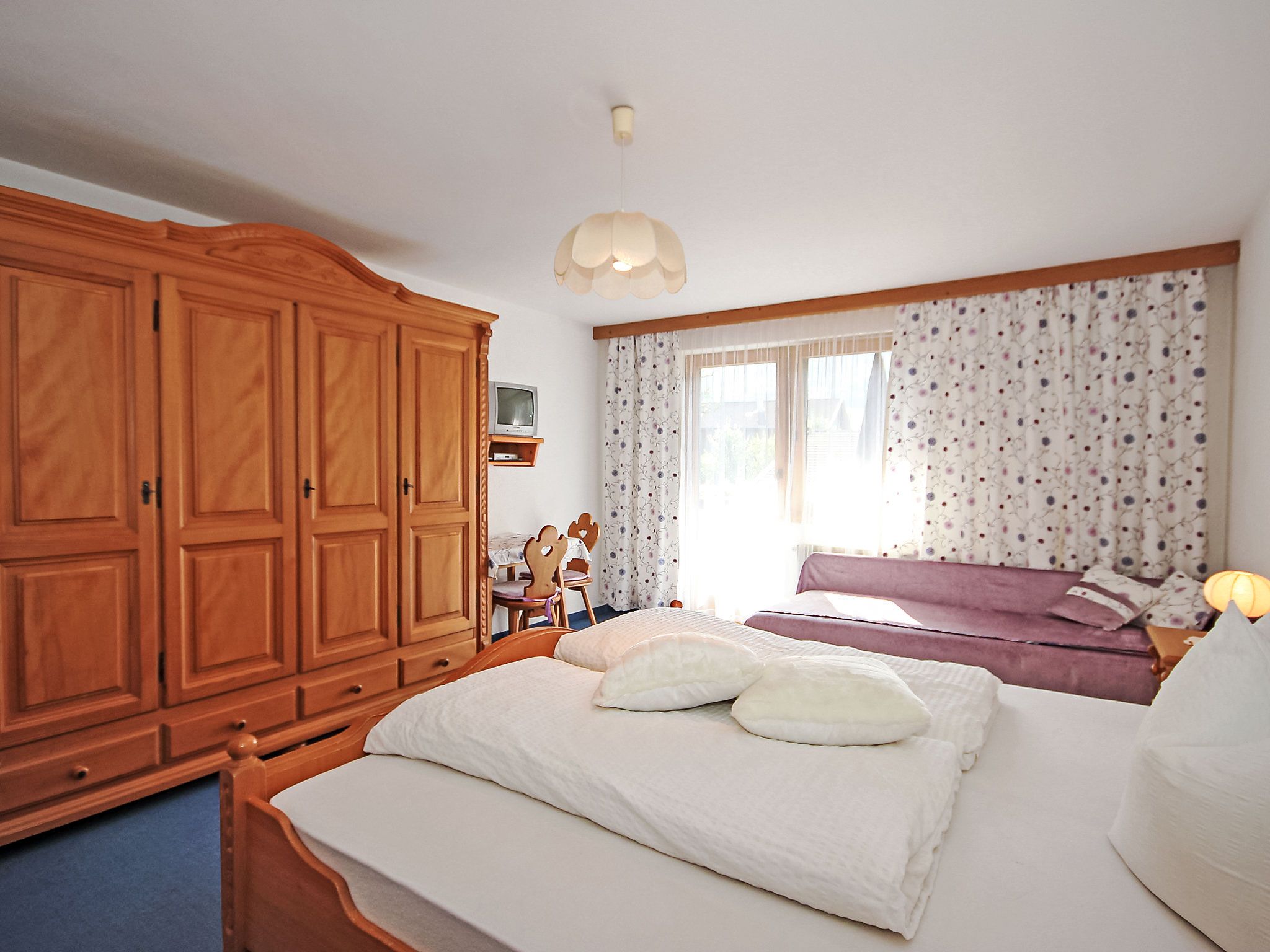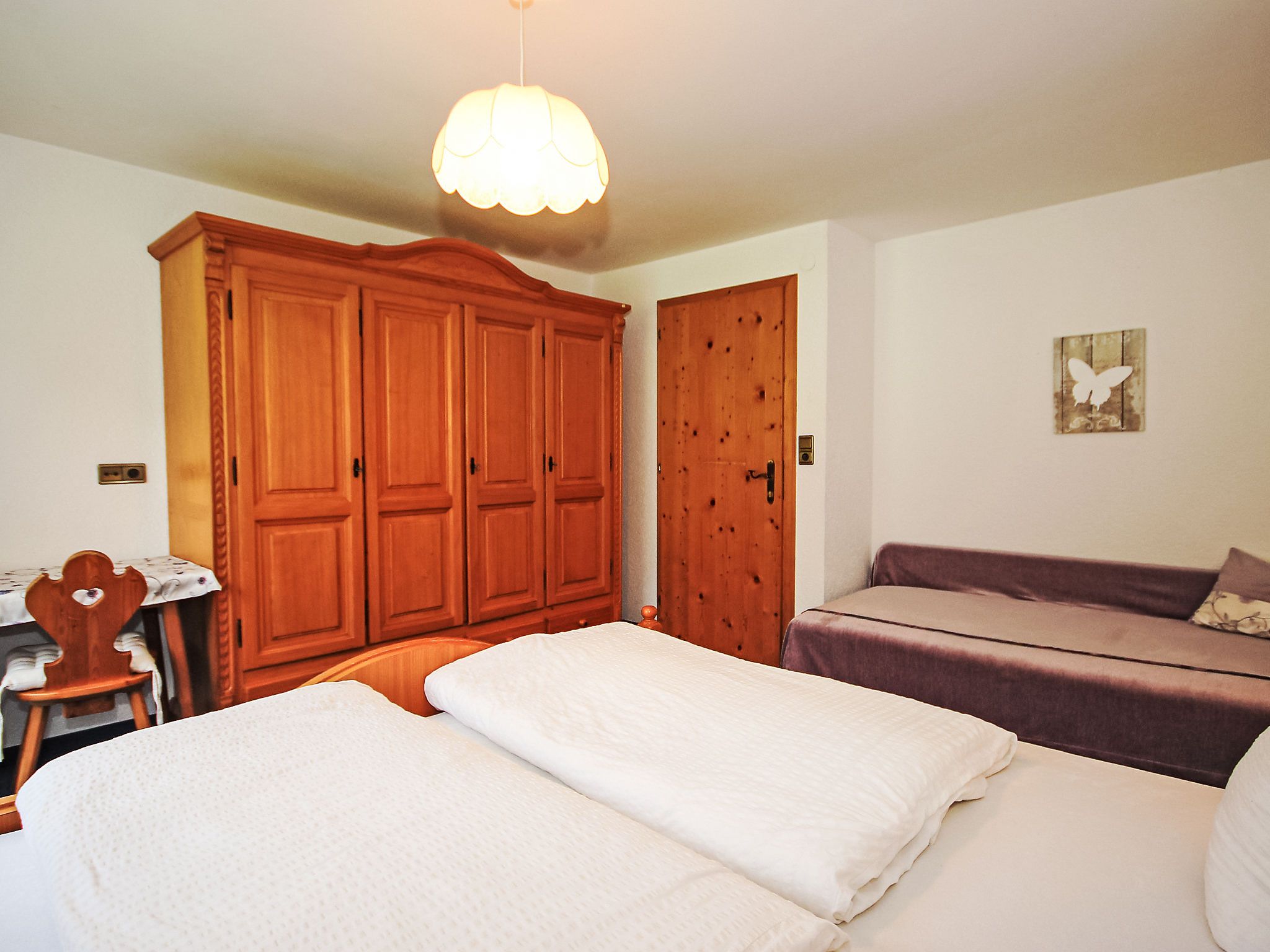 3-Zimmer-Wohnung 75 m2 im 2. Stock. Gemütlich eingerichtet: Eingang. 1 Zimmer mit 1 Diwanbett, 1 Doppelbett, Dusche/WC und Sat-TV (Flachbildschirm). Ausgang zum Balkon. 1 Zimmer mit 1 Diwanbett, 1 Doppelbett und Sat-TV (Flachbildschirm). Ausgang zum Balkon. Kleine Wohnküche (4 Kochplatten, Backofen, Geschirrspüler) mit Esstisch. Ausgang zum Balkon. Dusche/WC. 2 Balkone 10 m2. Balkonmöbel, Liegestühle. Schöne Sicht auf die Berge, den Garten und die Landschaft. Bitte beachten: Nichtraucher-Unterkunft.
