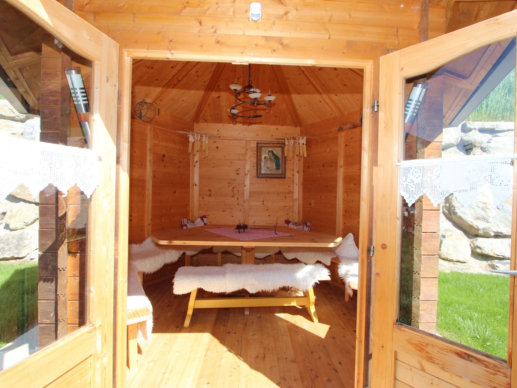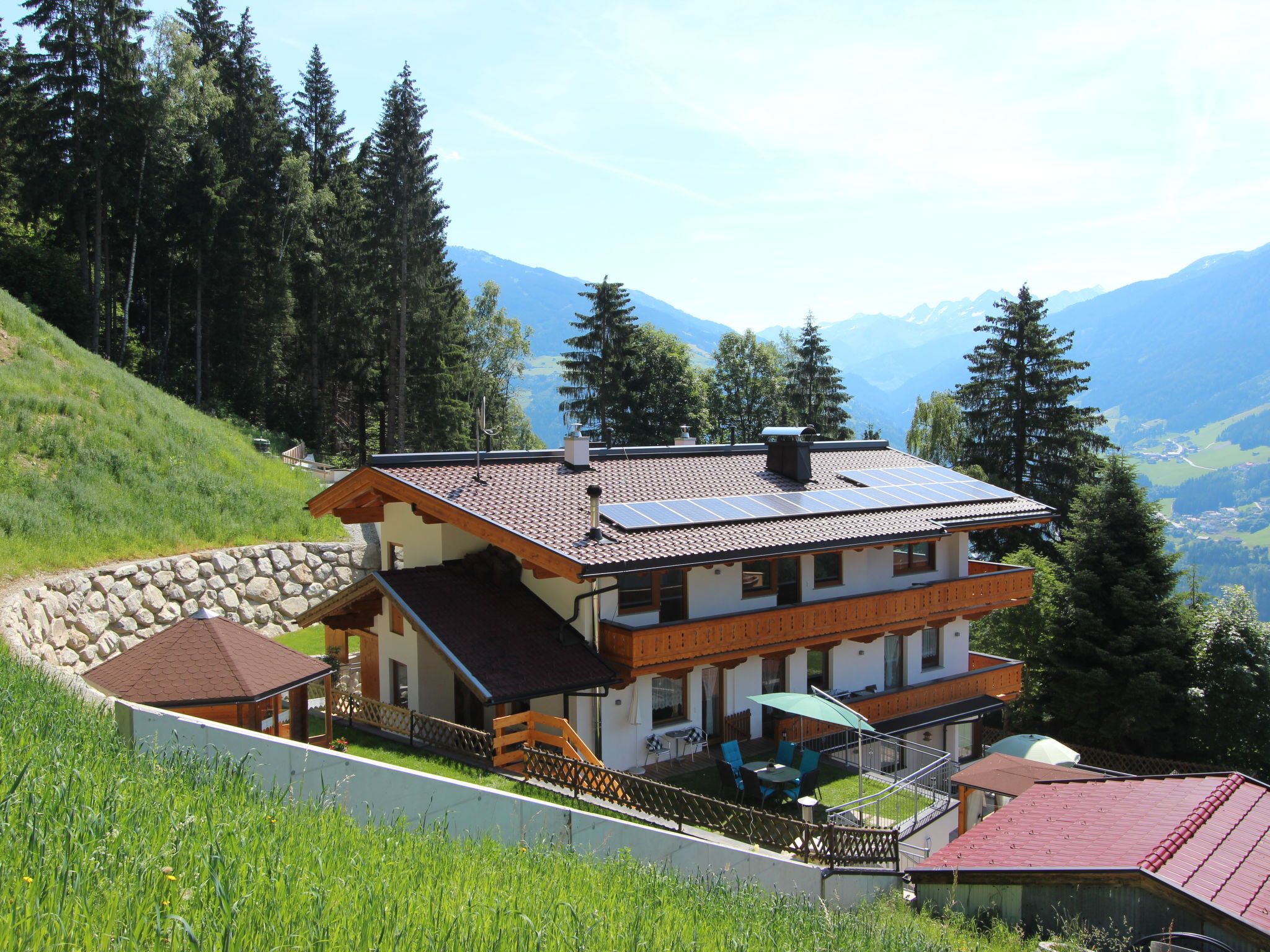 Zellberg 4 km von Zell am Ziller: Mit einem einzigartigen Wellnessbereich ausgestattetes, komfortables Landhaus Anita, 960 m.ü.M.. Oberhalb von Zell am Ziller, im Ortsteil Zellberg, 4.5 km vom Zentrum, ruhige, sonnige, erhöhte Lage am Hang, 6 km vom Skigebiet. Zur Mitbenutzung: schöner, gepflegter terrassierter Garten, 100 m2, Liegewiese. Sprudelbad, Laube, Gartenmöbel. Im Hause: Wireless LAN, Sauna, Dampfbad, Wellnessbereich, Einstellraum für Fahrräder, Skiraum, Zentralheizung, Skischuhtrockner. Zufahrt bis zum Haus. Im Winter bitte Schneeketten mitbringen. Parkplatz (überdacht, beschränkte Anzahl) beim Haus. Supermarkt 4.5 km, Restaurant 1.3 km, Bushaltestelle 4.5 km, Bahnstation 4.5 km, Freibad 4.5 km. Gondelbahn 6 km, Skibushaltestelle 10 m. Bekannte Skigebiete sind gut erreichbar: Zillertal Arena 6 km, Ski-Zillertal-3000 8 km. Bitte beachten: Gratis Skibus. Weitere Unterkünfte sind buchbar. Öffnungszeiten Wellness 17:00 bis 21:00 Uhr. Dampfbad Aqua Life, eine Zedern Holzwanne, die mit reinem Quellwasser gefüllt und auf 35 - 40 Grad aufgeheizt. Gartenpavillon.
