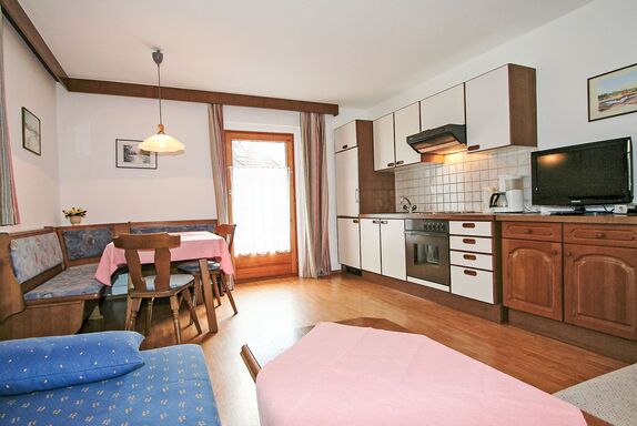 3-Zimmer-Wohnung 55 m2 im 1. Stock. Gemütlich eingerichtet: 1 Doppelzimmer. Ausgang zum Balkon. 1 Zimmer mit 1 Diwanbett und 1 Doppelbett. Ausgang zum Balkon. Wohnküche (4 Kochplatten, Backofen, Geschirrspüler, Wasserkocher, elektrische Kaffeemaschine) mit 1 Doppeldiwanbett, Essecke und Sat-TV (Flachbildschirm). Ausgang zum Balkon. Dusche, sep. WC. Balkon 10 m2. Terrassenmöbel. Schöne Sicht auf die Berge. Zur Verfügung: Internet (Wireless LAN, extra). Bitte beachten: Rauchmelder. Aufpreis vor Ort für die 6. und 7. Person nur auf Anfrage (Zusatzbetten): Im Winter: EUR 25.00/Person/Tag. Im Sommer: EUR 15.00/Person und Tag.