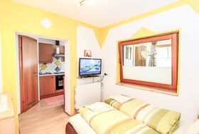 2-Zimmer-Wohnung 42 m2, im Erdgeschoss. Objekt geeignet für 2 Erwachsene + 2 Kinder. Geschmackvoll und gemütlich eingerichtet: Eingang. 1 Doppelzimmer. Wohn-/Schlafzimmer mit 1 Doppeldiwanbett und Kabel-TV (Flachbildschirm). Offene Küche (4 Kochplatten, Backofen, Geschirrspüler, Toaster, Wasserkocher, Mikrowelle) mit Esstisch, Radio. Dusche/WC. Gartensitzplatz. Terrassenmöbel, Abstellkammer. Schöne Sicht auf die Berge und die Landschaft. Zur Verfügung: Haartrockner. Internet (Wireless LAN). Bitte beachten: geeignet für Familien. Eigener Eingang.
