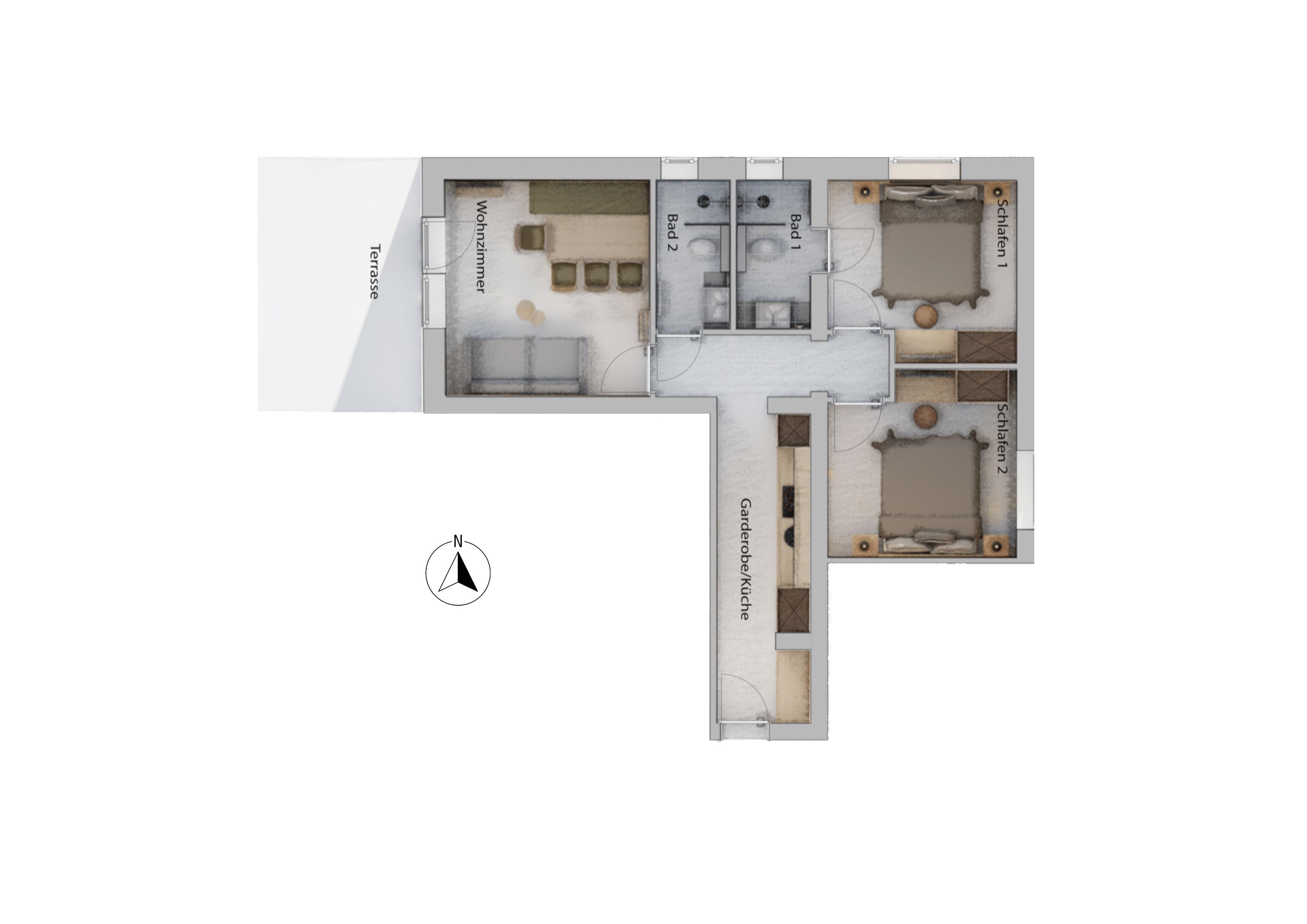 NEU: Appartement 1 mit ca. 55 m² im Erdgeschoss: Vorraum mit Garderobe; separate Küche mit 4-Platten-Herd, Spülmaschine, Mikrowelle, Filterkaffeemaschine, Teekocher, Toaster, Geschirr, Kochutensilien uvm.; 2 Badezimmer mit Dusche/WC; 2 Schlafzimmer mit Doppelbetten; ein Wohn-Esszimmer mit zusätzlicher Schlafmöglichkeit. Geniessen Sie die Sonne auf der südseitigen Terrasse.