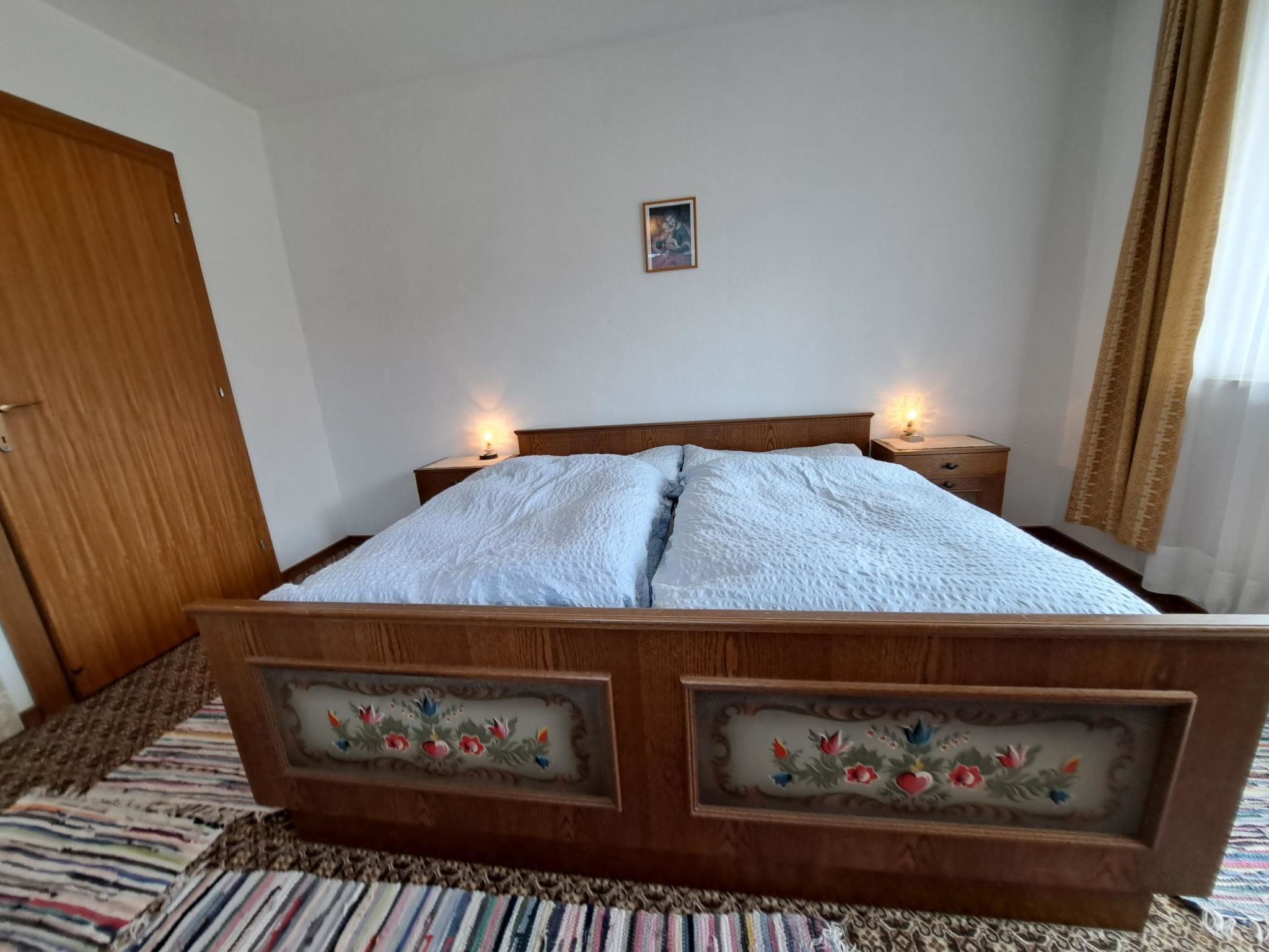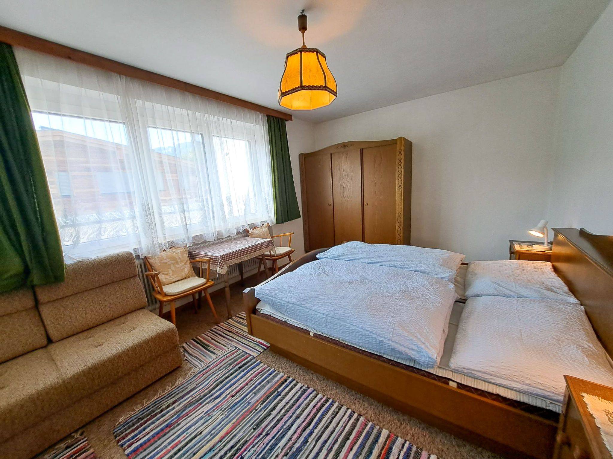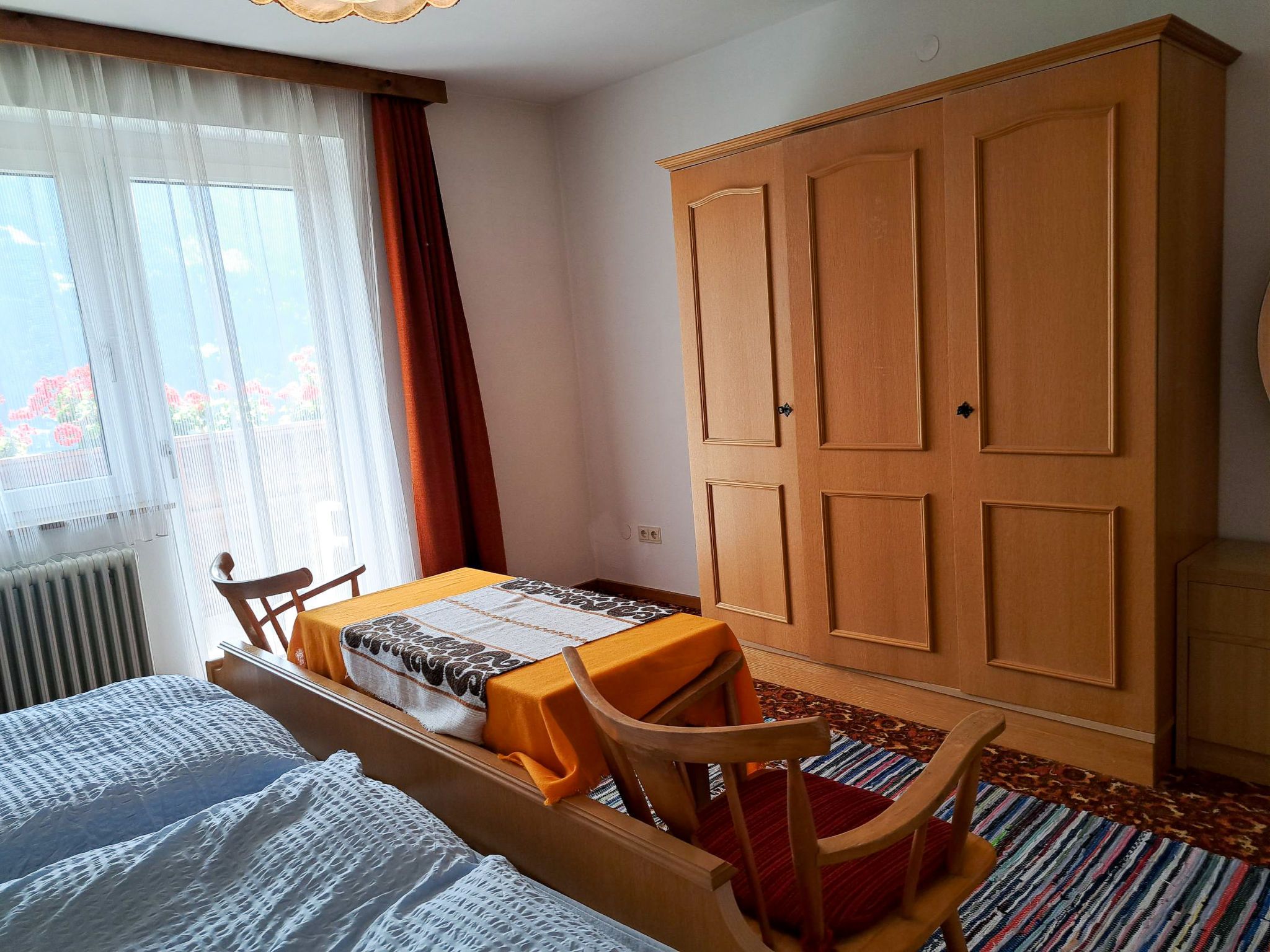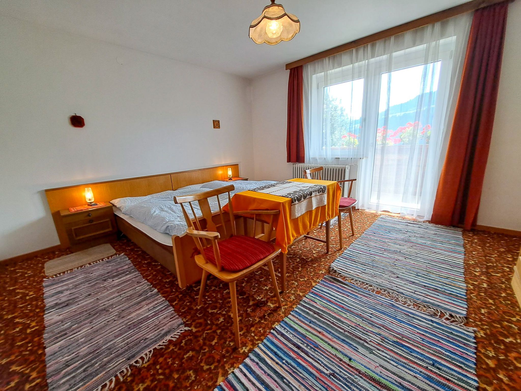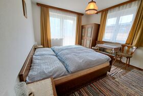 Straif, 4-Zimmer-Wohnung 100 m2, im Erdgeschoss. Einfach und zweckmässig eingerichtet: 1 Doppelzimmer mit Waschbecken. Ausgang zum Balkon. 1 Zimmer mit 1 x 2 Etagenbetten (90 cm, Länge 190 cm), Waschbecken. 1 Doppelzimmer mit Waschbecken. Grosse Wohnküche (4 Kochplatten, Backofen, Wasserkocher, elektrische Kaffeemaschine) mit Essecke. Ausgang zum Balkon. Bad, sep. WC. Grosser Balkon, Südlage und Südwestlage. Balkonmöbel. Sicht auf die Berge und die Landschaft. Zur Verfügung: Telefon. Internet (WLAN, gratis).