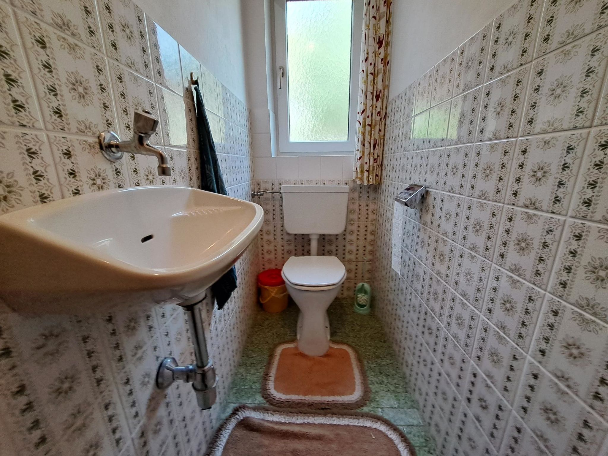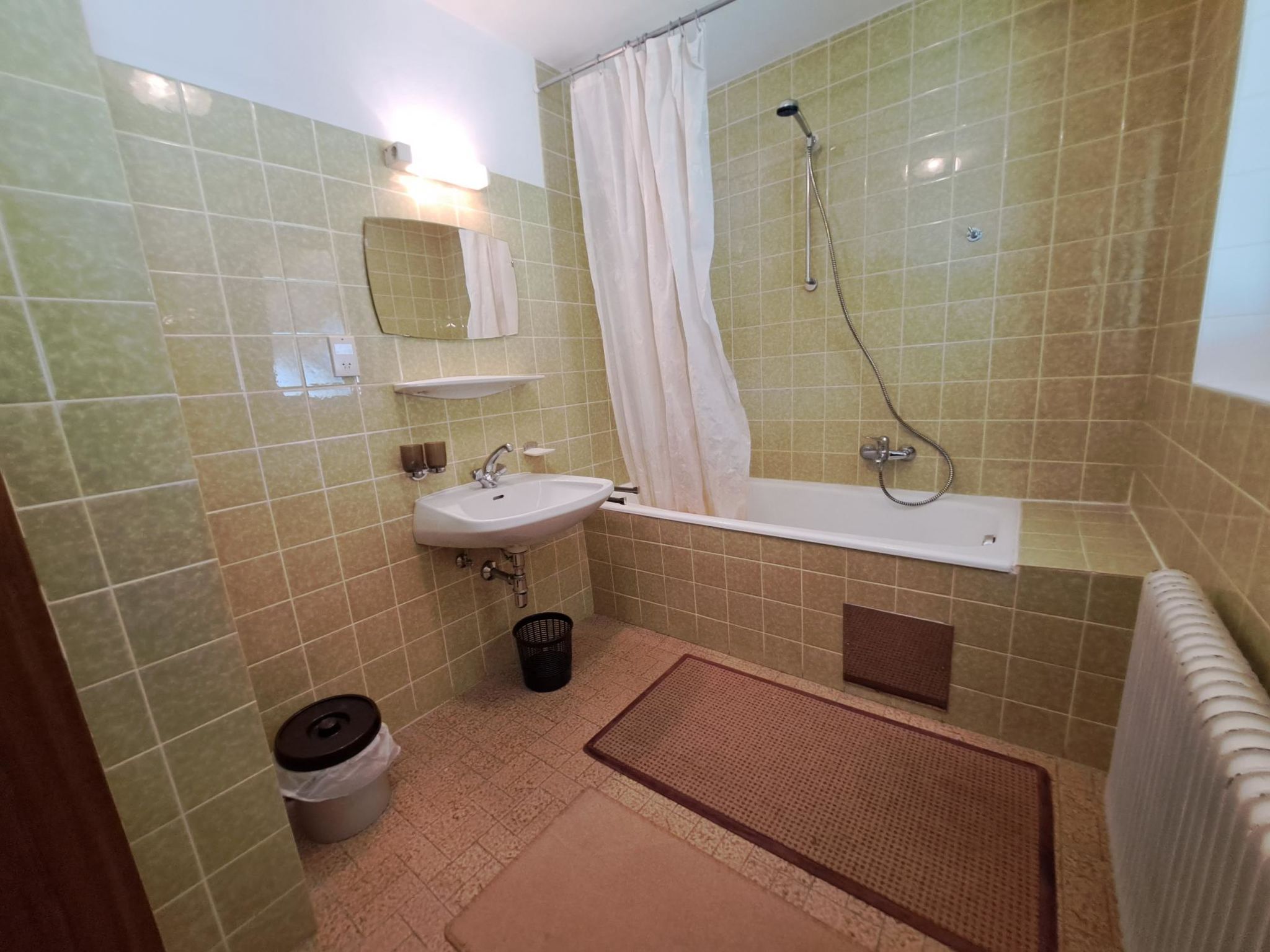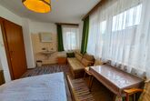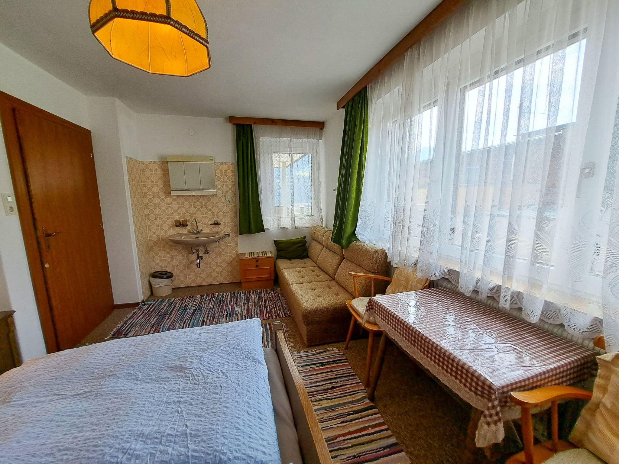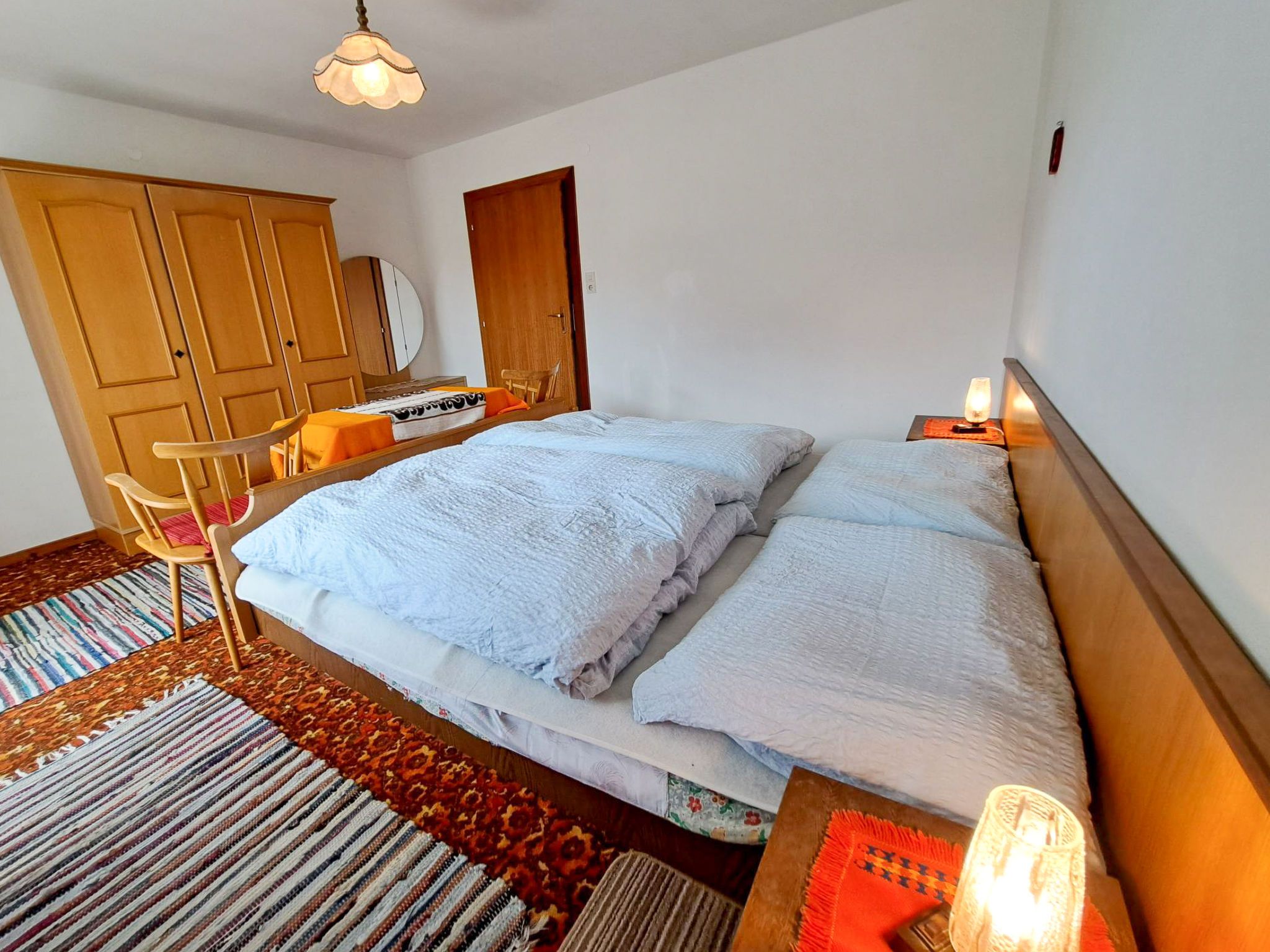 Straif, 4-Zimmer-Wohnung 100 m2, im Erdgeschoss. Einfach und zweckmässig eingerichtet: 1 Doppelzimmer mit Waschbecken. Ausgang zum Balkon. 1 Zimmer mit 1 x 2 Etagenbetten (90 cm, Länge 190 cm), Waschbecken. 1 Doppelzimmer mit Waschbecken. Grosse Wohnküche (4 Kochplatten, Backofen, Wasserkocher, elektrische Kaffeemaschine) mit Essecke. Ausgang zum Balkon. Bad, sep. WC. Grosser Balkon, Südlage und Südwestlage. Balkonmöbel. Sicht auf die Berge und die Landschaft. Zur Verfügung: Telefon. Internet (WLAN, gratis).