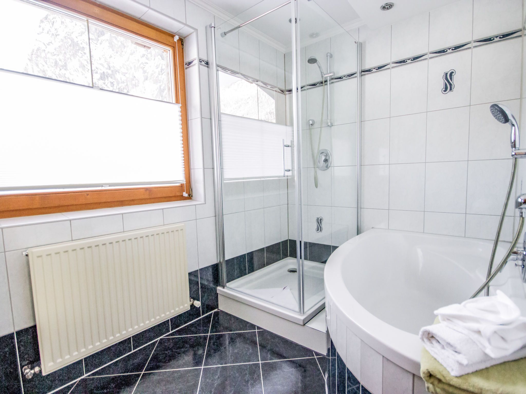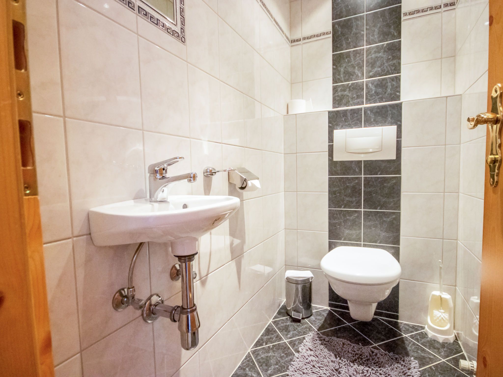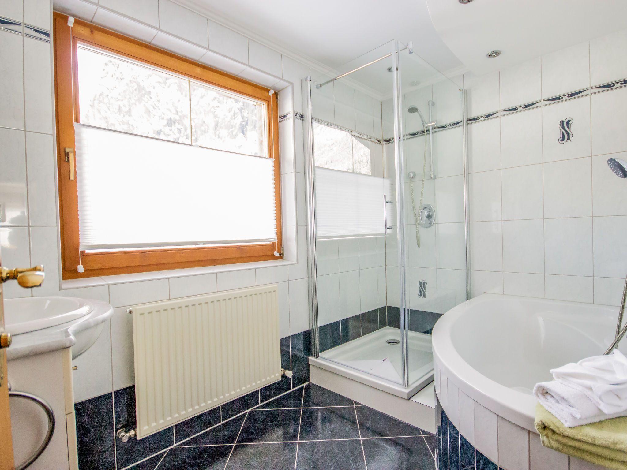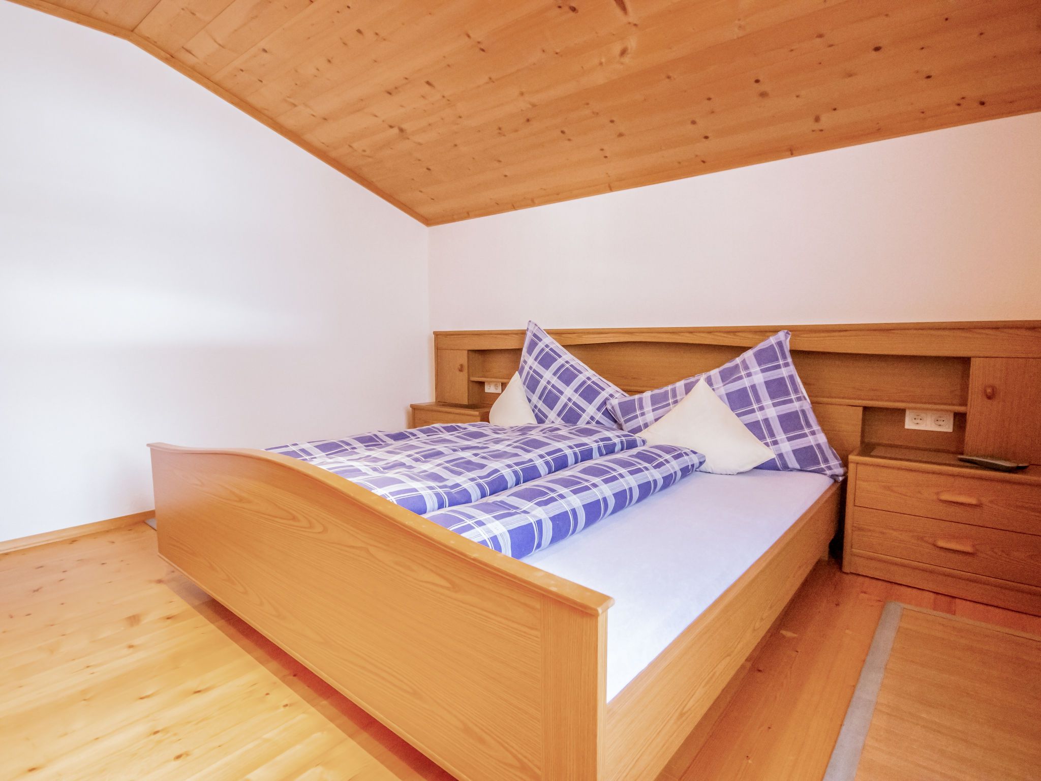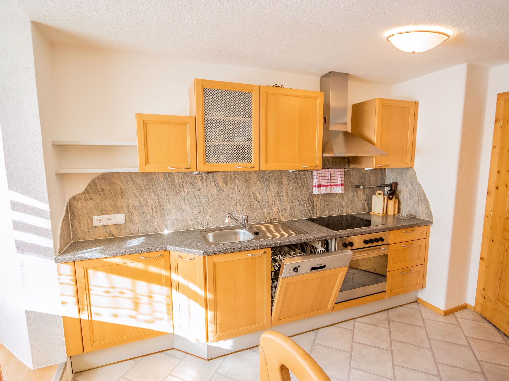 Anna, 4-Zimmer-Wohnung 85 m2 im 1. Stock. Eingang. 1 Doppelzimmer. 1 Zimmer mit 1 Doppelbett (160 cm, Länge 200 cm). Wohnzimmer mit 1 Doppeldiwanbett und TV (Flachbildschirm). Ausgang zum Balkon. Grosse Küche (Backofen, Geschirrspüler, 4 Glaskeramikplatten, Tiefkühler, elektrische Kaffeemaschine) mit Esstisch. Ausgang zum Balkon. Bad/Dusche, sep. WC.