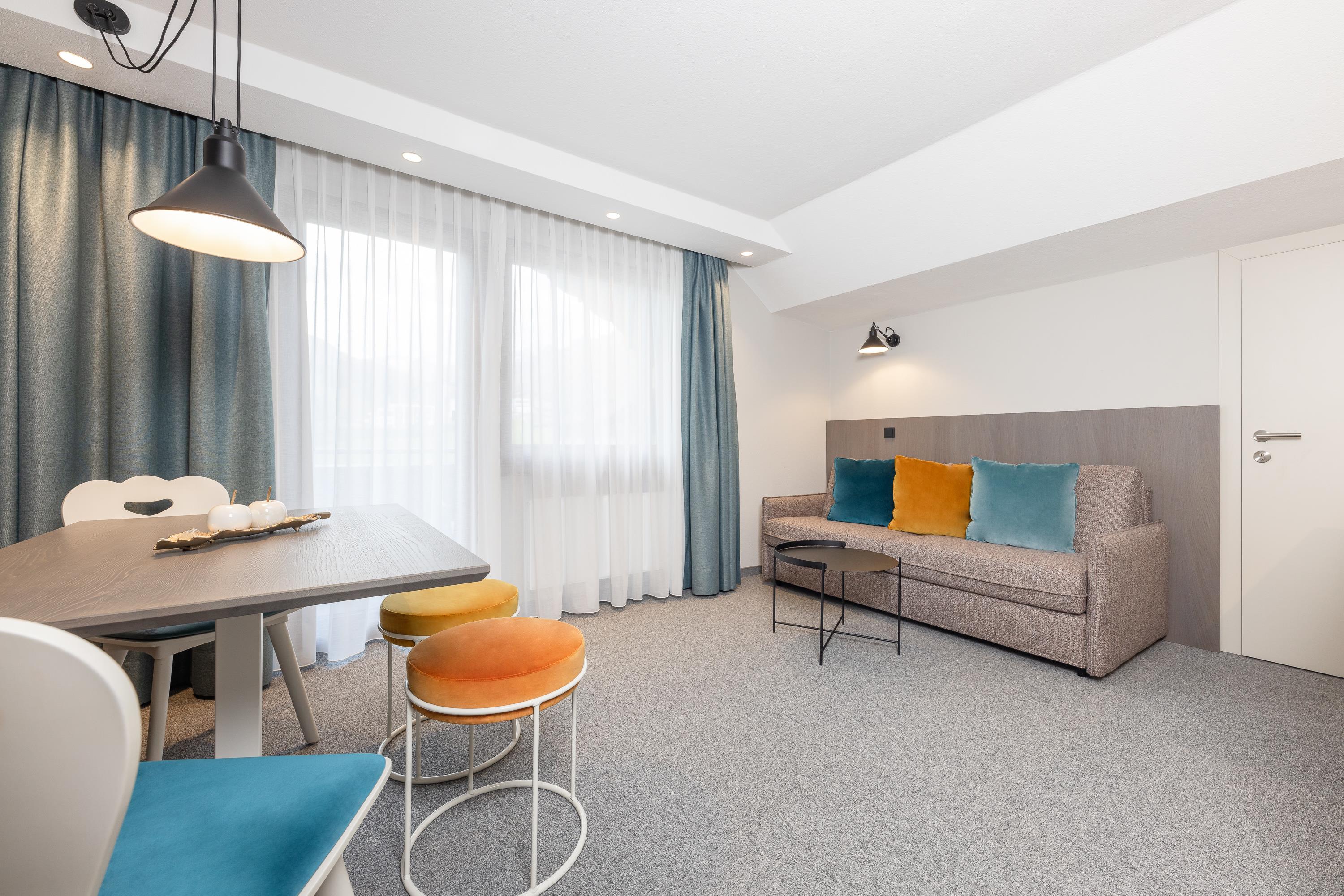 Appartement 9 mit ca. 45 m² im 2. Obergeschoss: Eingangsbereich mit Garderobe und Küche (4-Platten-Herd, Mikrowelle, Spülmaschine, Filterkaffeemaschine, Teekocher, Toaster, Geschir, Kochutensilien usw.); 1 Badezimmer mit Dusche/WC; 1 separate Toilette; 1 Schlafzimmer mit Doppelbett; Wohnraum mit Essplatz und 2 zusätzlichen Schlafmöglichkeiten; Südbalkon für erholsame Stunden.