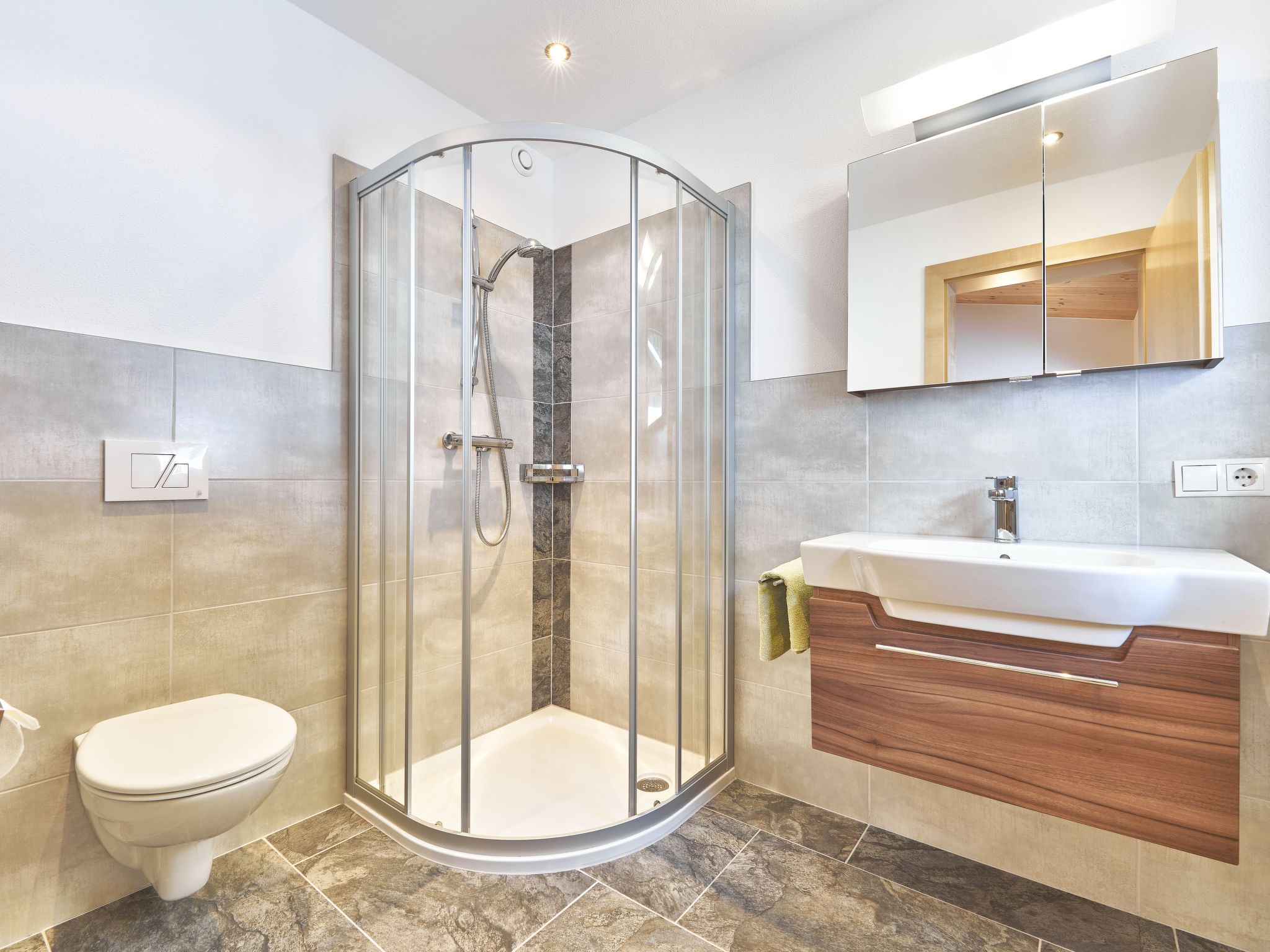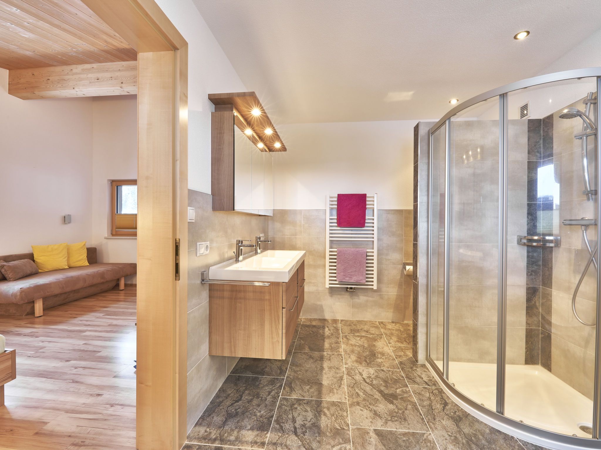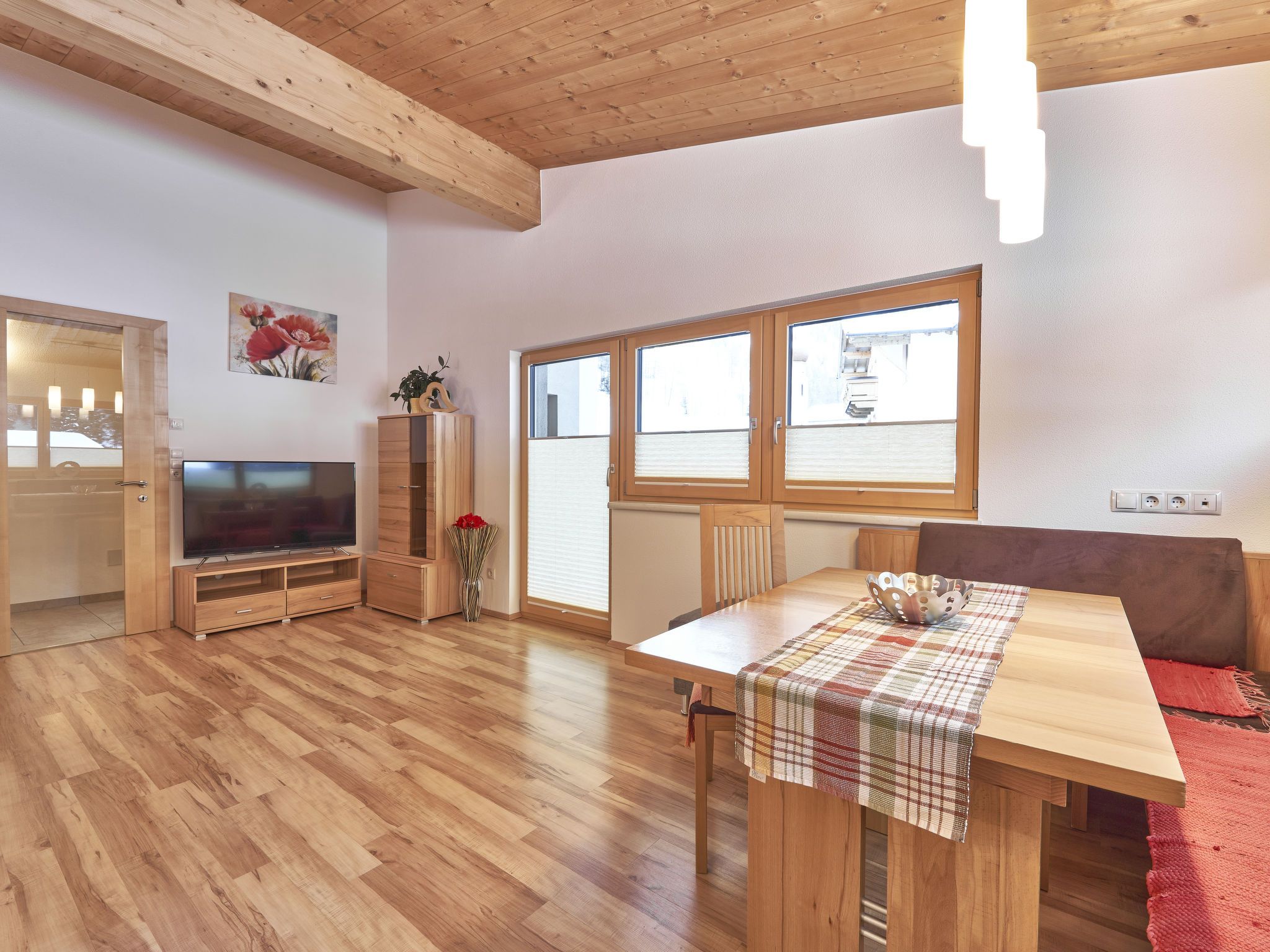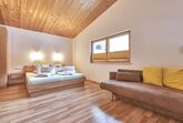 3-Zimmer-Wohnung 82 m2 im 1. Stock. Geschmackvoll eingerichtet: Eingang. 1 Zimmer mit 1 Doppeldiwanbett, 1 Doppelbett, Bad/Dusche/WC, Doppelwaschbecken und Sat-TV. 1 Doppelzimmer mit Dusche/WC und TV-Anschluss. Wohn-/Esszimmer mit Sat-TV. Ausgang zum Balkon. Offene Küche (Backofen, Geschirrspüler, 4 Glaskeramikplatten, Tiefkühler, elektrische Kaffeemaschine). Balkon, Terrasse. Terrassenmöbel, Gartengrill. Schöne Panoramasicht auf die Berge und die Landschaft. Zur Verfügung: Haartrockner. Internet (WLAN, extra). Bitte beachten: Nichtraucher-Unterkunft. Maximal 1 Haustier/Hund erlaubt.