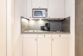 Appartement 10 mit ca. 30 m² im 2. Obergeschoss: kleiner Vorraum mit Küche (2-Platten-Herd, Mikrowelle, Spülmaschine, Filterkaffeemaschine, Teekocher, Toaster, Geschirr, Kochutensilien usw.); 1 Badezimmer mit Dusche/WC; 1 Schlafzimmer mit Doppelbett; Wohnraum mit Essplatz und 1 zusätzlichen Schlafmöglichkeit; Appartement ohne Balkon.