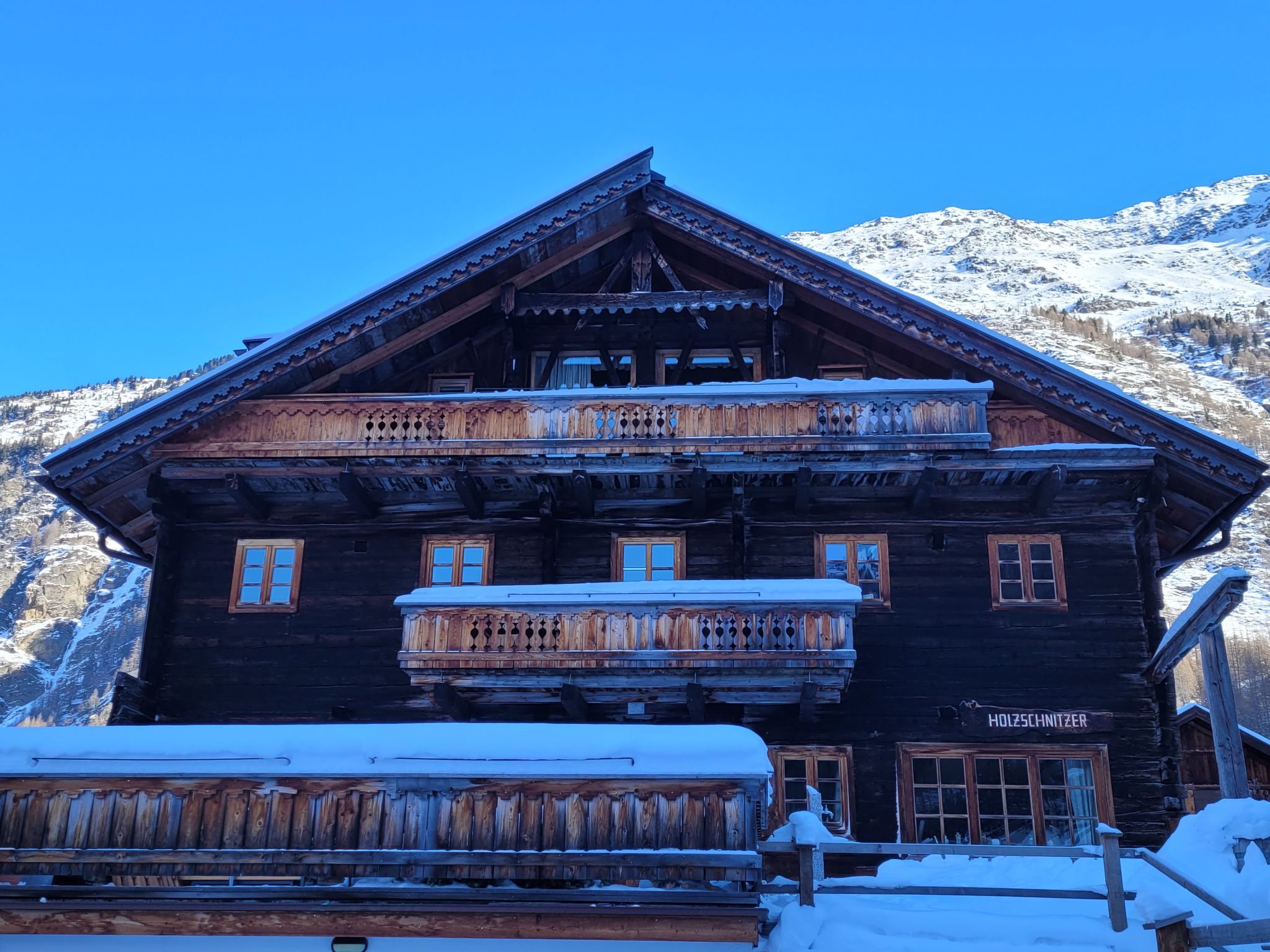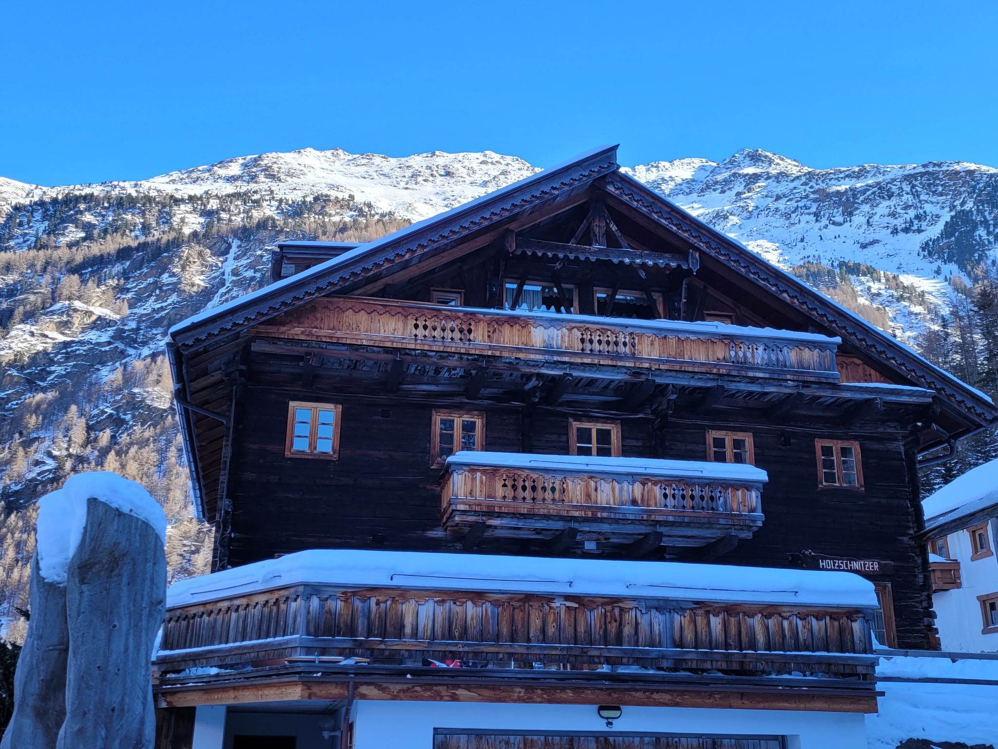 Zwieselstein 4 km von Sölden: Das 300 Jahre alte renovierte Chalet Beim Holzschnitzer. Am Ortsrand, 300 m vom Zentrum von Zwieselstein, 4 km vom Skigebiet. Zur Mitbenutzung: Terrasse. Im Hause: Skiraum, Zentralheizung, Waschmaschine (zur Mitbenutzung, extra), Skischuhtrockner. Brötchenservice auf Anfrage (extra). Parkplatz. Lebensmittelgeschäft 4 km, Restaurant 200 m, Bushaltestelle 20 m, Bahnstation 42 km, Hallenbad 5 km, Thermalbad Aqua Dome Längenfeld 18 km. Golfplatz (18 Loch) 40 km, Gondelbahn 4 km, Skibushaltestelle 20 m, Langlaufloipe 100 m. Nahe gelegene Sehenswürdigkeiten: Outdoor Park 'Area 47' in 40 km, Ötzidorf Umhausen 27 km, Klettersteig Stuibenfall 31 km, NEU: 007 Elements James Bond Museum. Bekannte Skigebiete sind gut erreichbar: Sölden 4 km, Obergurgl 9 km, Vent 13 km. Bekannte Seen in der Umgebung sind gut erreichbar: Piburger See 35 km. Bitte beachten: Gratis Skibus. Der gratis Skibus fährt zum Skigebiet Sölden, Hochgurgl, Vent. Bitte beachten: Weitere Unterkünfte sind buchbar. Im Haus befindet sich eine Schnitzerwerkstatt mit Galerie. Regionale Spezialitäten in 100m im Gampe Ladele der Familie.