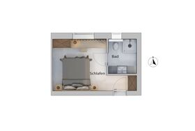 Economy Doppelzimmer mit ca. 20 m² im Erdgeschoss: kleiner Vorraum mit Garderobe und Schrank; 1 Badezimmer mit Dusche/WC; 1 Schlafzimmer mit Doppelbett. Doppelzimmer ohne Balkon.
