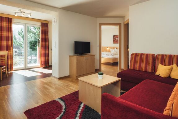 3-Zimmer-Wohnung 68 m2, unteres Geschoss. Komfortabel und geschmackvoll eingerichtet: 2 Doppelzimmer. Wohnzimmer mit 1 Doppeldiwanbett, Kabel-TV und Kachelofen. Offene Küche (Geschirrspüler, 4 Glaskeramikplatten, Mikrowelle) mit Esstisch. Ausgang zur Terrasse. 2 Duschen/WC, sep. WC. Terrasse. Terrassenmöbel. Zur Verfügung: Safe, Haartrockner. Internet (Wireless LAN, gratis). Bitte beachten: Nichtraucher-Unterkunft. Rauchmelder.