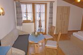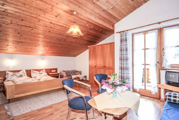 4-Zimmer-Wohnung 100 m2, im Dachgeschoss. Gemütlich eingerichtet: Eingang. 3 Doppelzimmer, jedes Zimmer mit Dusche/WC und Sat-TV. Ausgang zum Balkon. Wohnküche (4 Kochplatten, Geschirrspüler, Wasserkocher, Tiefkühler, elektrische Kaffeemaschine, Kombinationsmikrowelle) mit Essecke und Dusche/WC. Schöne Sicht auf die Berge und die Landschaft. Zur Verfügung: Internet (WLAN, gratis). Bitte beachten: Nichtraucher-Unterkunft. Maximal 1 Haustier/Hund erlaubt.