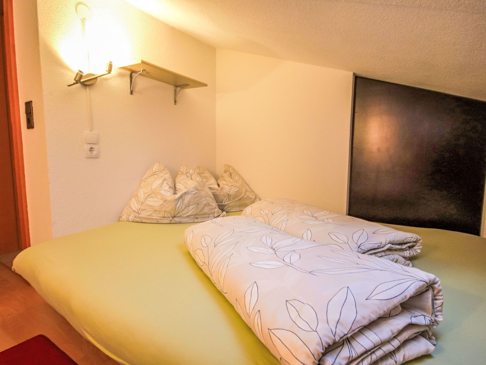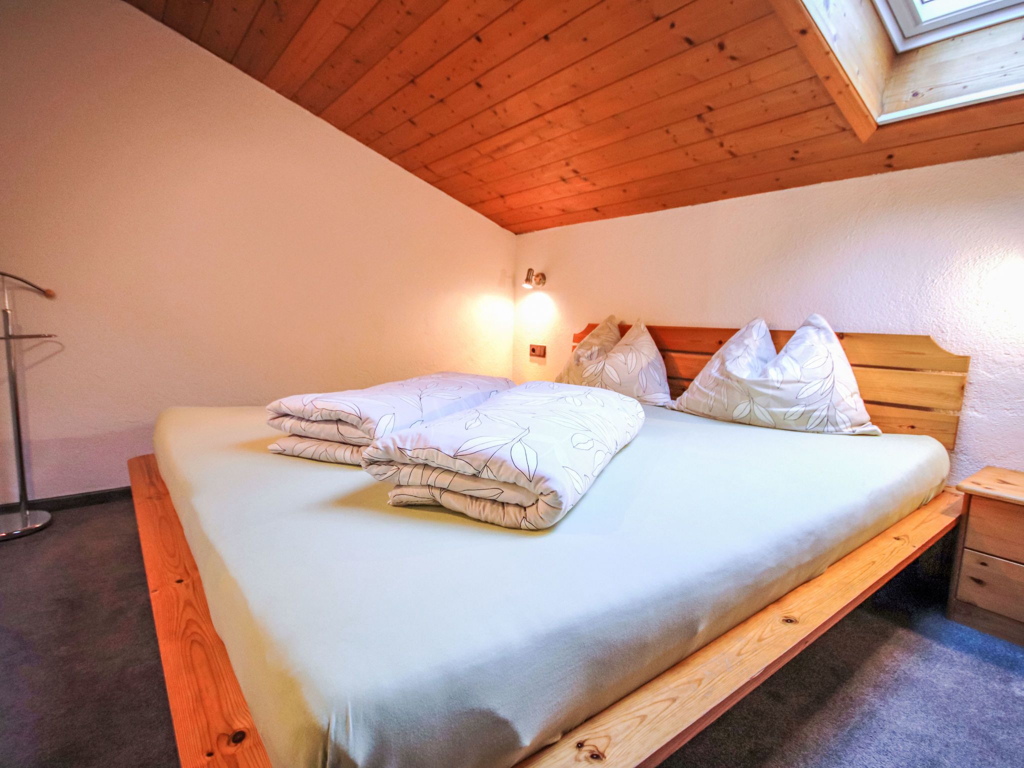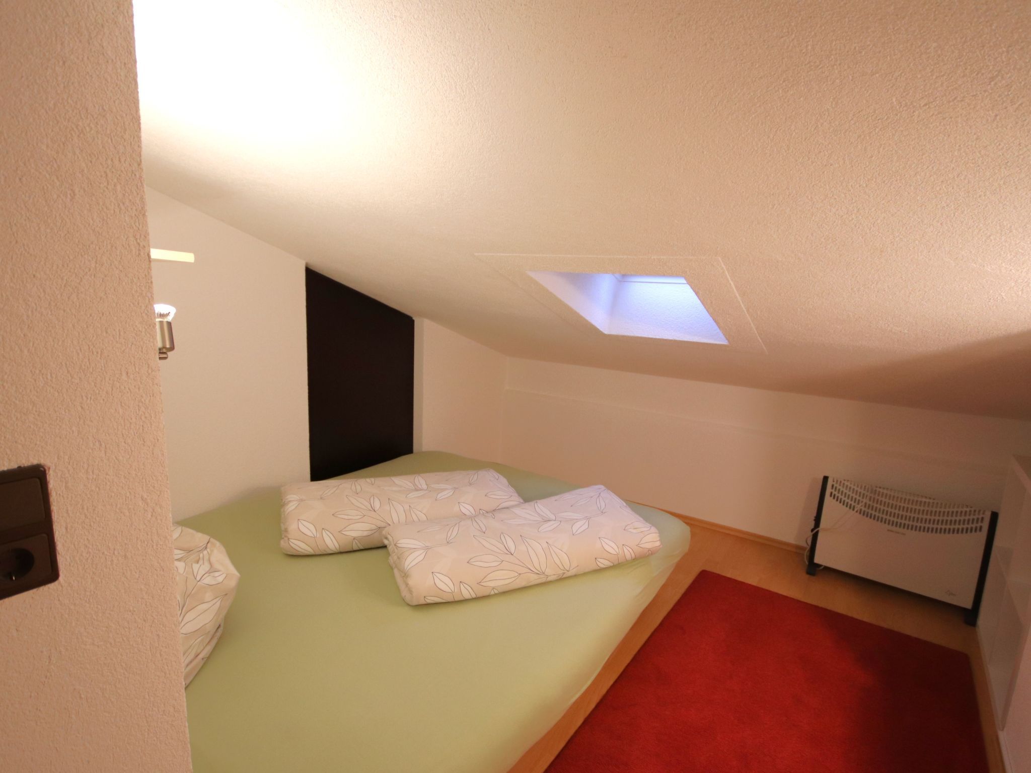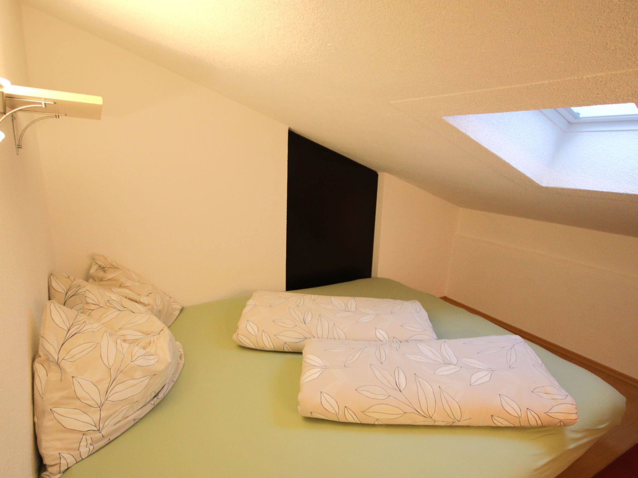 4-Zimmer-Wohnung 65 m2, im Dachgeschoss. Abgeschrägt, geschmackvoll eingerichtet: Eingang. 1 Doppelzimmer. 1 kleines Zimmer mit 1 franz. Bett (140 cm). 1 kleines Zimmer mit 1 franz. Bett (160 cm). Grosses Wohnzimmer mit Sat-TV und Radio. Offene Küche (Backofen, Geschirrspüler, 4 Glaskeramikplatten, Mikrowelle) mit Esstisch. Bad/Dusche/WC. Abstellkammer. Sicht auf die Berge. Zur Verfügung: Internet (Wireless LAN, gratis). Bitte beachten: Nichtraucher-Unterkunft. Rauchmelder. Sehr niedrige Raumhöhe im Zimmer mit französischem Bett.