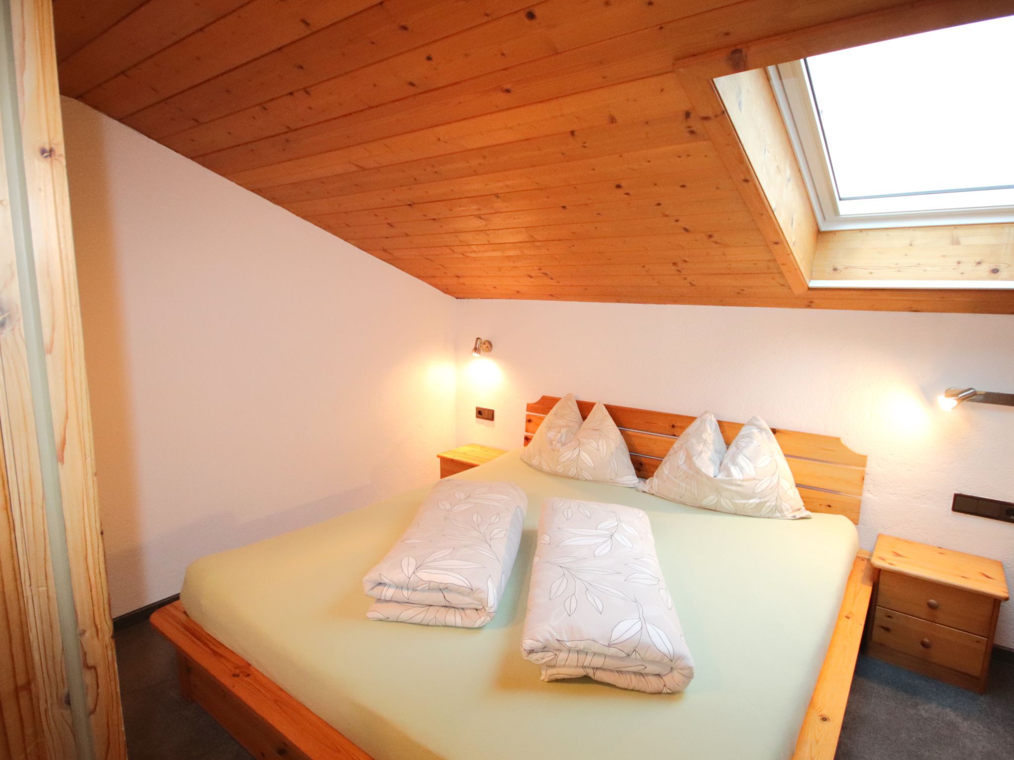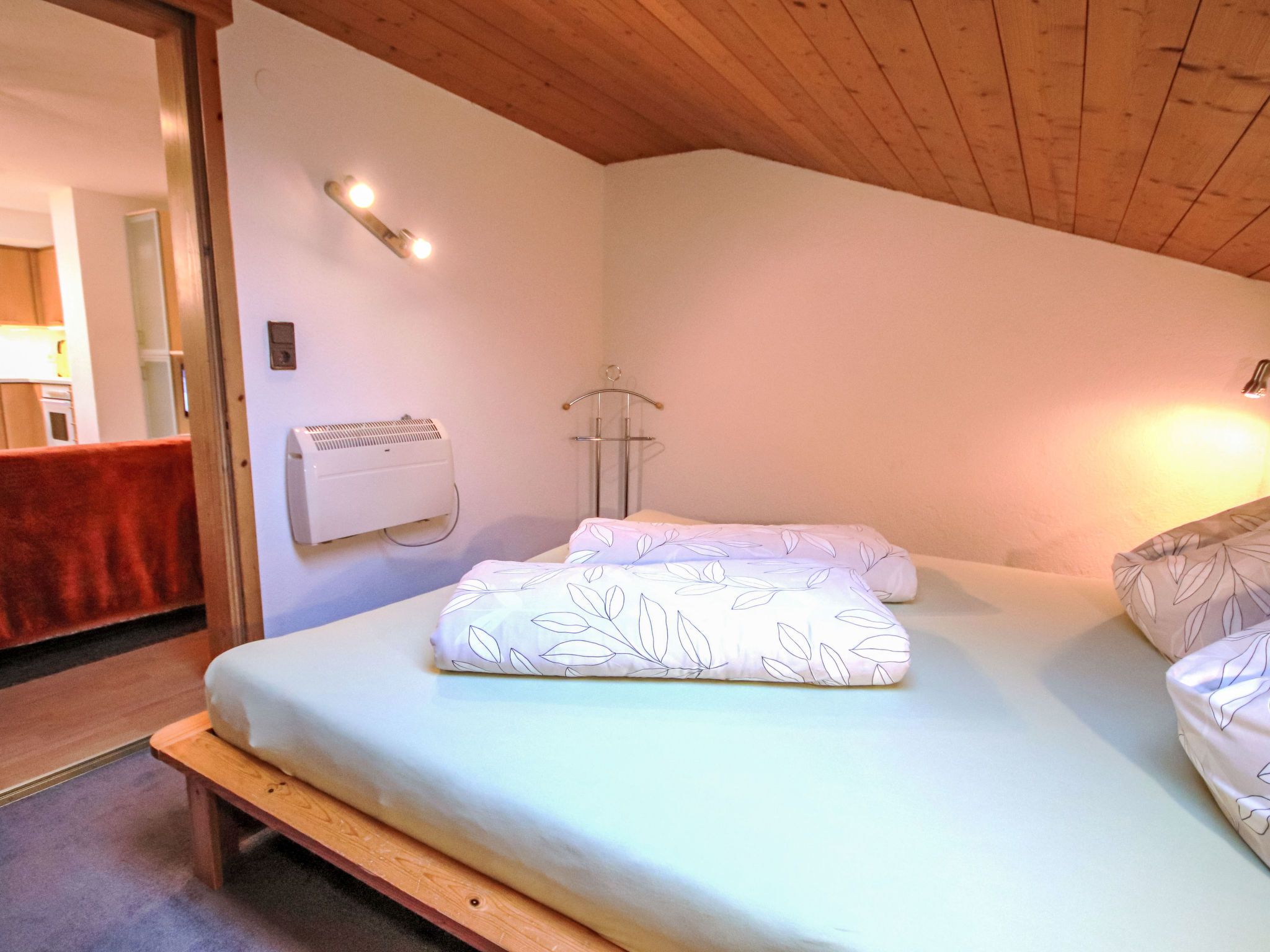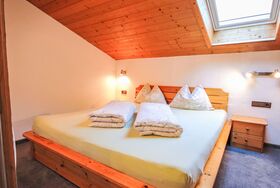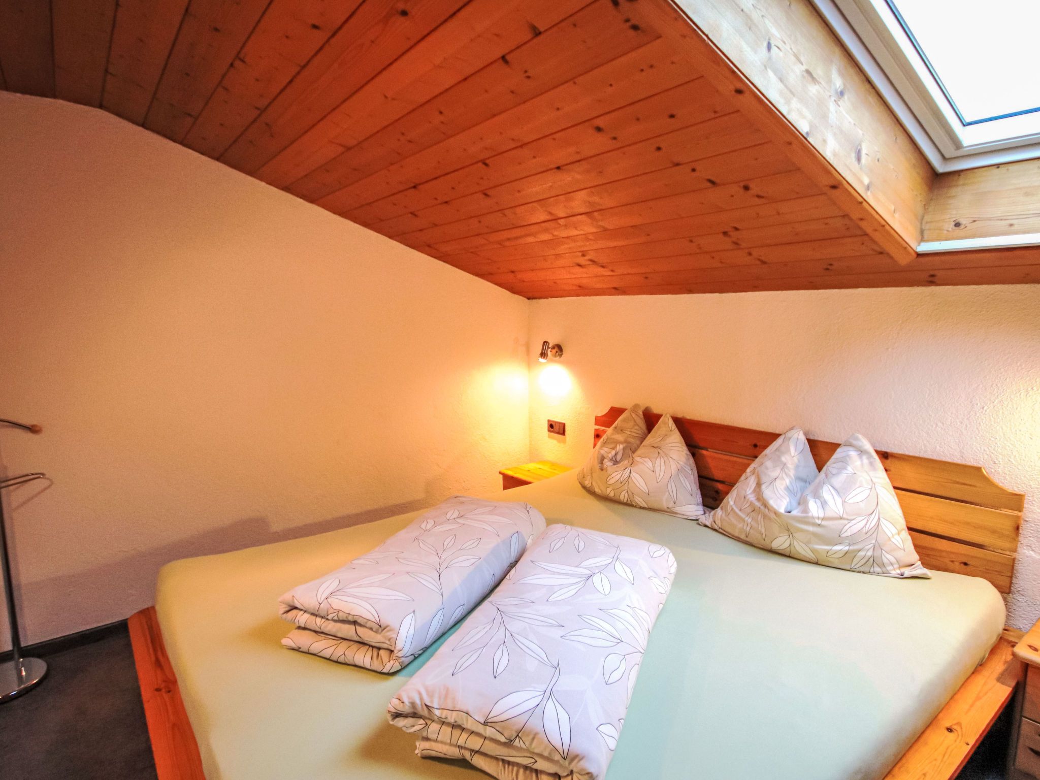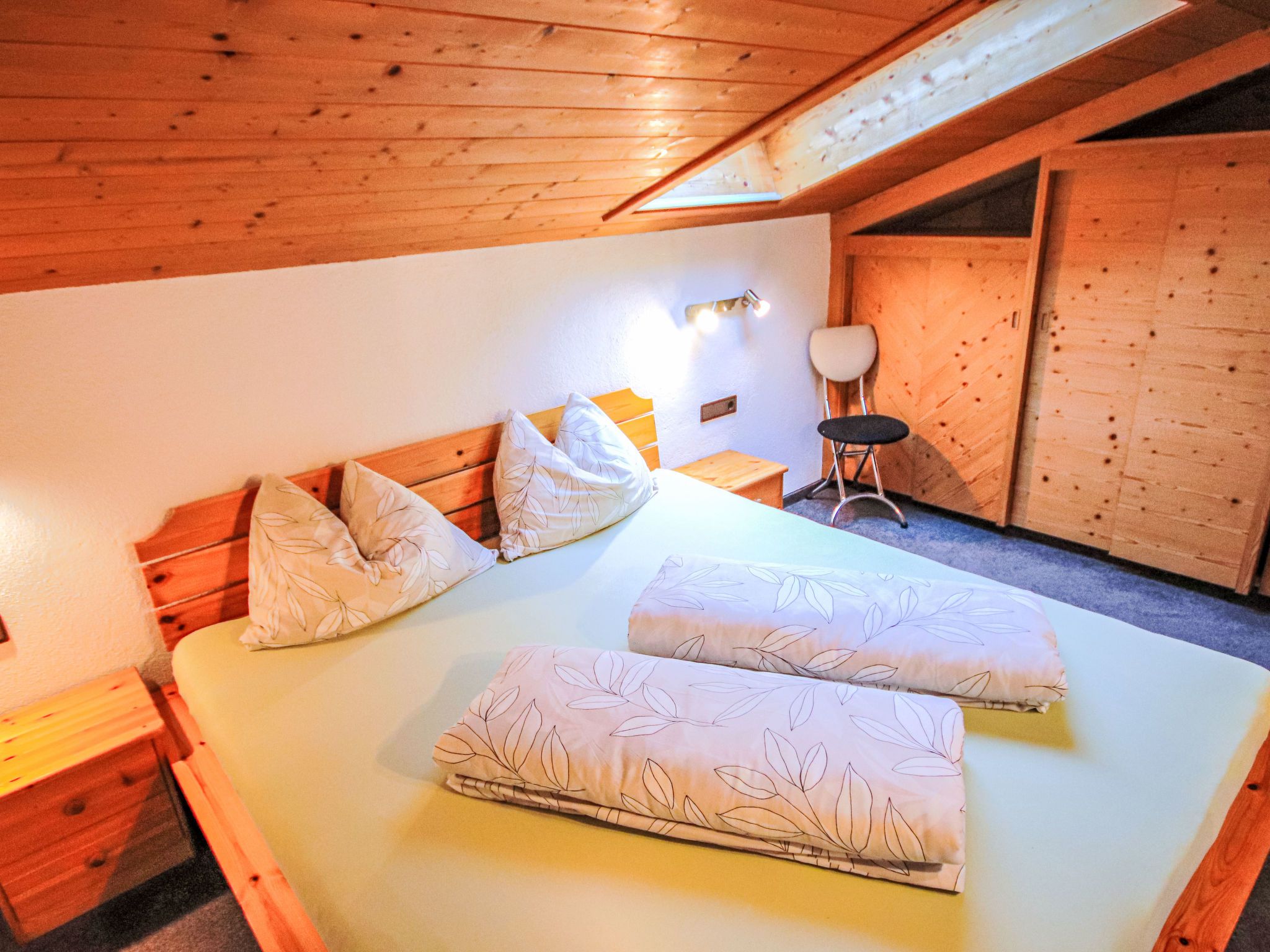4-Zimmer-Wohnung 65 m2, im Dachgeschoss. Abgeschrägt, geschmackvoll eingerichtet: Eingang. 1 Doppelzimmer. 1 kleines Zimmer mit 1 franz. Bett (140 cm). 1 kleines Zimmer mit 1 franz. Bett (160 cm). Grosses Wohnzimmer mit Sat-TV und Radio. Offene Küche (Backofen, Geschirrspüler, 4 Glaskeramikplatten, Mikrowelle) mit Esstisch. Bad/Dusche/WC. Abstellkammer. Sicht auf die Berge. Zur Verfügung: Internet (Wireless LAN, gratis). Bitte beachten: Nichtraucher-Unterkunft. Rauchmelder. Sehr niedrige Raumhöhe im Zimmer mit französischem Bett.