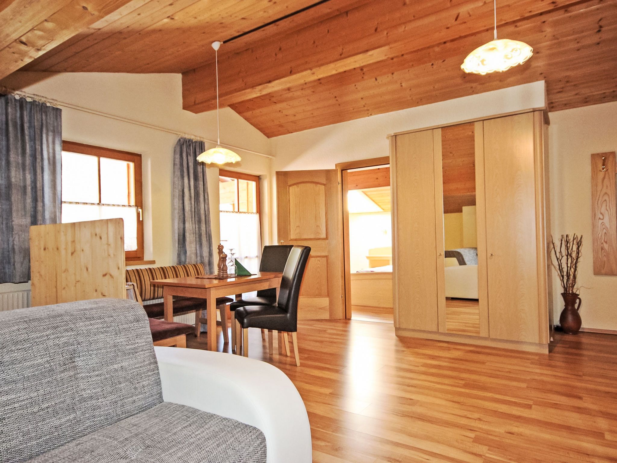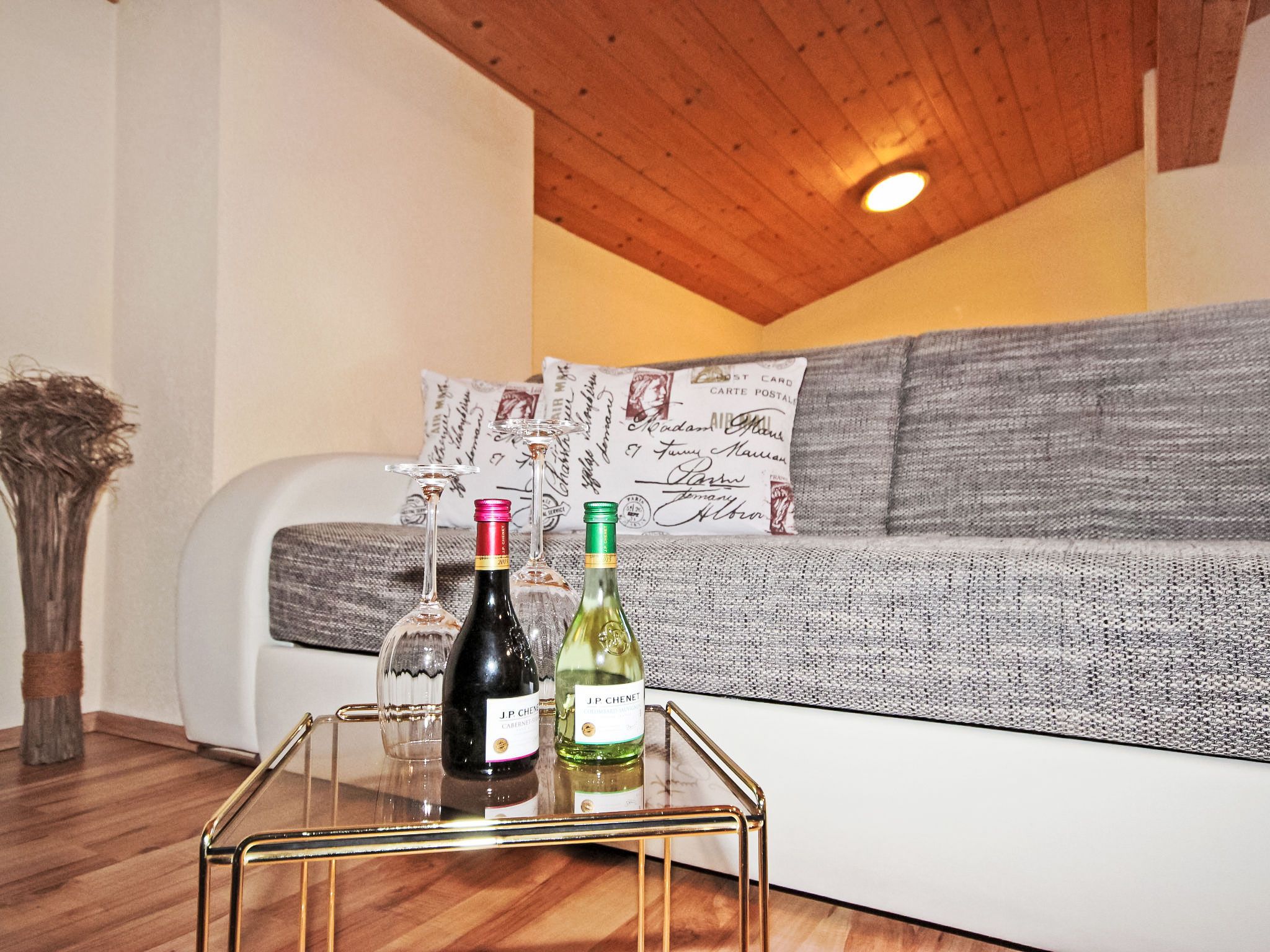2-Zimmer-Wohnung 60 m2 im 2. Stock. Teilweise abgeschrägt, gemütlich eingerichtet: Eingang. Grosses Wohn-/Schlafzimmer mit 1 Doppelbett, Essecke und Sat-TV (Flachbildschirm). Ausgang zum Balkon. 1 Doppelzimmer. Offene Küche (4 Kochplatten, Backofen, Mikrowelle, elektrische Kaffeemaschine). Dusche/WC. Balkon. Terrassenmöbel. Schöne Sicht auf die Berge. Zur Verfügung: Internet (Wireless LAN, gratis). Bitte beachten: Rauchmelder.