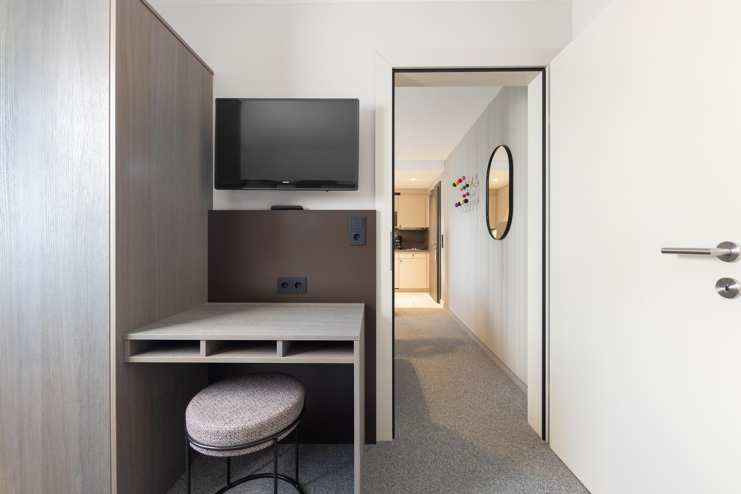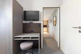 Appartement 10 mit ca. 30 m² im 2. Obergeschoss: kleiner Vorraum mit Küche (2-Platten-Herd, Mikrowelle, Spülmaschine, Filterkaffeemaschine, Teekocher, Toaster, Geschirr, Kochutensilien usw.); 1 Badezimmer mit Dusche/WC; 1 Schlafzimmer mit Doppelbett; Wohnraum mit Essplatz und 1 zusätzlichen Schlafmöglichkeit; Appartement ohne Balkon.
