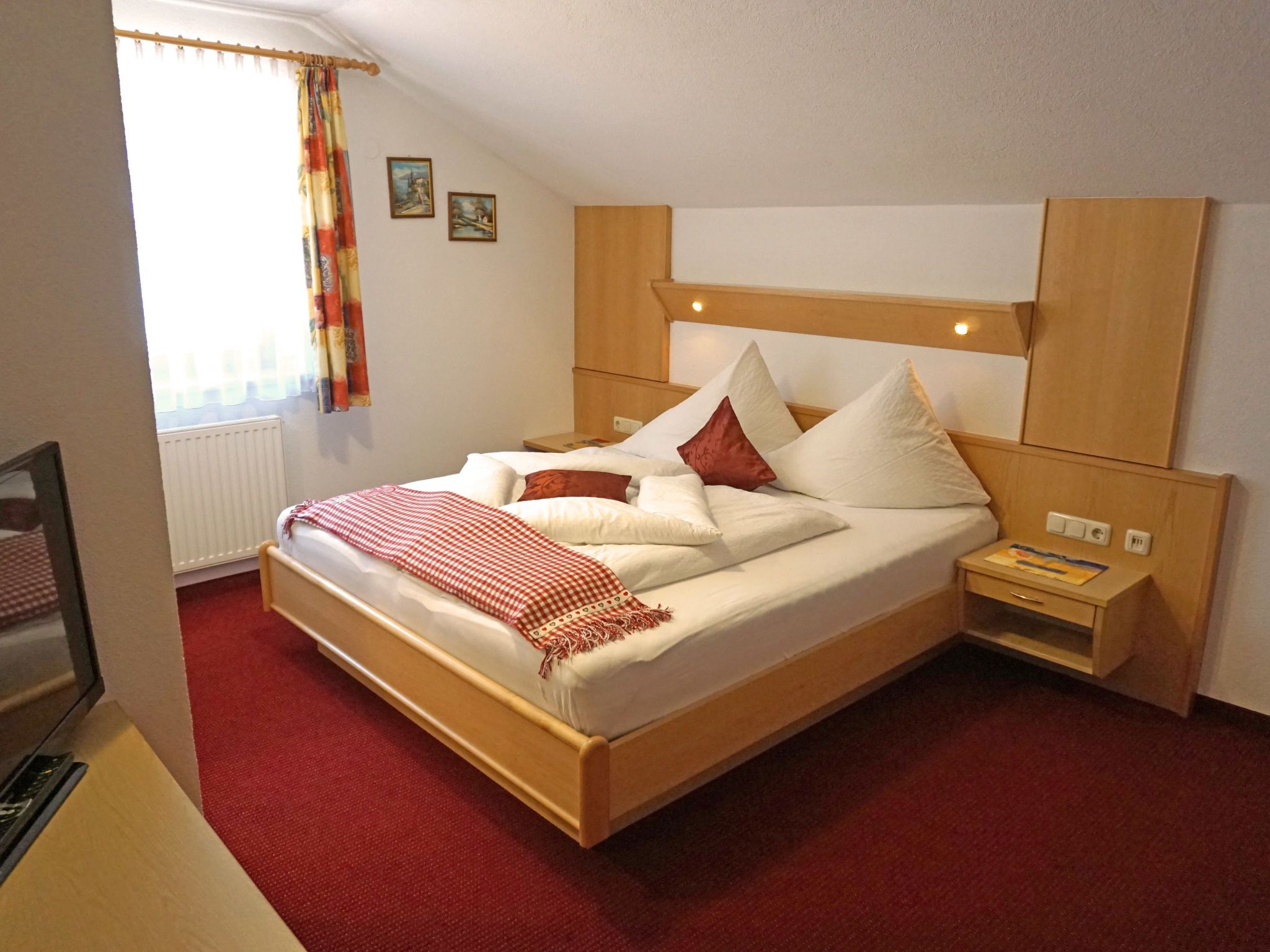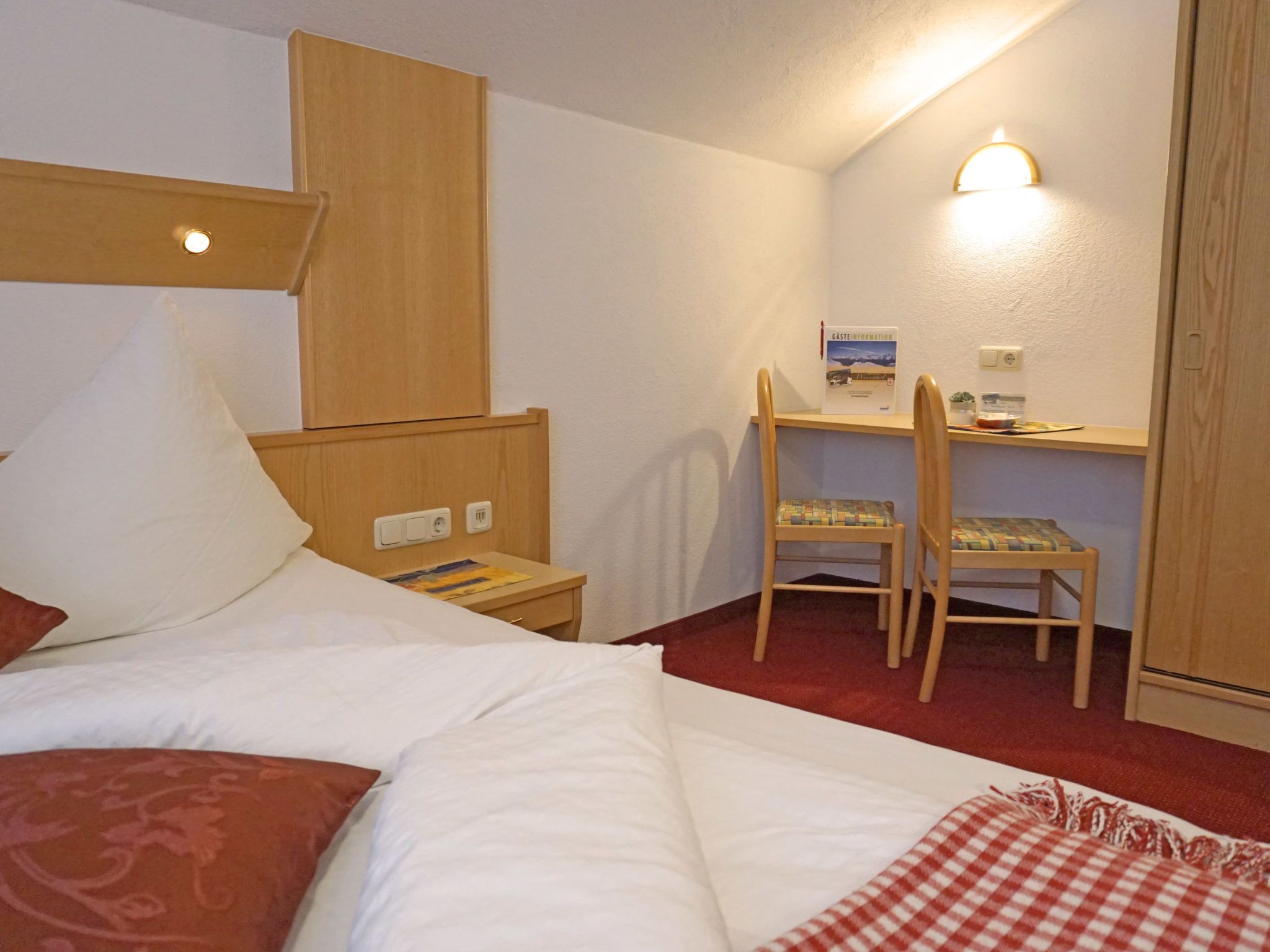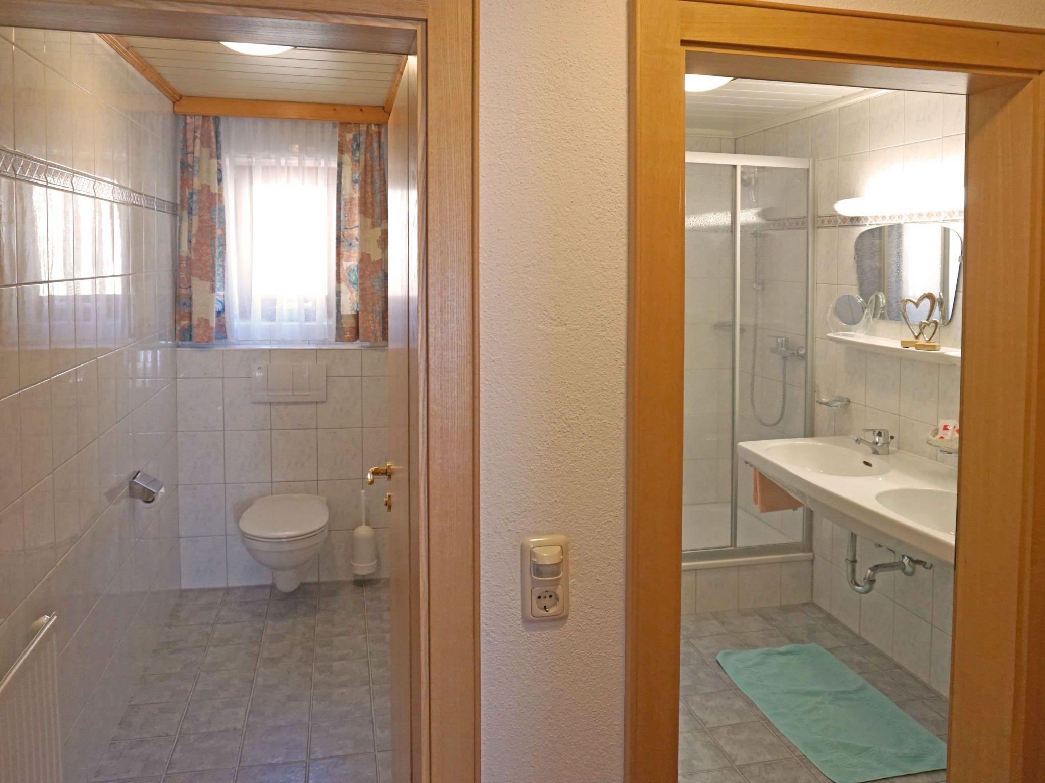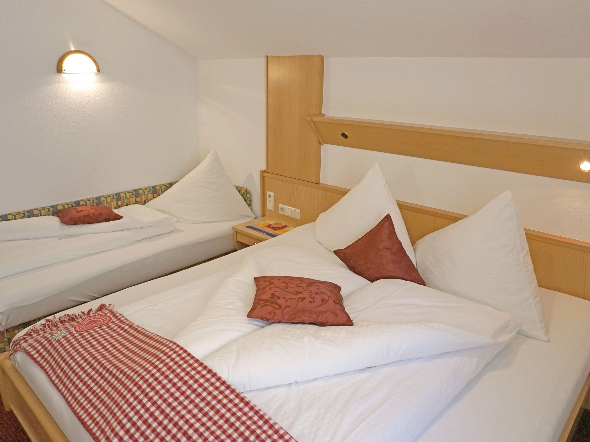 Apart 106 Wiesenhof, 3-Zimmer-Wohnung 65 m2 im 3. Stock. Modern und gemütlich eingerichtet: 1 Doppelzimmer mit Waschbecken und Dusche. 1 Zimmer mit 1 Bett und 1 Doppelbett. Küche (4 Kochplatten, Backofen, Geschirrspüler, Toaster, Wasserkocher, elektrische Kaffeemaschine) mit Essecke und Sat-TV (Flachbildschirm), Radio. Ausgang zum Balkon, Richtung Süden. Dusche, sep. WC, Doppelwaschbecken. Heizung. Balkonmöbel. Zur Verfügung: Safe, Haartrockner. Internet (Wireless LAN). Bitte beachten: Nichtraucher-Unterkunft. Kein Fahrstuhl. Keine Haustiere erlaubt.