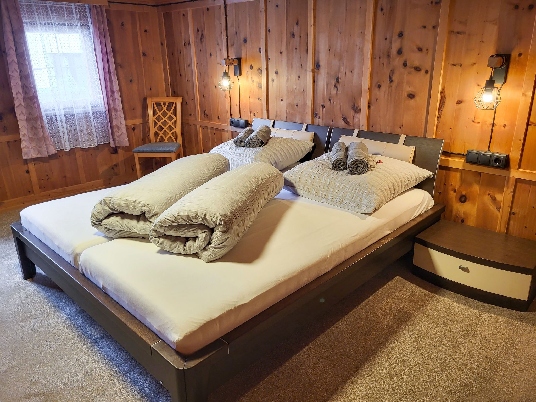 6-Zimmer-Bauernhaus 200 m2 auf 2 Stockwerken. Renoviert im Jahre 2022, gemütlich und mit viel Holz eingerichtet: 2 Doppelzimmer. 2 Zimmer, jedes Zimmer mit 2 Betten (90 cm, Länge 200 cm), 1 Doppelbett. Dusche/WC. Unteres Geschoss: 1 Doppelzimmer. Esszimmer mit Kabel-TV (Flachbildschirm). Küche (Backofen, Geschirrspüler, 4 Glaskeramikplatten, Toaster, Wasserkocher, Mikrowelle, Tiefkühler, elektrische Kaffeemaschine). Dusche/WC. Holzdielenboden. Komfortable Einrichtung im Landhausstil. Schöne Panoramasicht. Zur Verfügung: Internet (Wireless LAN, gratis). Bitte beachten: Nichtraucher-Haus. Bei Belegung mit weniger Personen als der maximalen Personenzahl stehen nicht alle Schlafzimmer zur Verfügung.