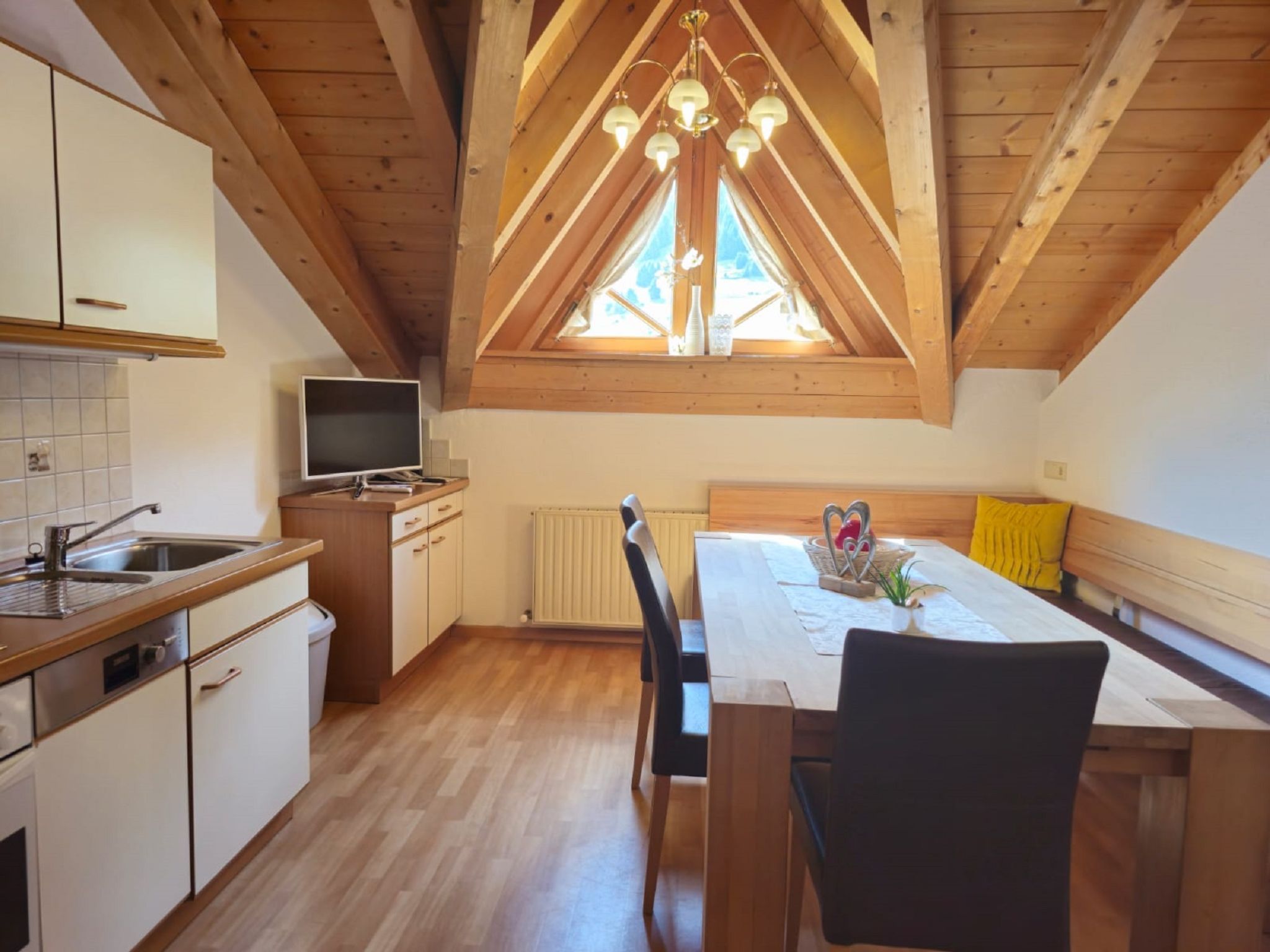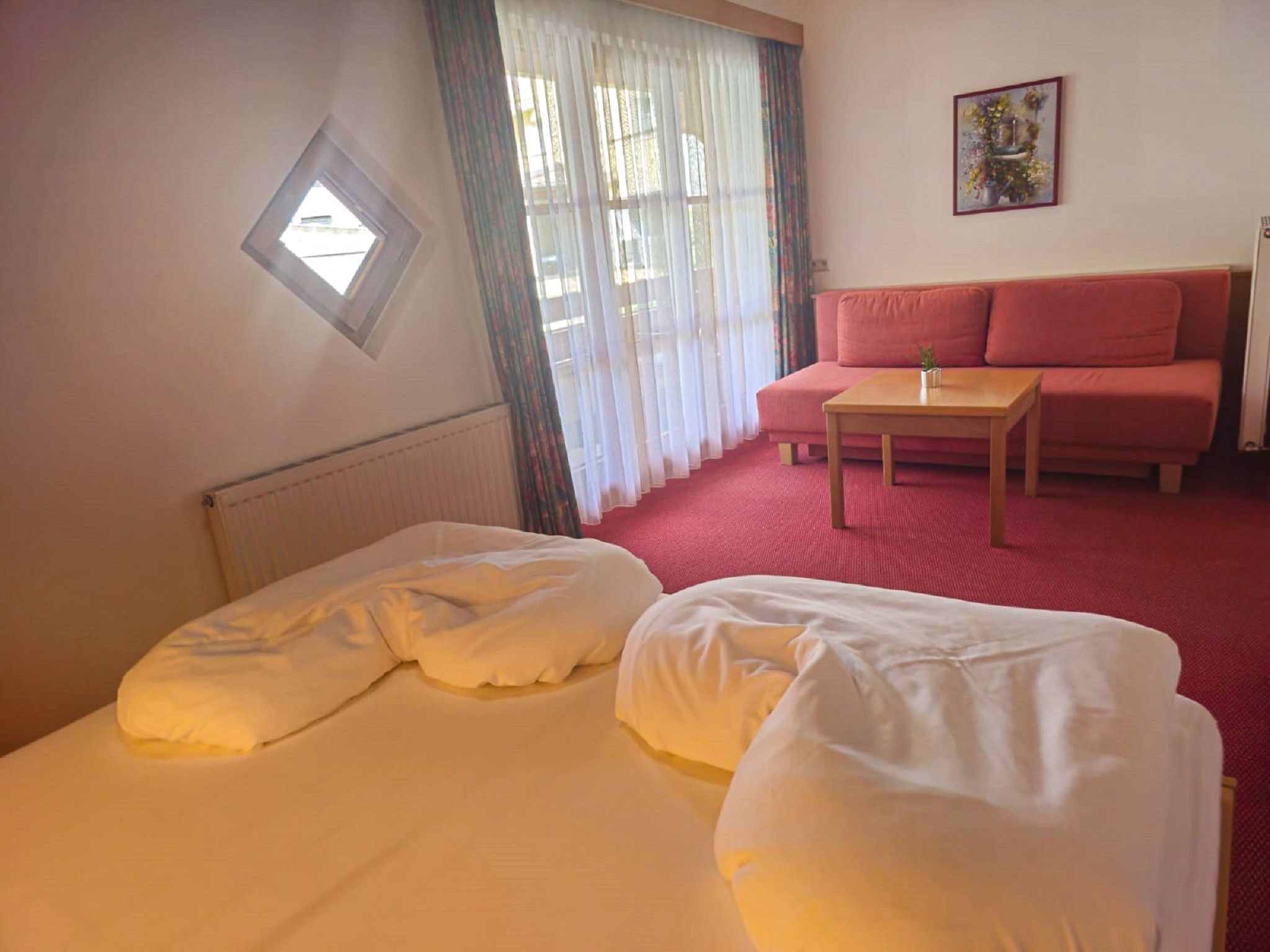 Top 3, 3-Zimmer-Wohnung 60 m2 im 3. Stock. Geräumig, komfortabel und gemütlich eingerichtet: Wohn-/Schlafzimmer mit 1 Doppelbett und Sat-TV (Flachbildschirm). Ausgang zum Balkon. 1 Doppelzimmer. Wohnküche (4 Kochplatten, Backofen, Geschirrspüler, Wasserkocher, elektrische Kaffeemaschine) mit Essecke und Sat-TV (Flachbildschirm). Dusche, sep. WC, Doppelwaschbecken. Heizung. Parkettboden, Teppichboden. Balkonmöbel. Zur Verfügung: Haartrockner. Bitte beachten: Nichtraucher-Unterkunft.